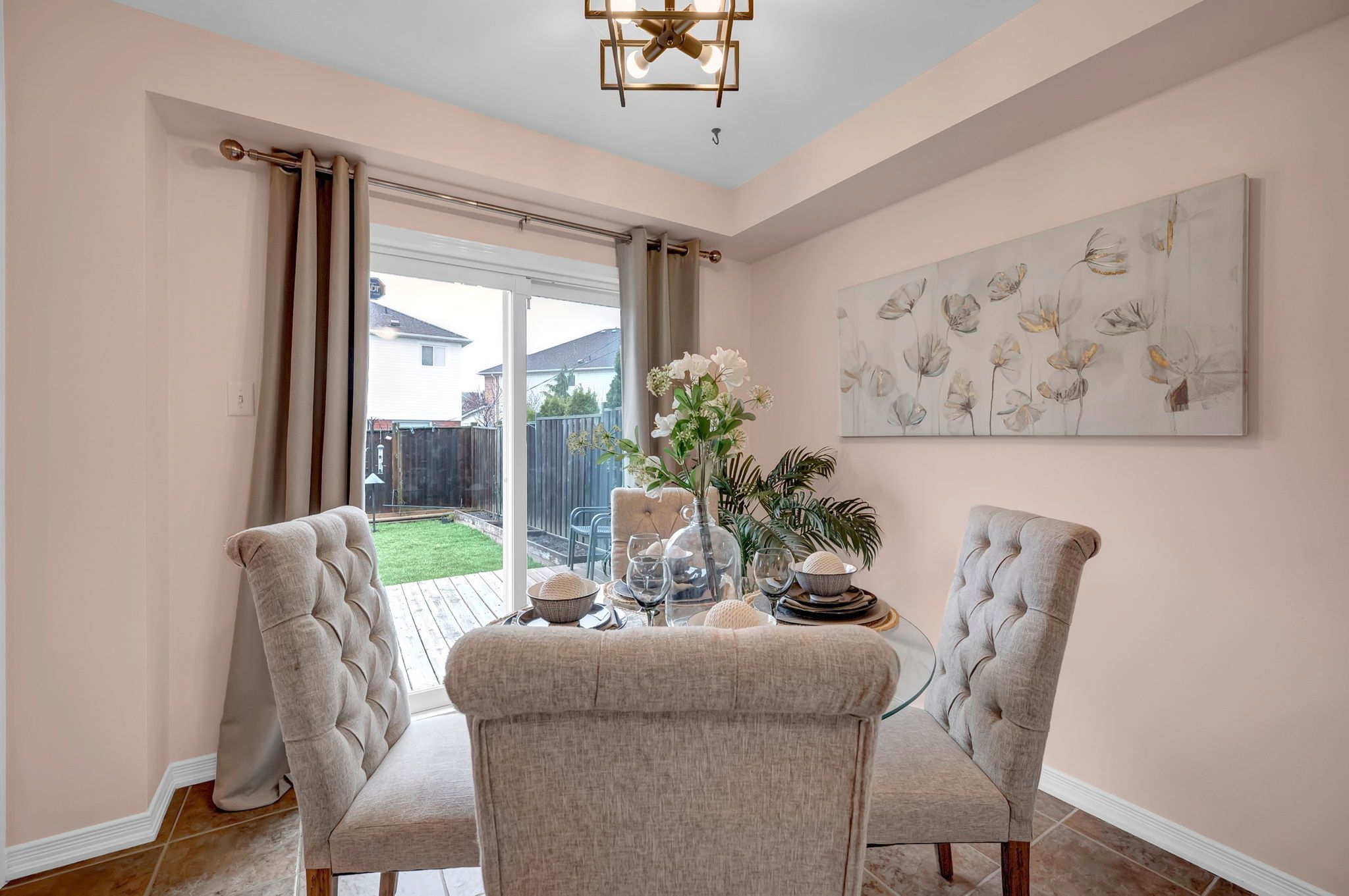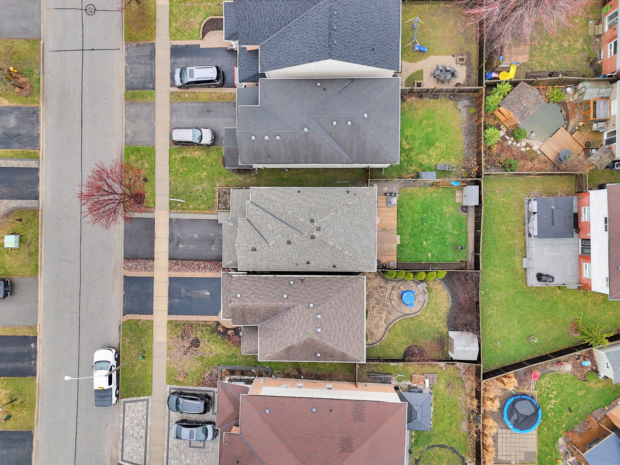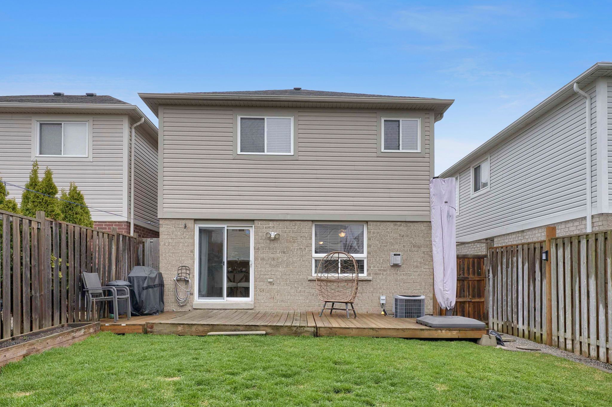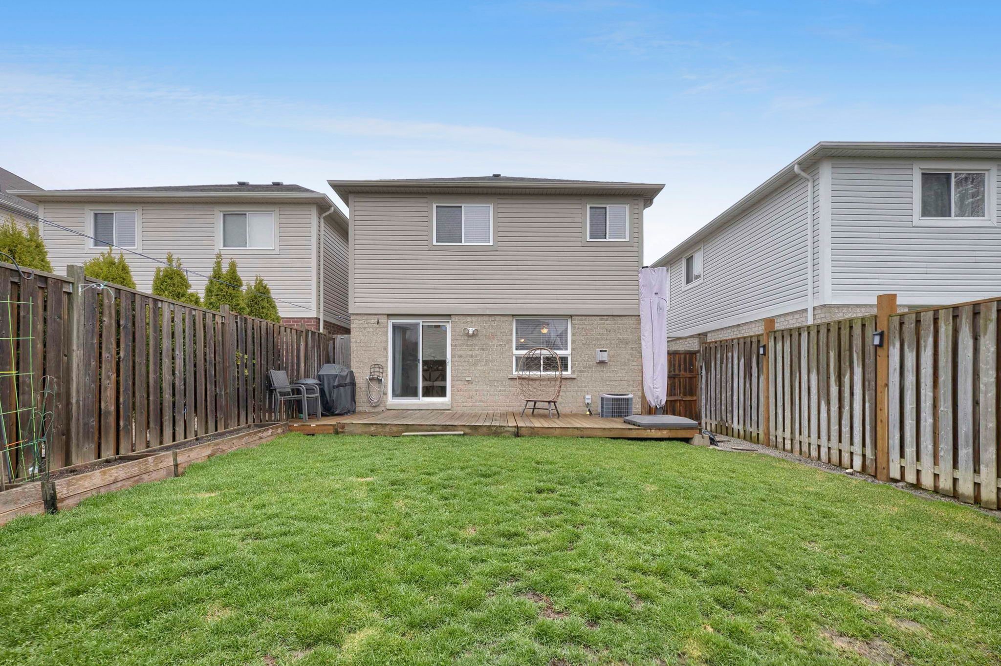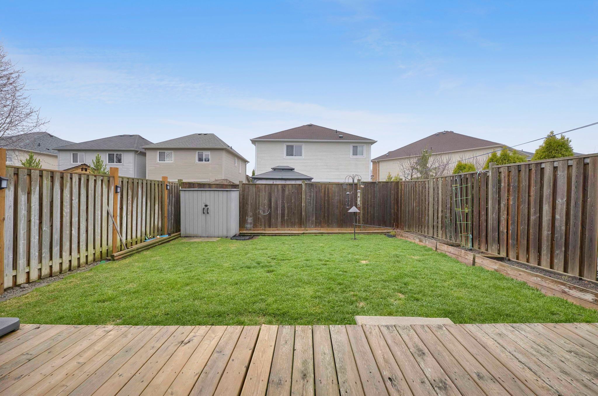 • Fully fenced backyard with a large deck and garden beds.