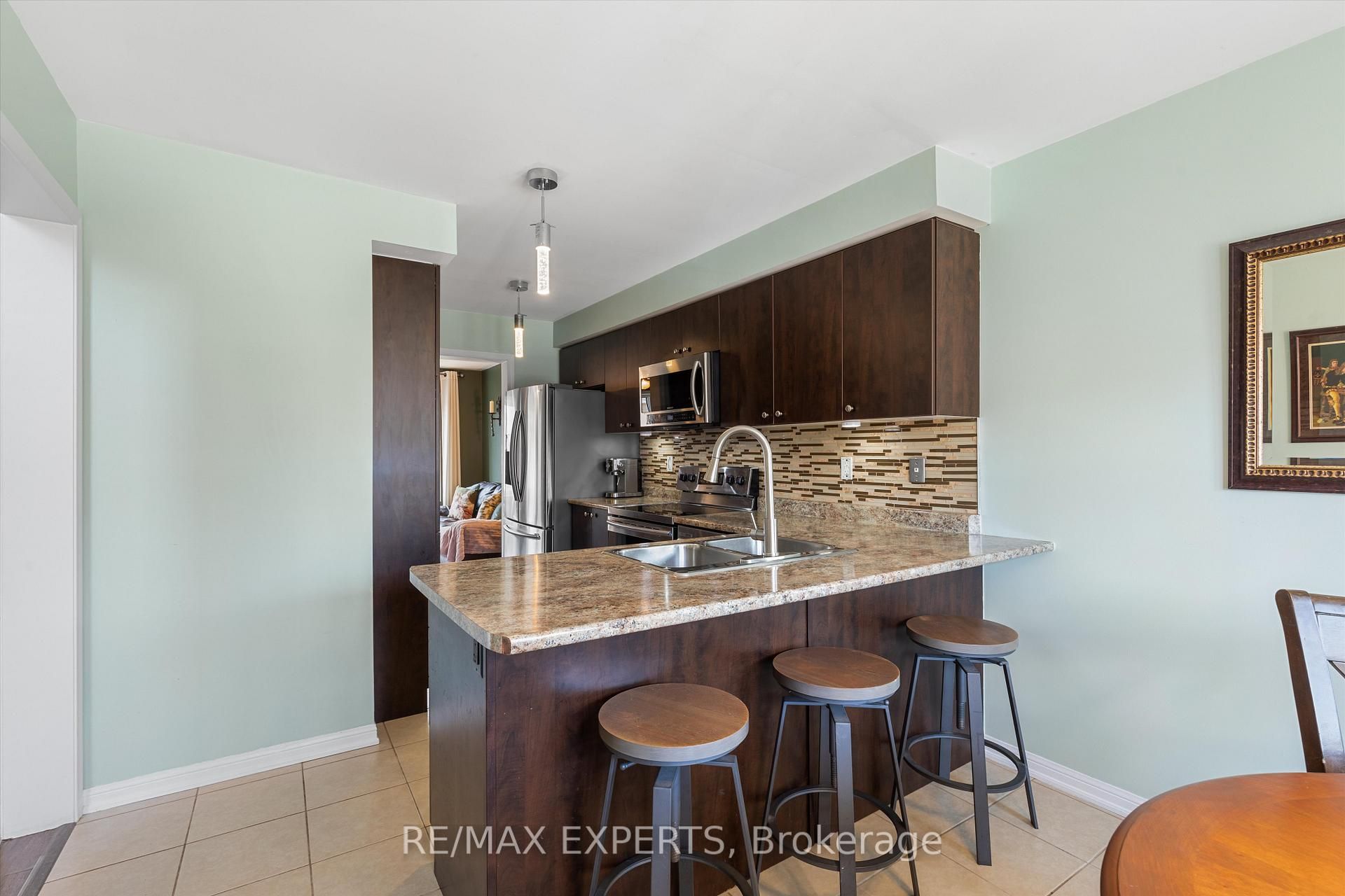 • Functional kitchen with stainless steel appliances and breakfast bar.