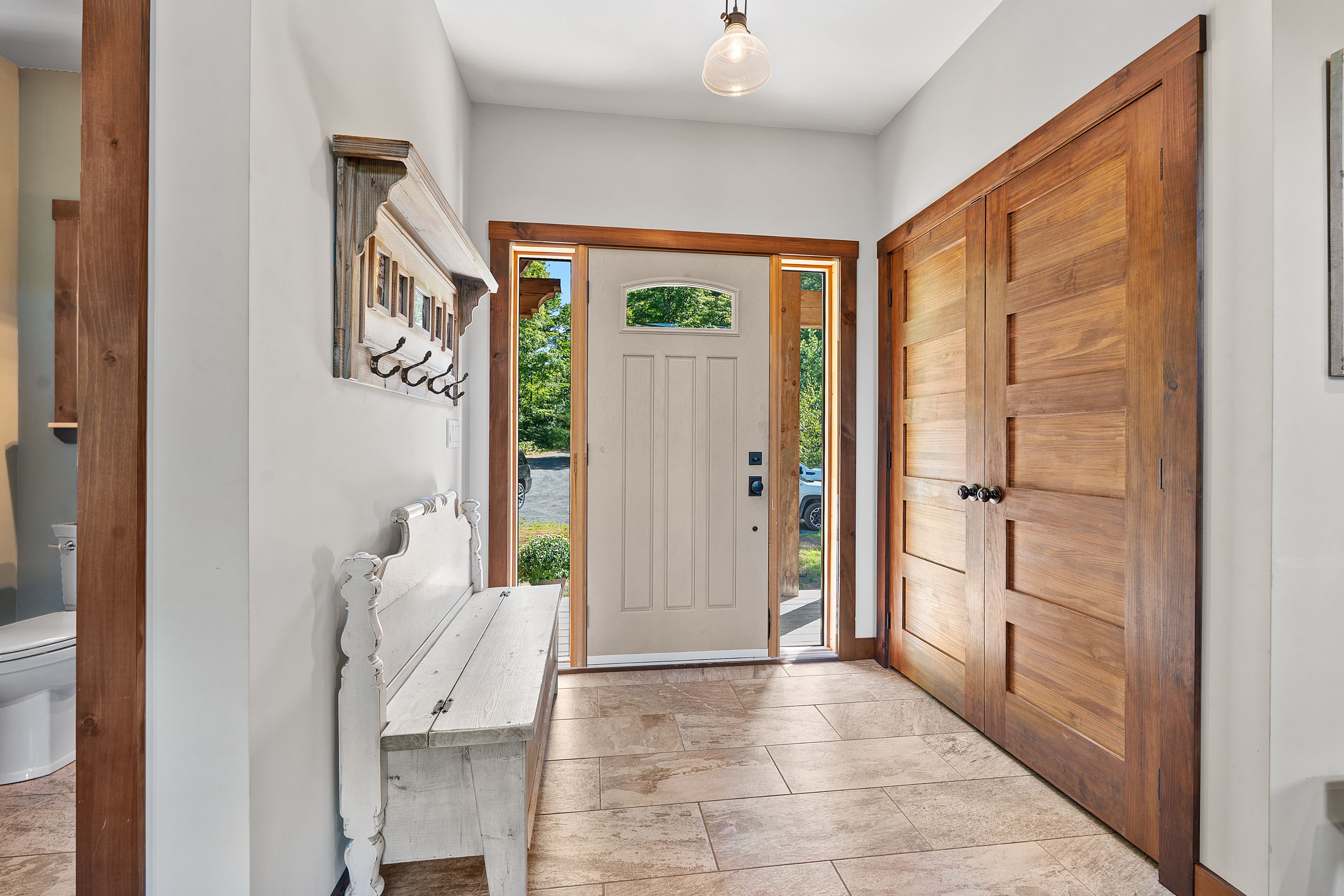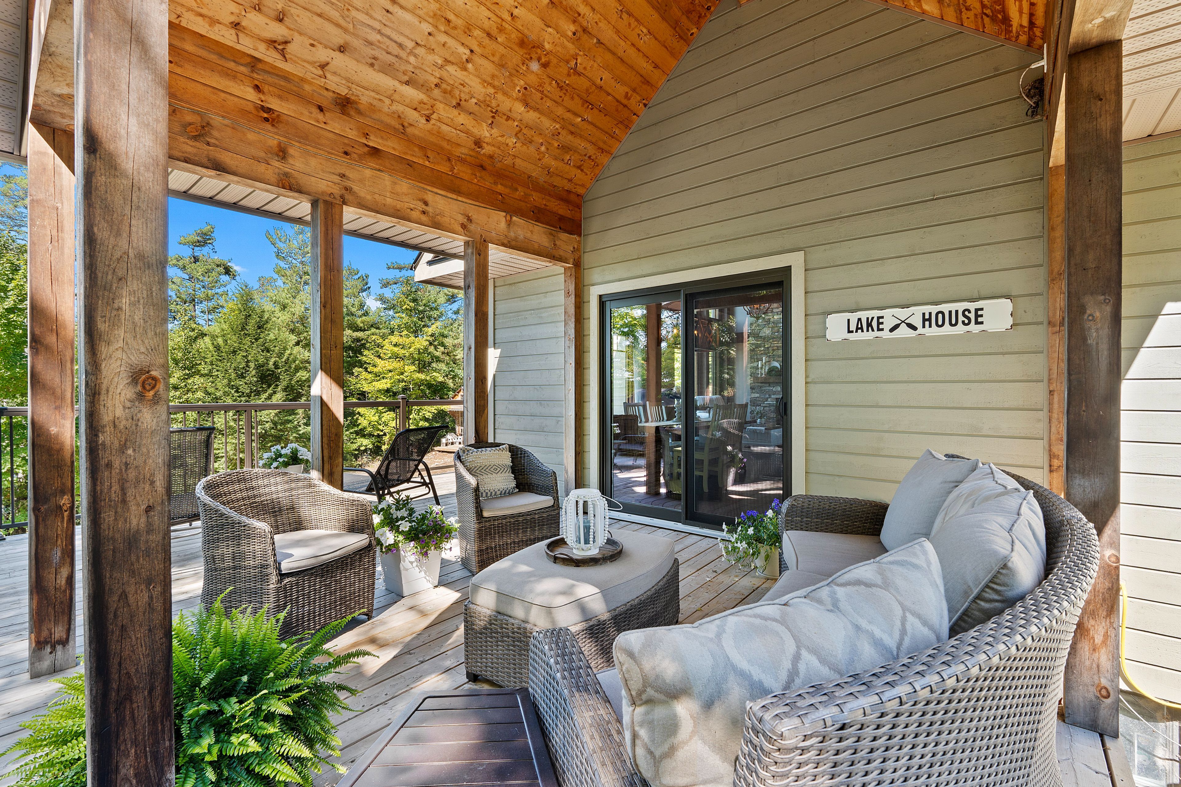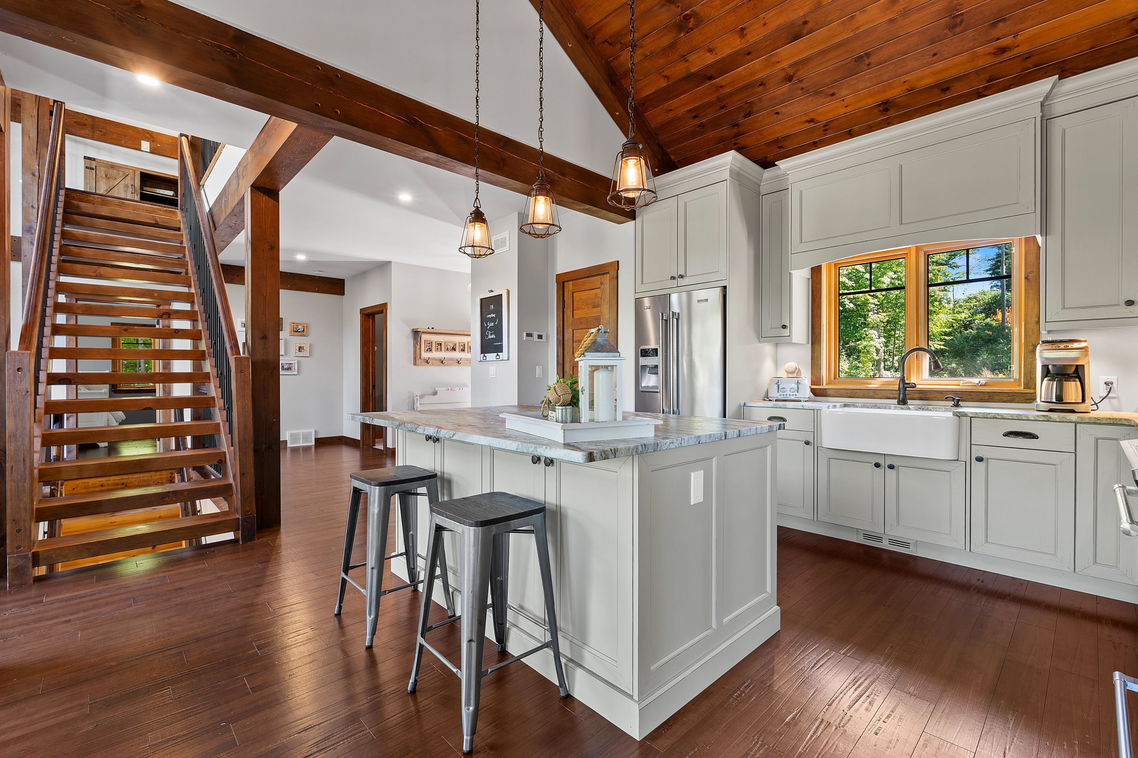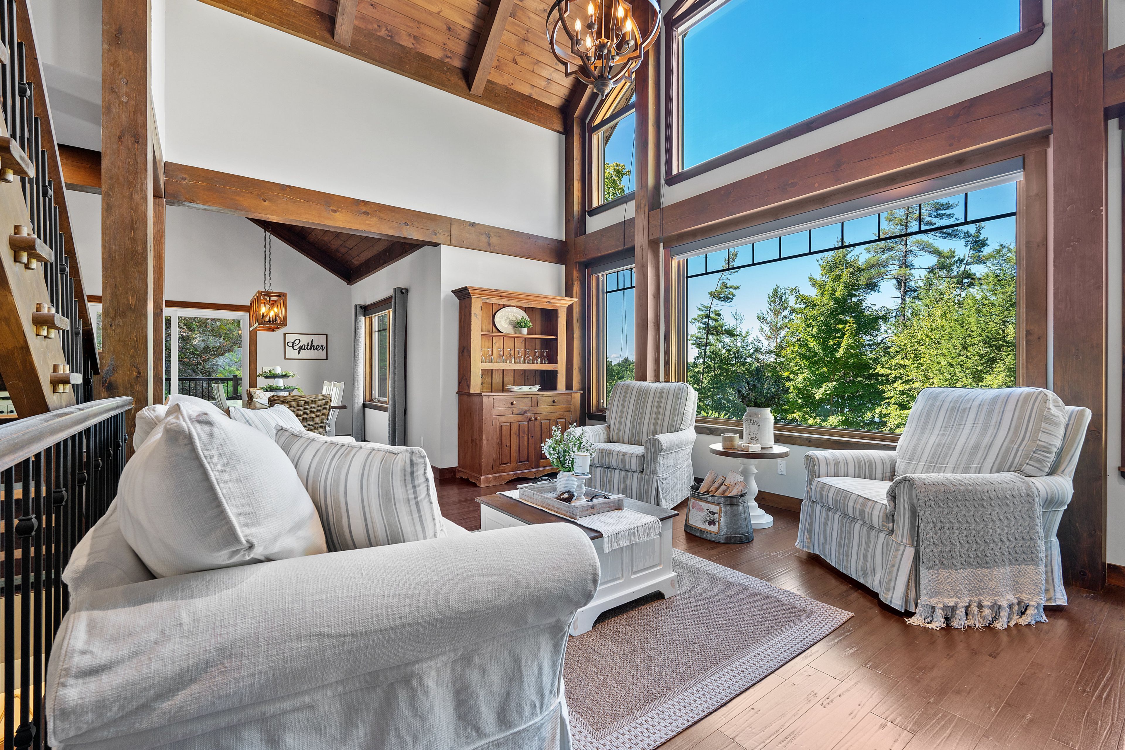 Welcome to this gorgeous timberframe waterfront retreat in seeleys bay, custom built in 2017. Tucked into a peaceful, 3+ acre country setting located directly on the rideau canal, this two storey discovery dream home blends classic character with elevated finishes, beginning with soaring tongue and groove cathedral ceilings that crown the light filled main living area. Warm natural wood, expansive windows, and an airy, open concept create an inviting backdrop for everyday life and effortless entertaining. At the heart of the home is a magazine worthy kitchen by hickory lane kitchen. Custom cabinetry provides exceptional storage and organization, while leathered granite countertops bring texture, durability, and understated luxury. A generous prep and serving area invites family and friends to gather, and the seamless flow to the dining and living spaces keeps the conversation going from breakfast to late night board games. Thoughtful design continues throughout with flexible main floor spaces that adapt to your lifestyle ideal for a home office, playroom, or quiet guest room. Upstairs, the cape cod charm continues with dormer accents and a lofted feel, offering a bedroom and a bright landing that can double as a reading nook or creative studio. Every detail reflects quality craftsmanship and a focus on comfort, from the solid finishes to the practical storage solutions you'll appreciate daily. Outdoors, enjoy tranquil views and room to relax, garden, fish, swim and entertain whether you're hosting summer barbecues or unwinding with a coffee on a crisp morning. Boat through the channel into whitefish, minutes from marinas, parks and recreation on the rideau. Convenient, easy commute to kingston and gananoque. Move in ready and impeccably maintained, this home delivers the best of waterfront country living: character without compromise in a setting that feels like home the moment you arrive. Discover your next chapter in a home that's as functional as it is beautiful.