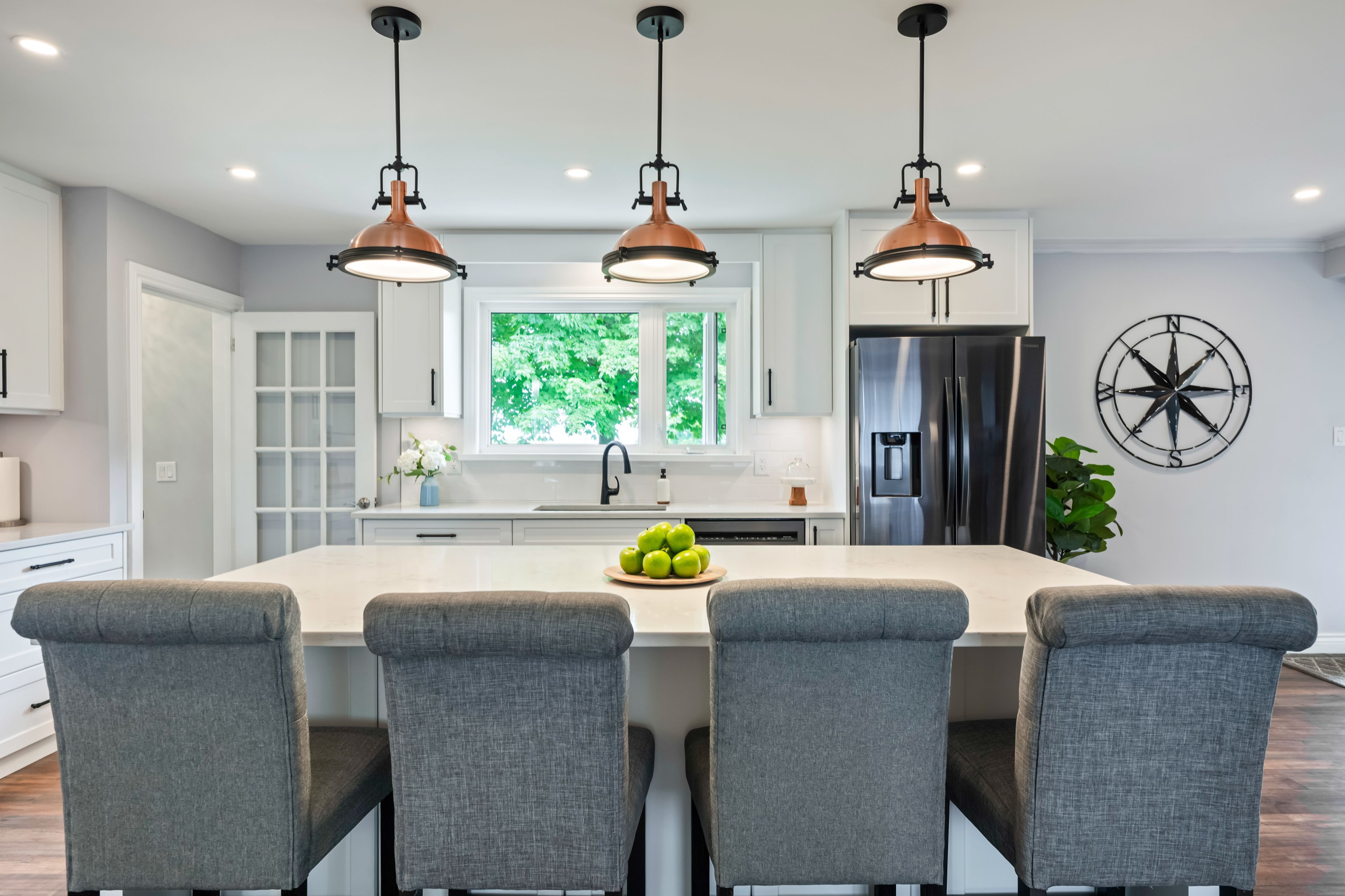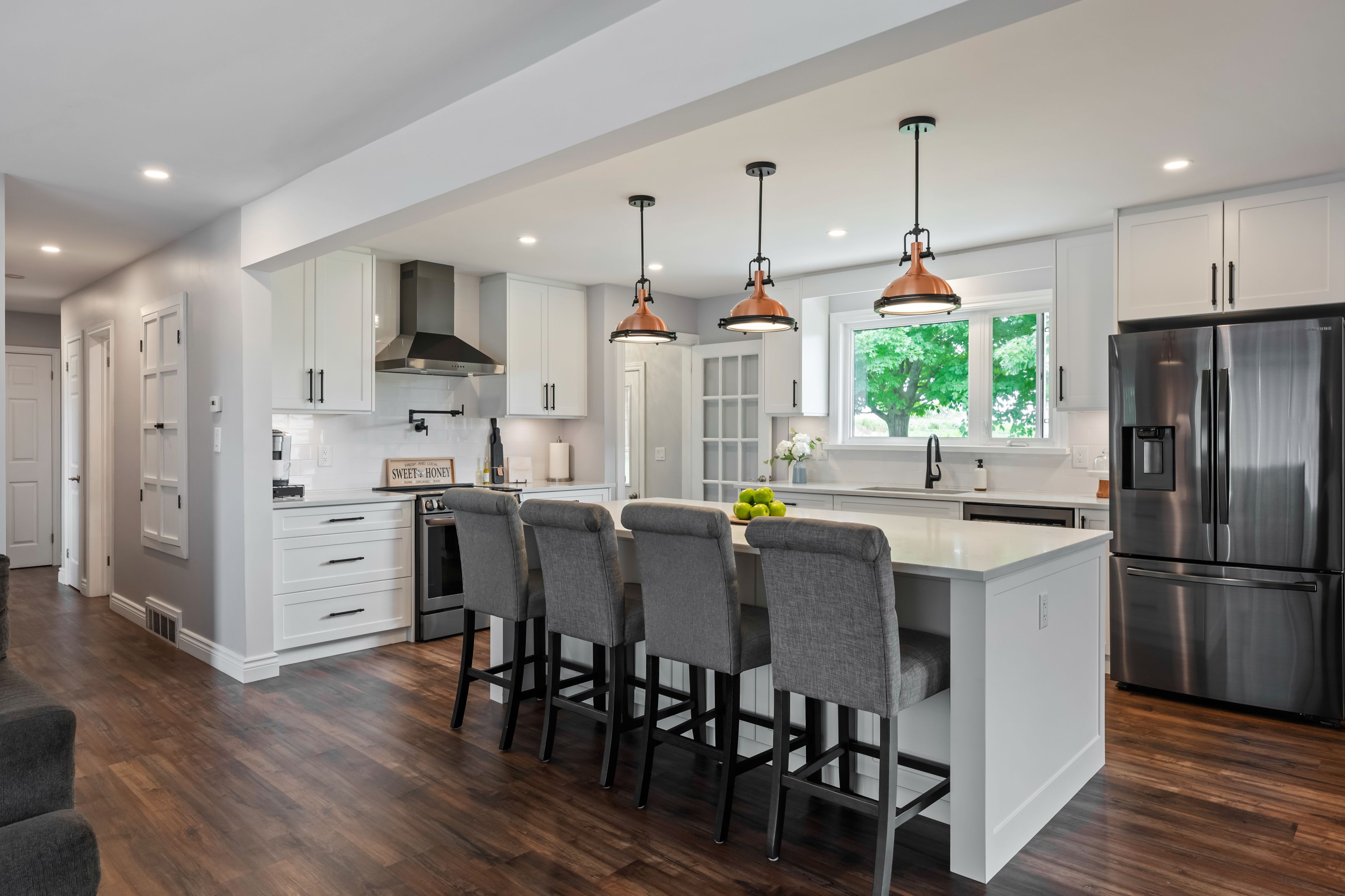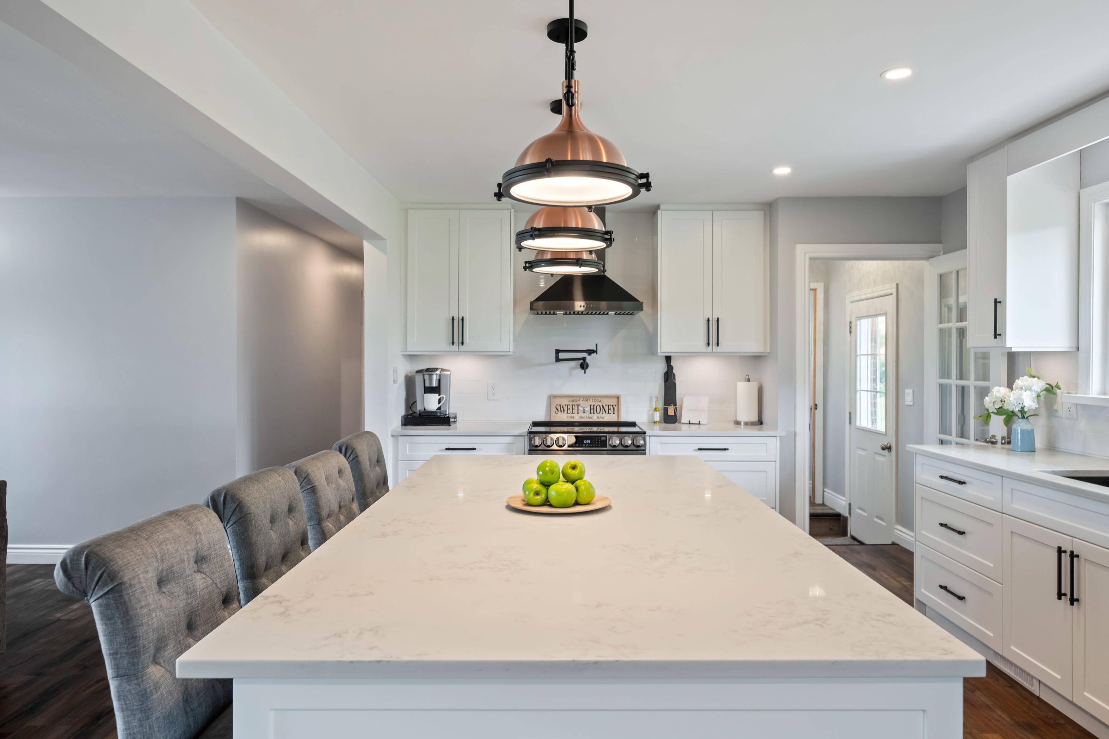 • Modern kitchen with a large quartz island and new stainless steel appliances.