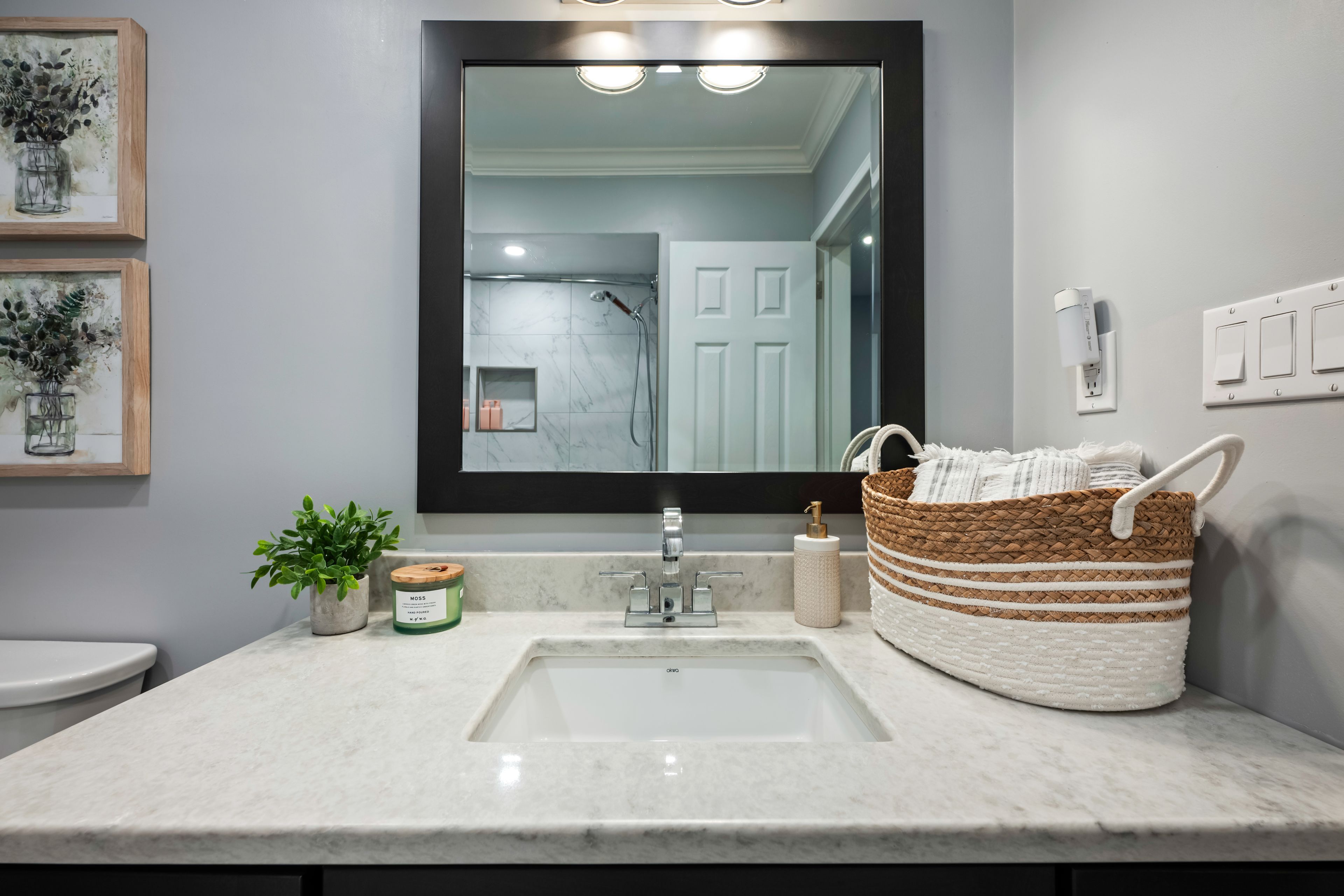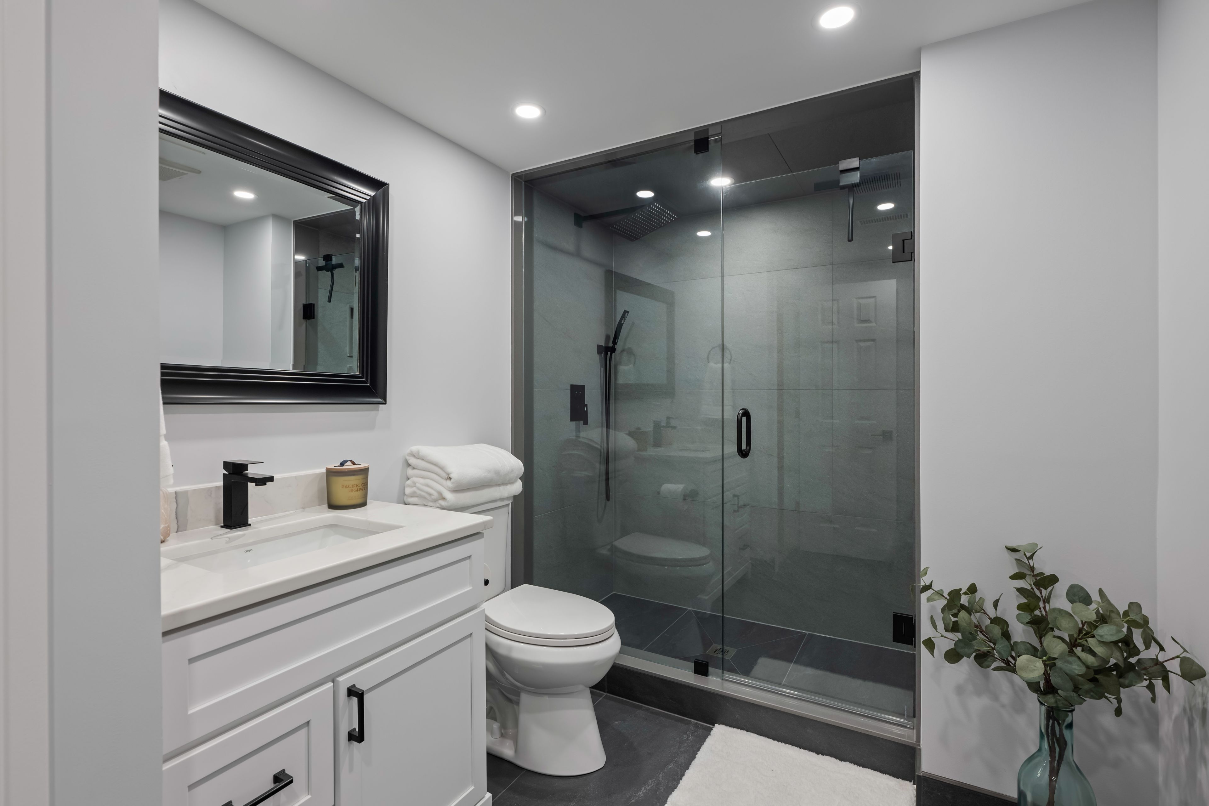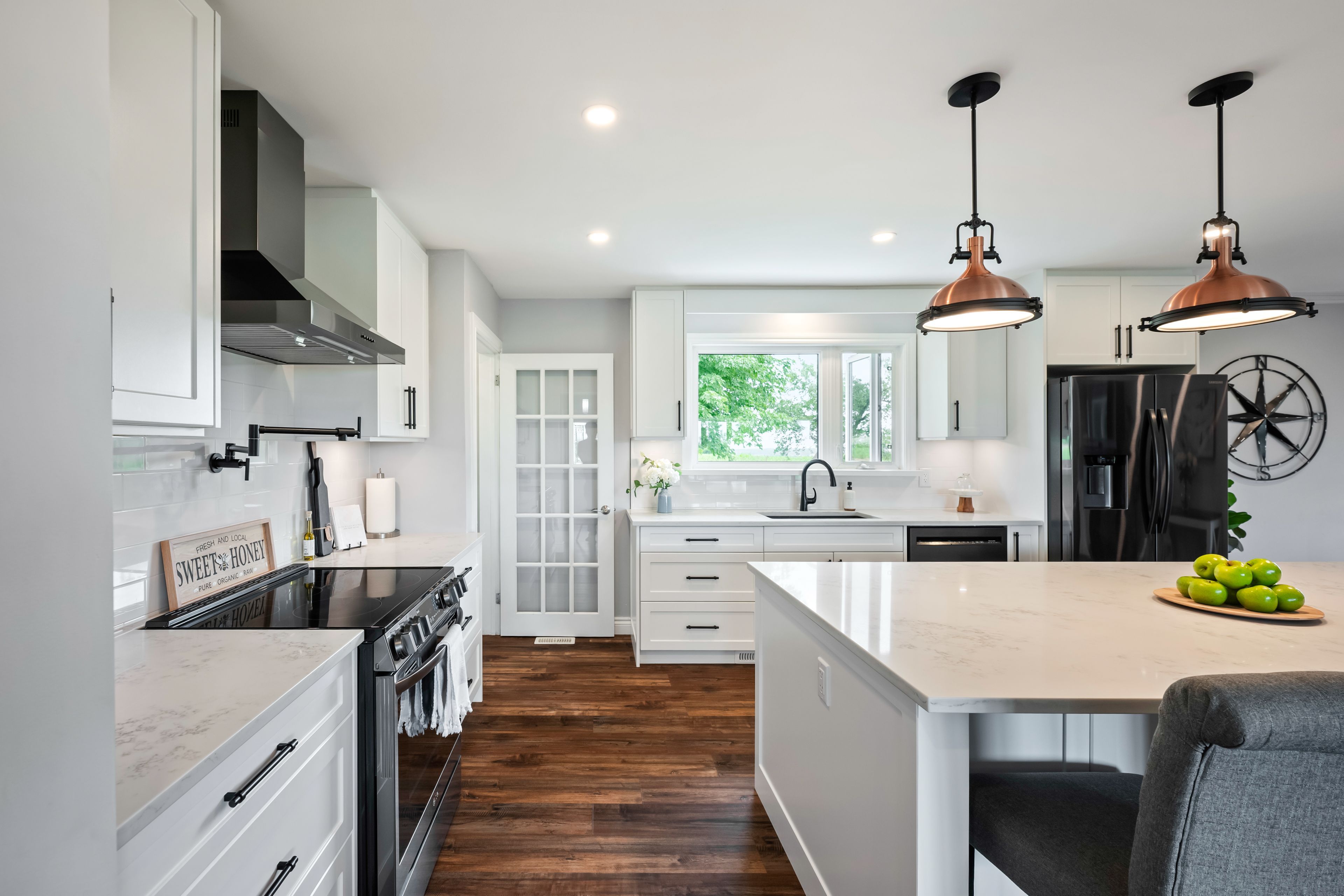 • Modern kitchen with a large quartz island and new stainless steel appliances.
