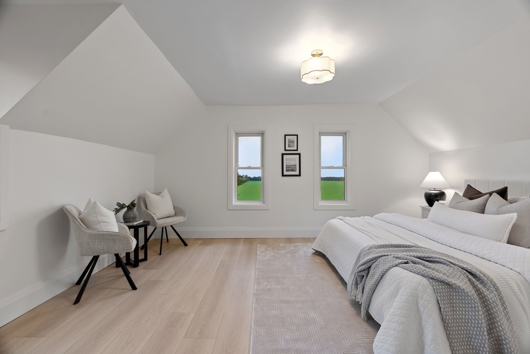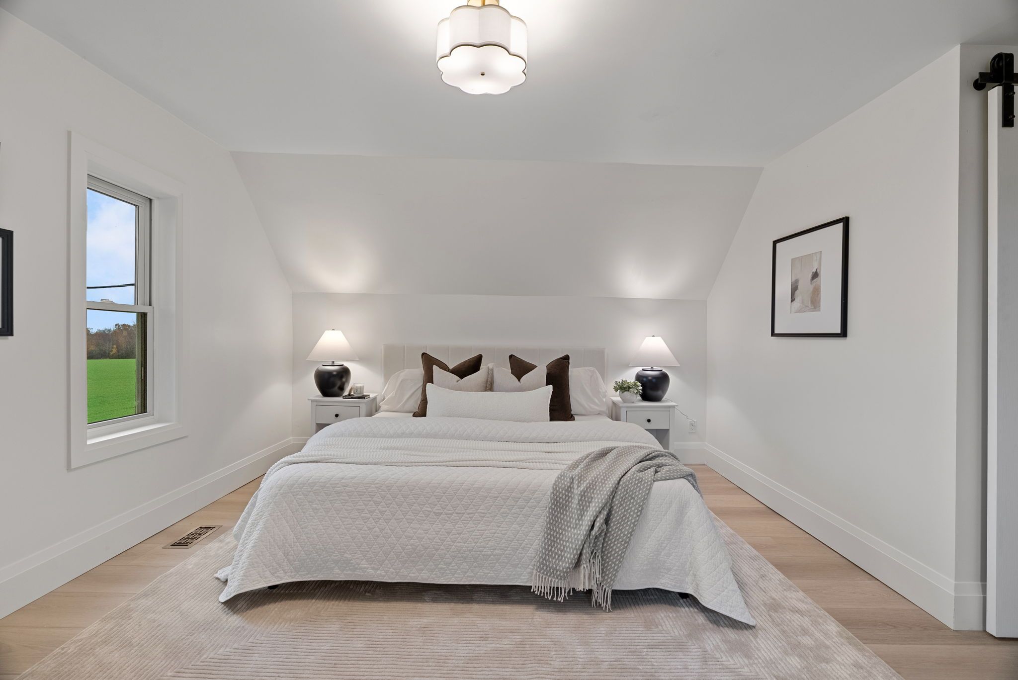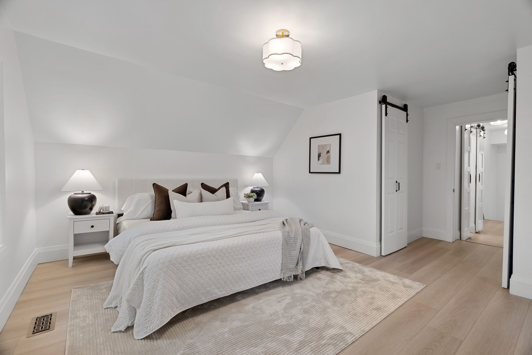 • Airy primary bedroom with enough space for a king bed and sitting area.