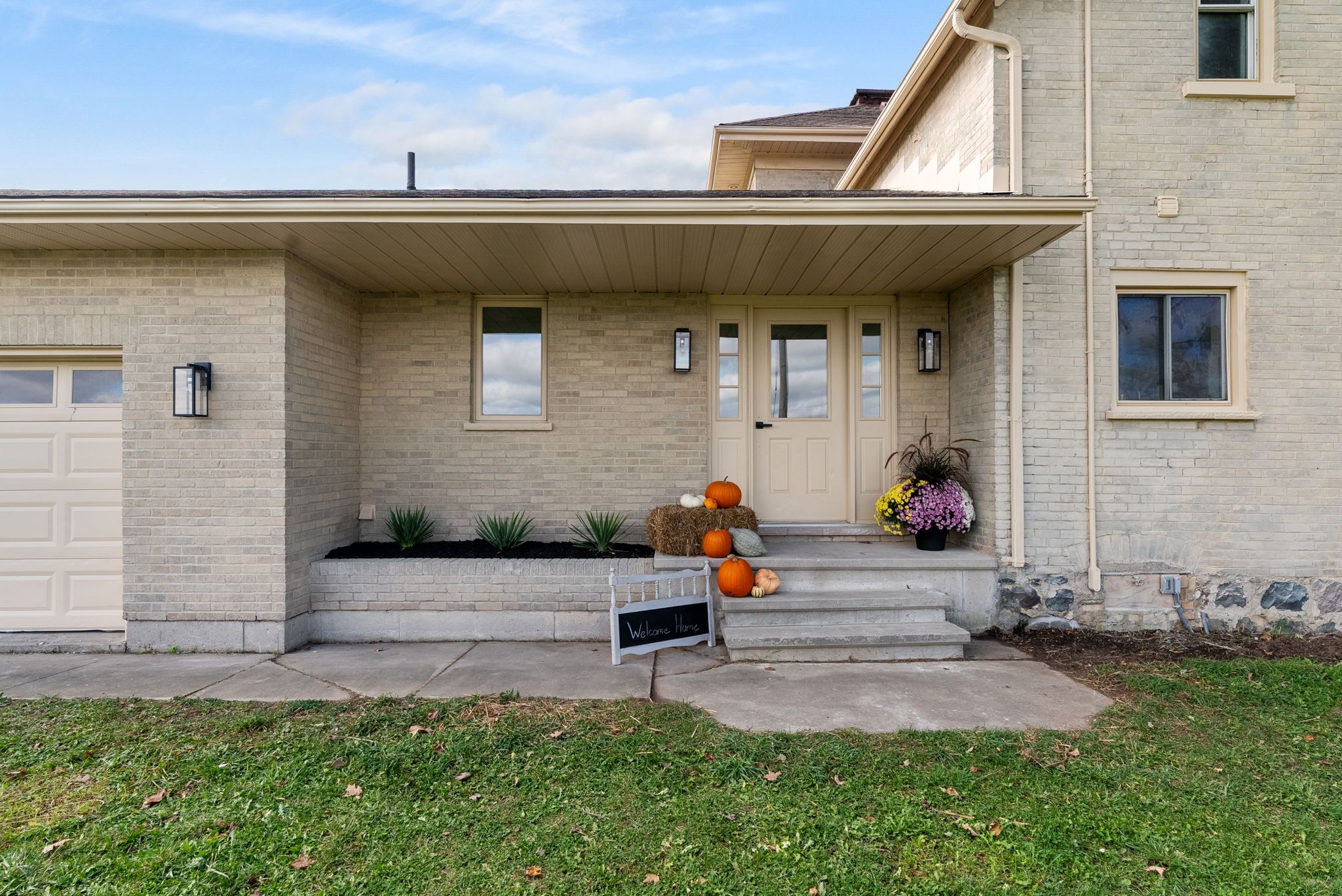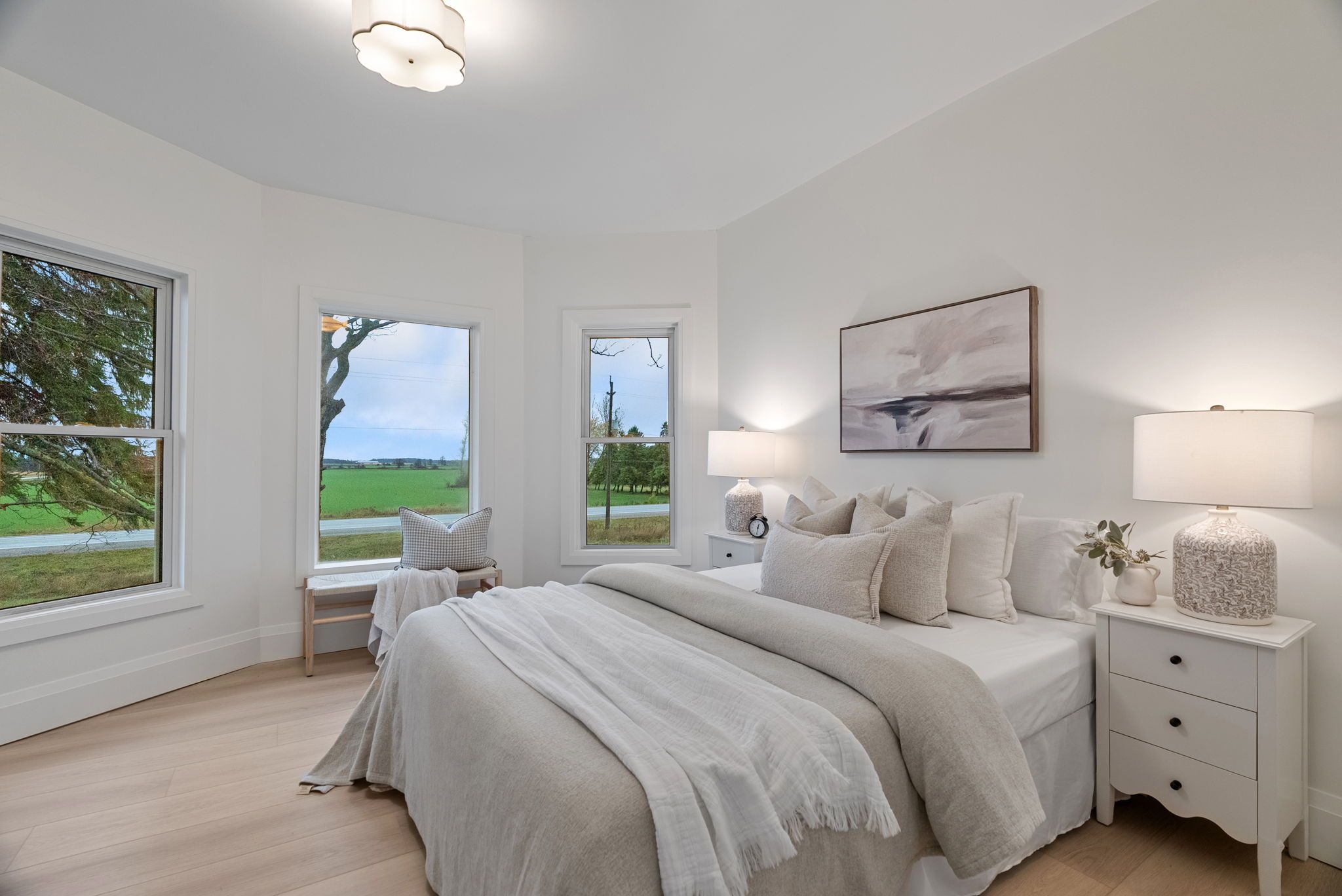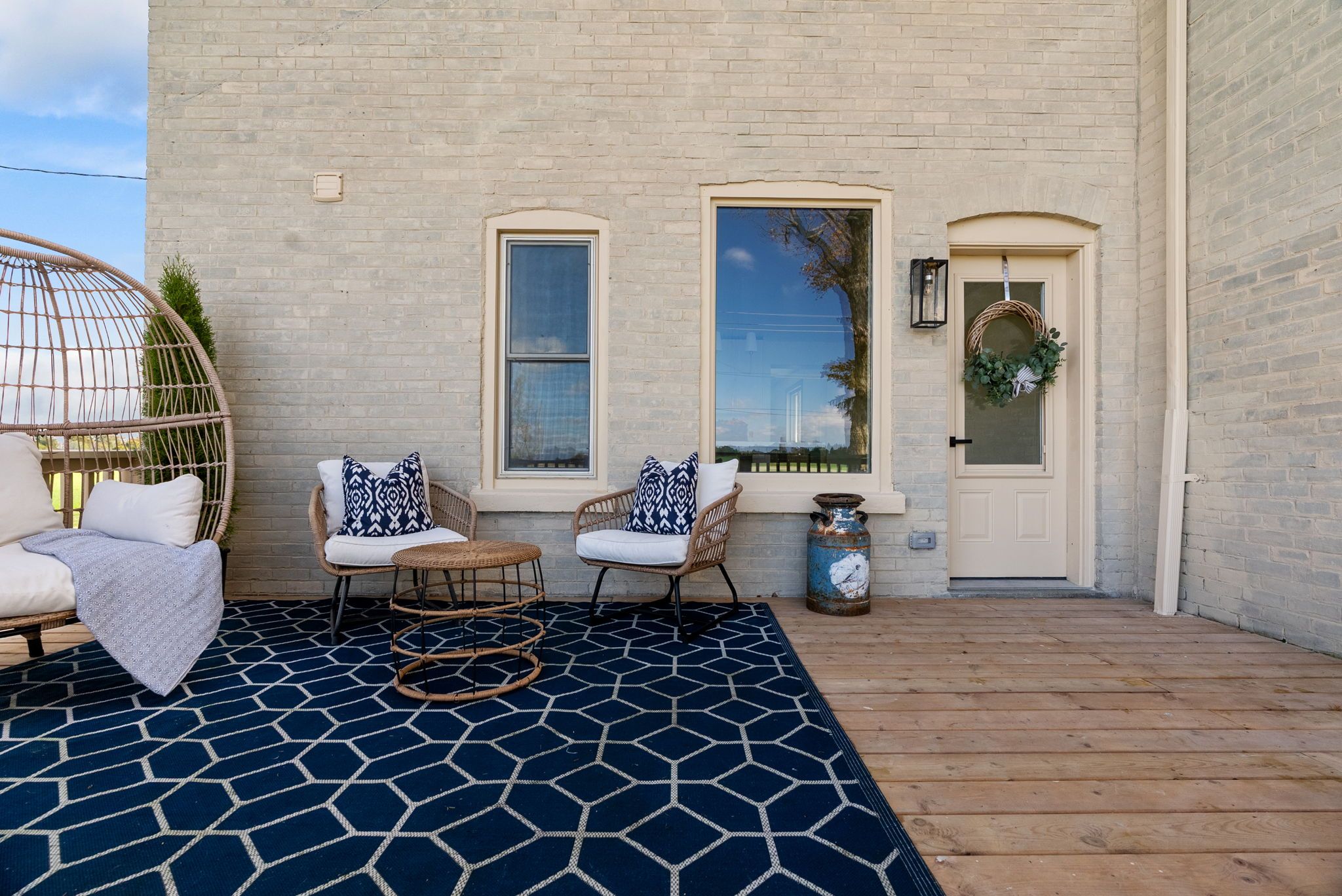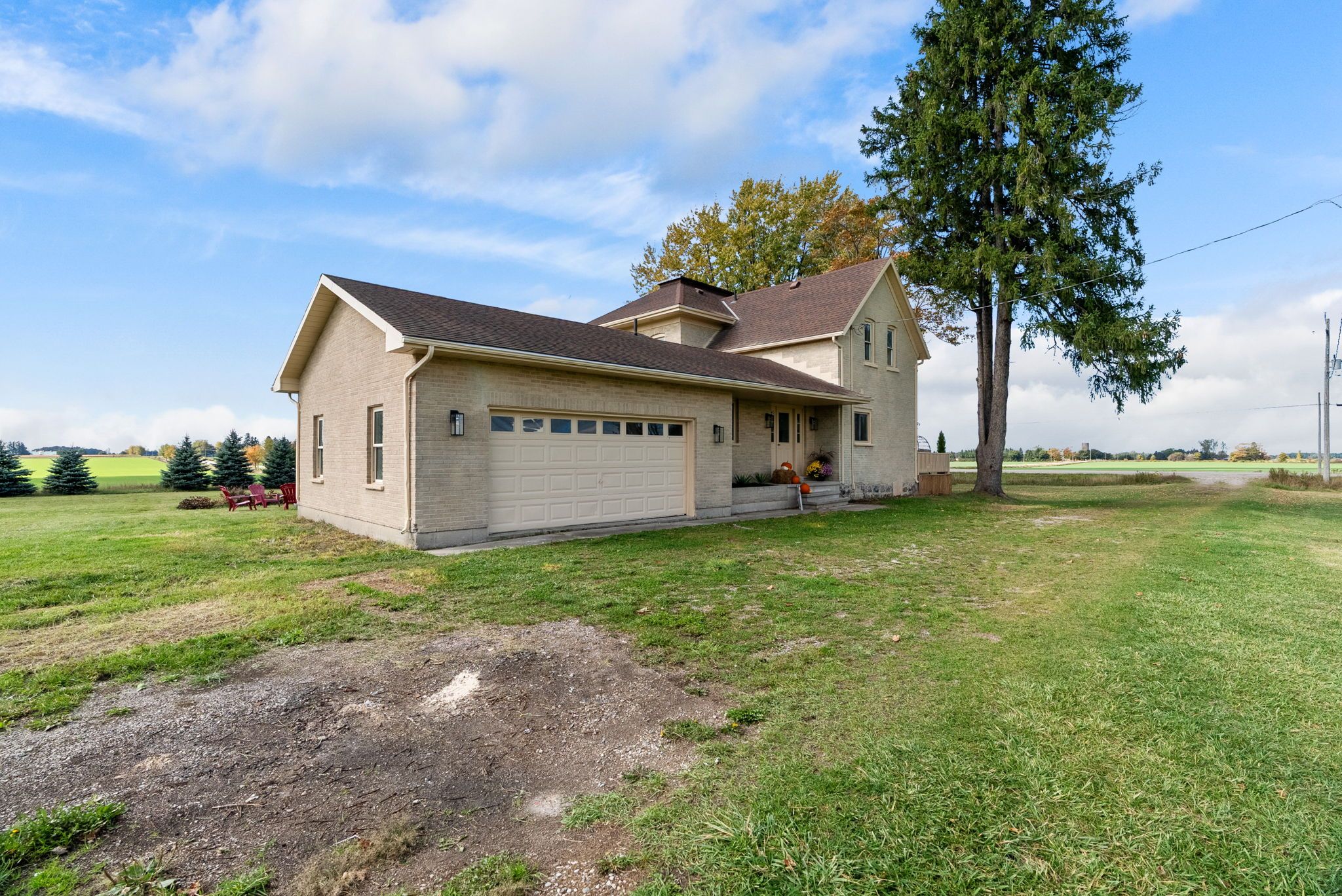 Out where the nights go quiet and the sky still turns gold at dinner hour, this double yellow brick country home sits on 1. 88 acres, calm, finished, and ready for its next people. No renos. No projects. Just move in and start living. Inside, the home feels fresh and grounded. White walls, soft greens, and warm black and gold accents play off natural wood tones for that modern farmhouse feel. The kitchen is the kind that makes you want to cook again, with a massive quartz island, pot filler, and a door to the deck where you catch the sunset over the fields. Off the entry, the laundry room is both beautiful and practical, and the main floor bedroom doubles perfectly as an office. The living room opens to the kitchen so no one ever misses the game or the conversation. The bay window floods the space with golden evening light, while a tiled electric fireplace and reclaimed wood-beam mantle add cozy charm. Upstairs, the primary bedroom feels like a quiet retreat, airy, and spacious enough for a king bed and sitting area. The upper bath is the true showstopper: a full wet room with an open-concept shower and freestanding soaking tub, tiled to the ceiling and accented with gold fixtures. Both bathroom vanities feature warm wood textures, including a stunning fluted double vanity that feels straight out of a design magazine. Outside, the lifestyle speaks for itself, natural gas heat in the country, fibre internet, mature trees, and open, flat land with room for a future shop, garden, or pool. The deck is updated, water and hydro are already run outside, and the double garage with inside entry is spotless. If you've been waiting to move to the country without inheriting someone else's projects, this is the one you simply walk into and start living.