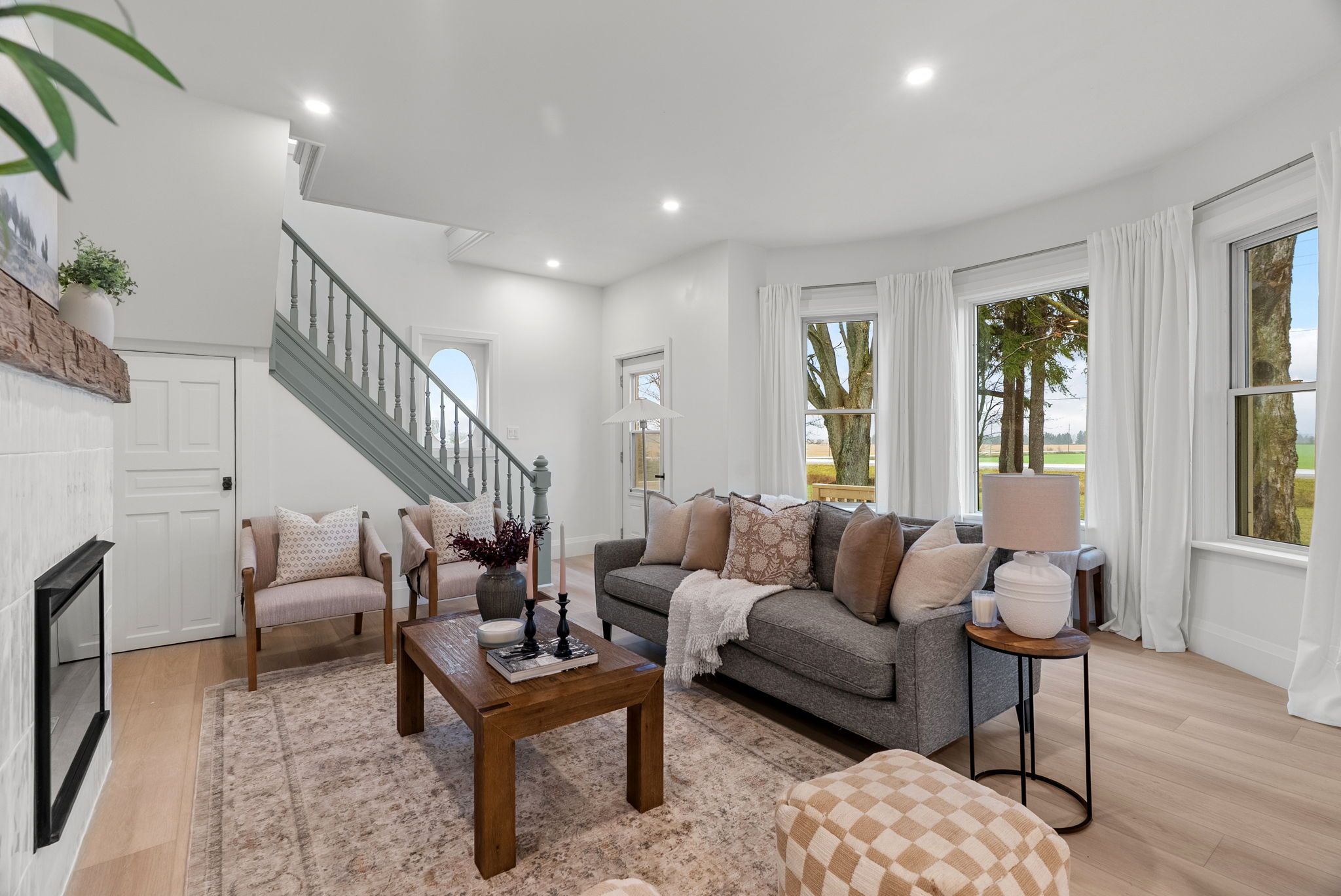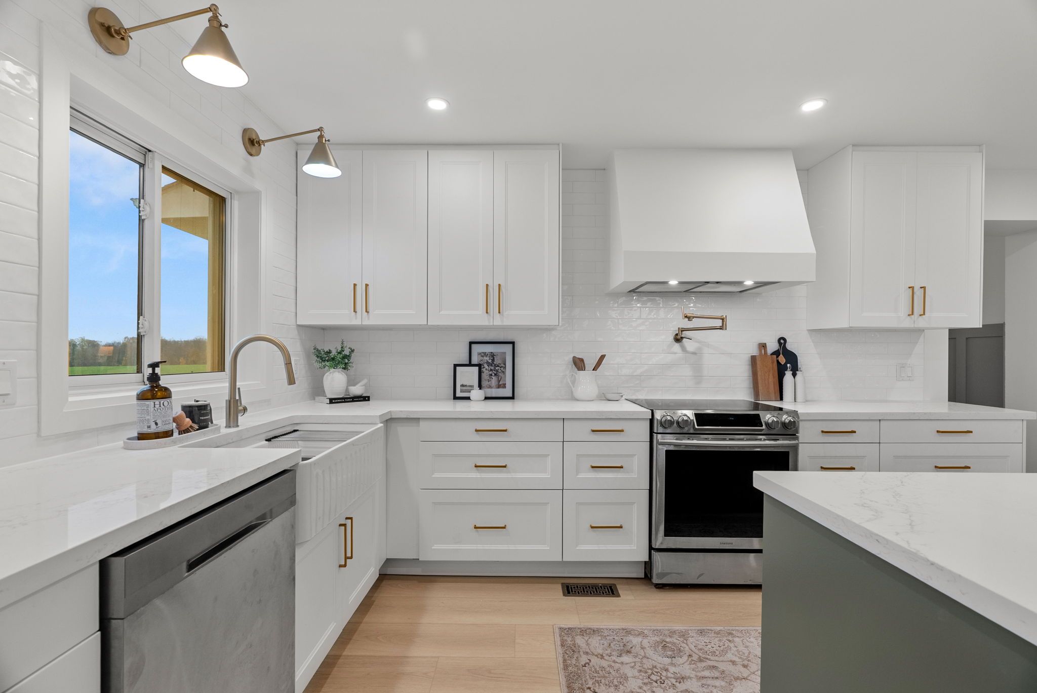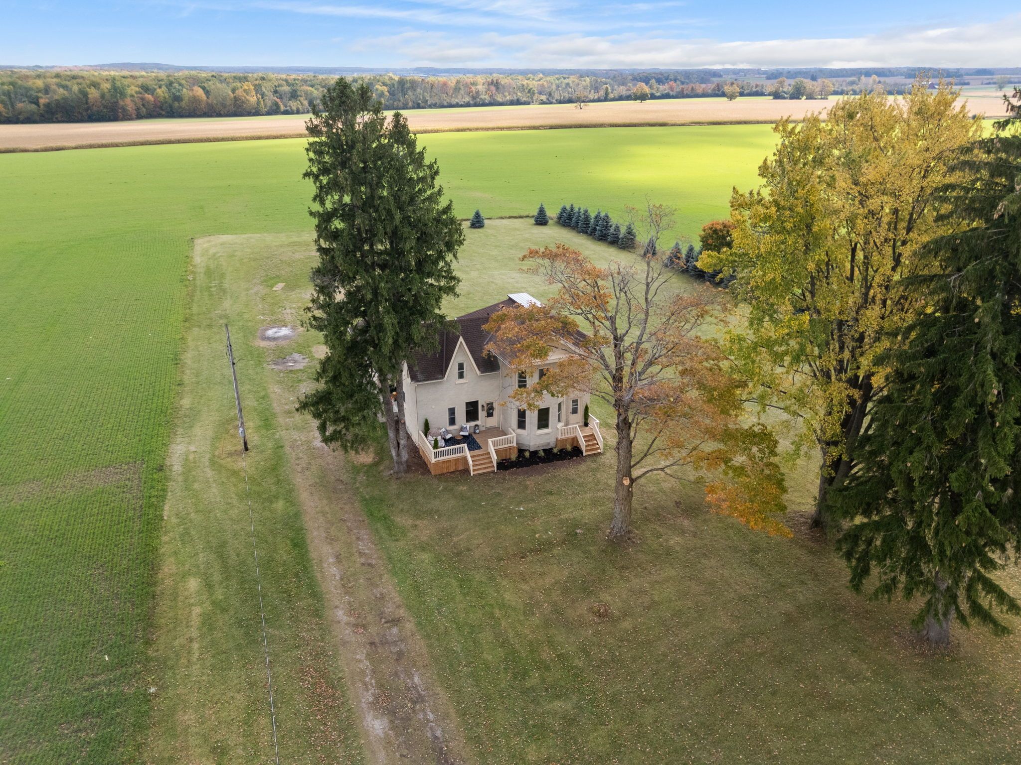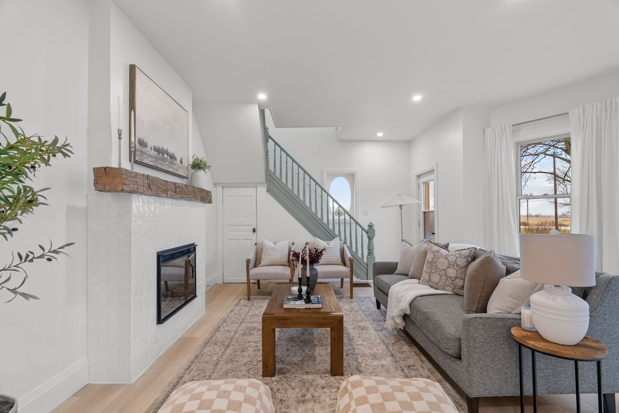 Out where the nights go quiet and the sky still turns gold at dinner hour, this double yellow brick country home sits on 1. 88 acres, calm, finished, and ready for its next people. No renos. No projects. Just move in and start living. Inside, the home feels fresh and grounded. White walls, soft greens, and warm black and gold accents play off natural wood tones for that modern farmhouse feel. The kitchen is the kind that makes you want to cook again, with a massive quartz island, pot filler, and a door to the deck where you catch the sunset over the fields. Off the entry, the laundry room is both beautiful and practical, and the main floor bedroom doubles perfectly as an office. The living room opens to the kitchen so no one ever misses the game or the conversation. The bay window floods the space with golden evening light, while a tiled electric fireplace and reclaimed wood-beam mantle add cozy charm. Upstairs, the primary bedroom feels like a quiet retreat, airy, and spacious enough for a king bed and sitting area. The upper bath is the true showstopper: a full wet room with an open-concept shower and freestanding soaking tub, tiled to the ceiling and accented with gold fixtures. Both bathroom vanities feature warm wood textures, including a stunning fluted double vanity that feels straight out of a design magazine. Outside, the lifestyle speaks for itself, natural gas heat in the country, fibre internet, mature trees, and open, flat land with room for a future shop, garden, or pool. The deck is updated, water and hydro are already run outside, and the double garage with inside entry is spotless. If you've been waiting to move to the country without inheriting someone else's projects, this is the one you simply walk into and start living.