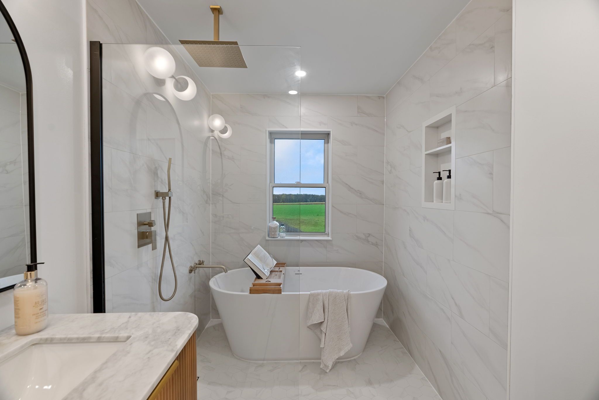 • Upper bath is a luxury wet room with a soaking tub and gold fixtures.