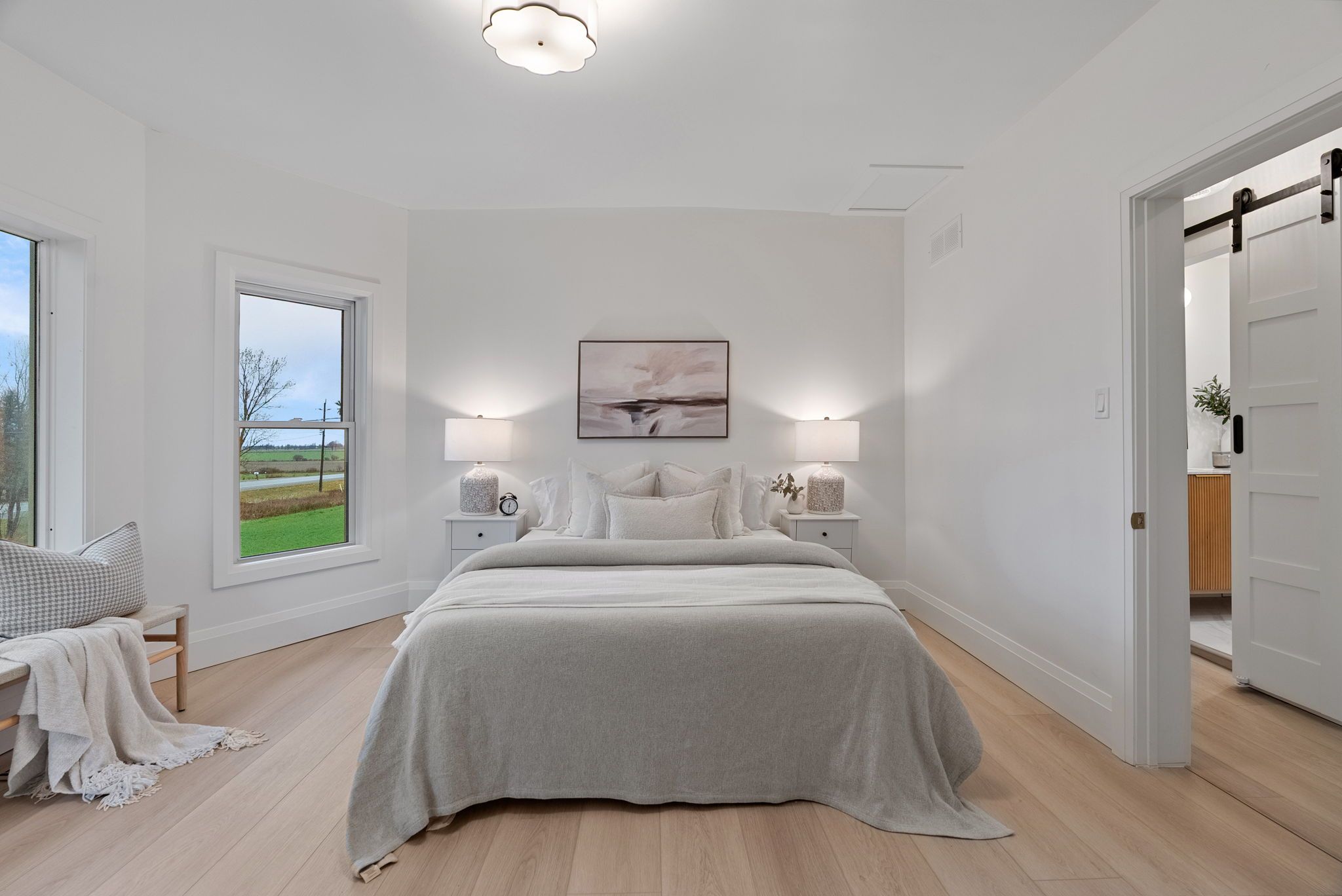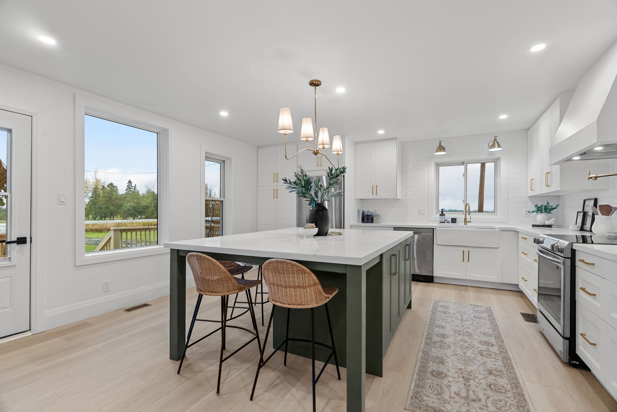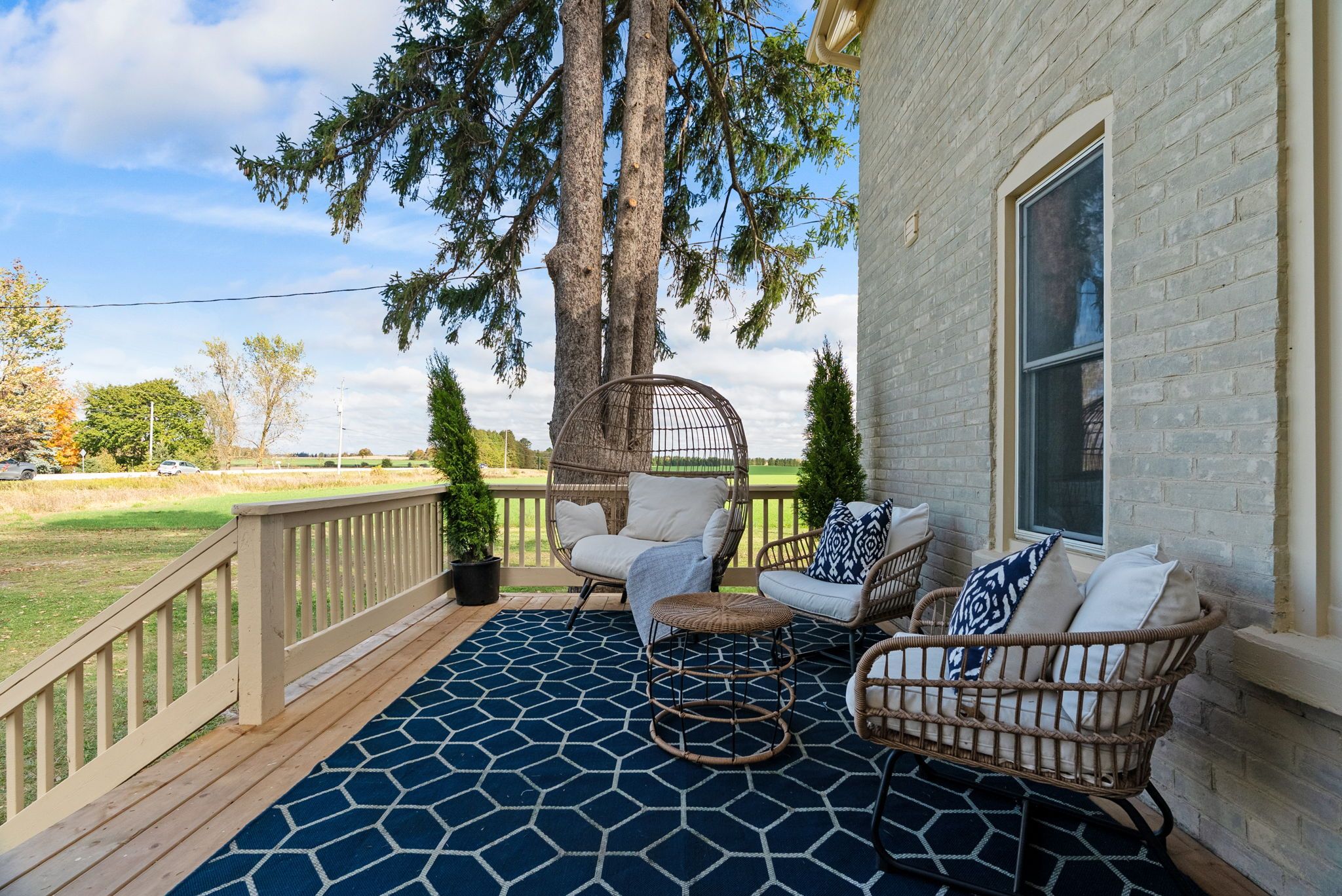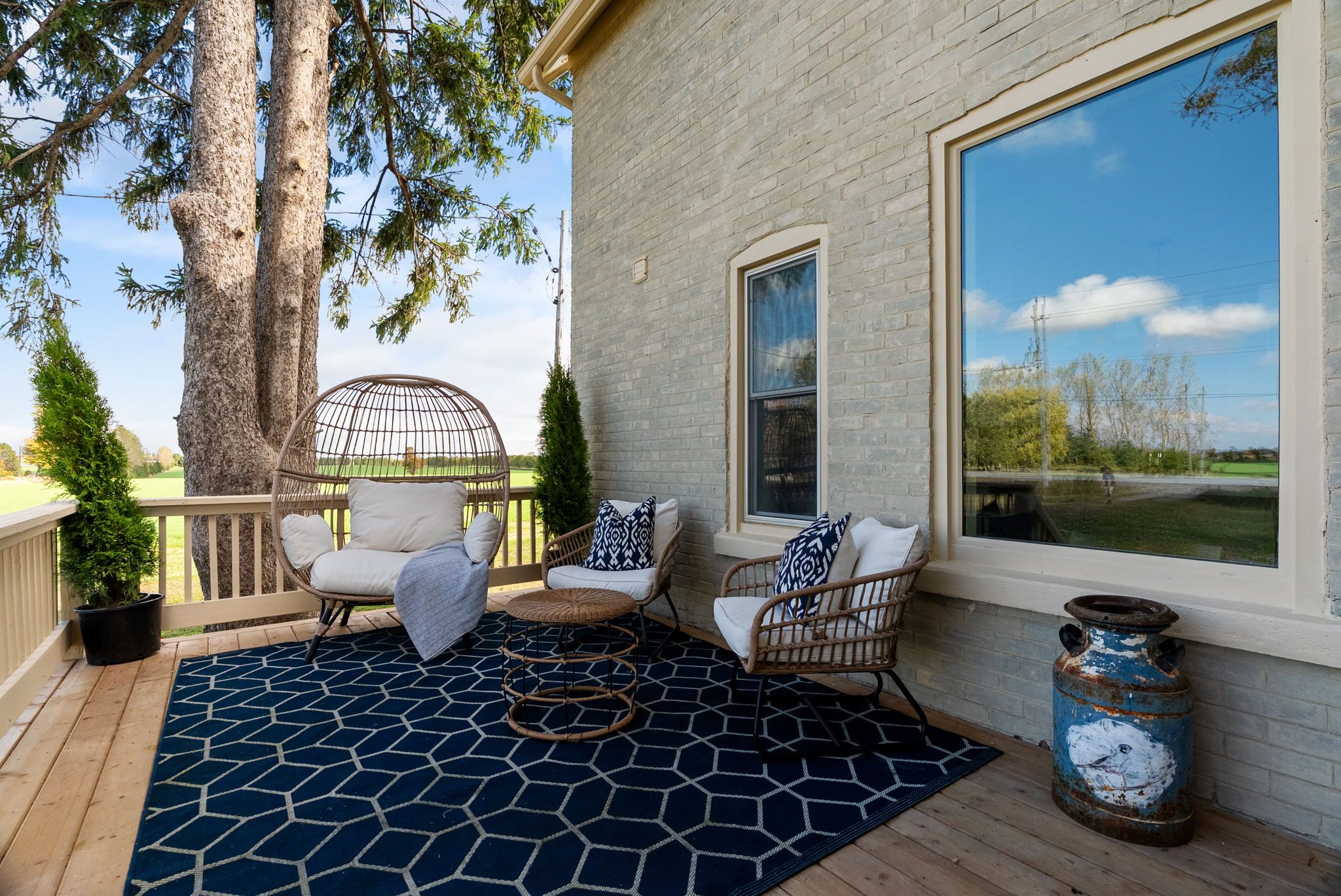 Out where the nights go quiet and the sky still turns gold at dinner hour, this double yellow brick country home sits on 1. 88 acres, calm, finished, and ready for its next people. No renos. No projects. Just move in and start living. Inside, the home feels fresh and grounded. White walls, soft greens, and warm black and gold accents play off natural wood tones for that modern farmhouse feel. The kitchen is the kind that makes you want to cook again, with a massive quartz island, pot filler, and a door to the deck where you catch the sunset over the fields. Off the entry, the laundry room is both beautiful and practical, and the main floor bedroom doubles perfectly as an office. The living room opens to the kitchen so no one ever misses the game or the conversation. The bay window floods the space with golden evening light, while a tiled electric fireplace and reclaimed wood-beam mantle add cozy charm. Upstairs, the primary bedroom feels like a quiet retreat, airy, and spacious enough for a king bed and sitting area. The upper bath is the true showstopper: a full wet room with an open-concept shower and freestanding soaking tub, tiled to the ceiling and accented with gold fixtures. Both bathroom vanities feature warm wood textures, including a stunning fluted double vanity that feels straight out of a design magazine. Outside, the lifestyle speaks for itself, natural gas heat in the country, fibre internet, mature trees, and open, flat land with room for a future shop, garden, or pool. The deck is updated, water and hydro are already run outside, and the double garage with inside entry is spotless. If you've been waiting to move to the country without inheriting someone else's projects, this is the one you simply walk into and start living.