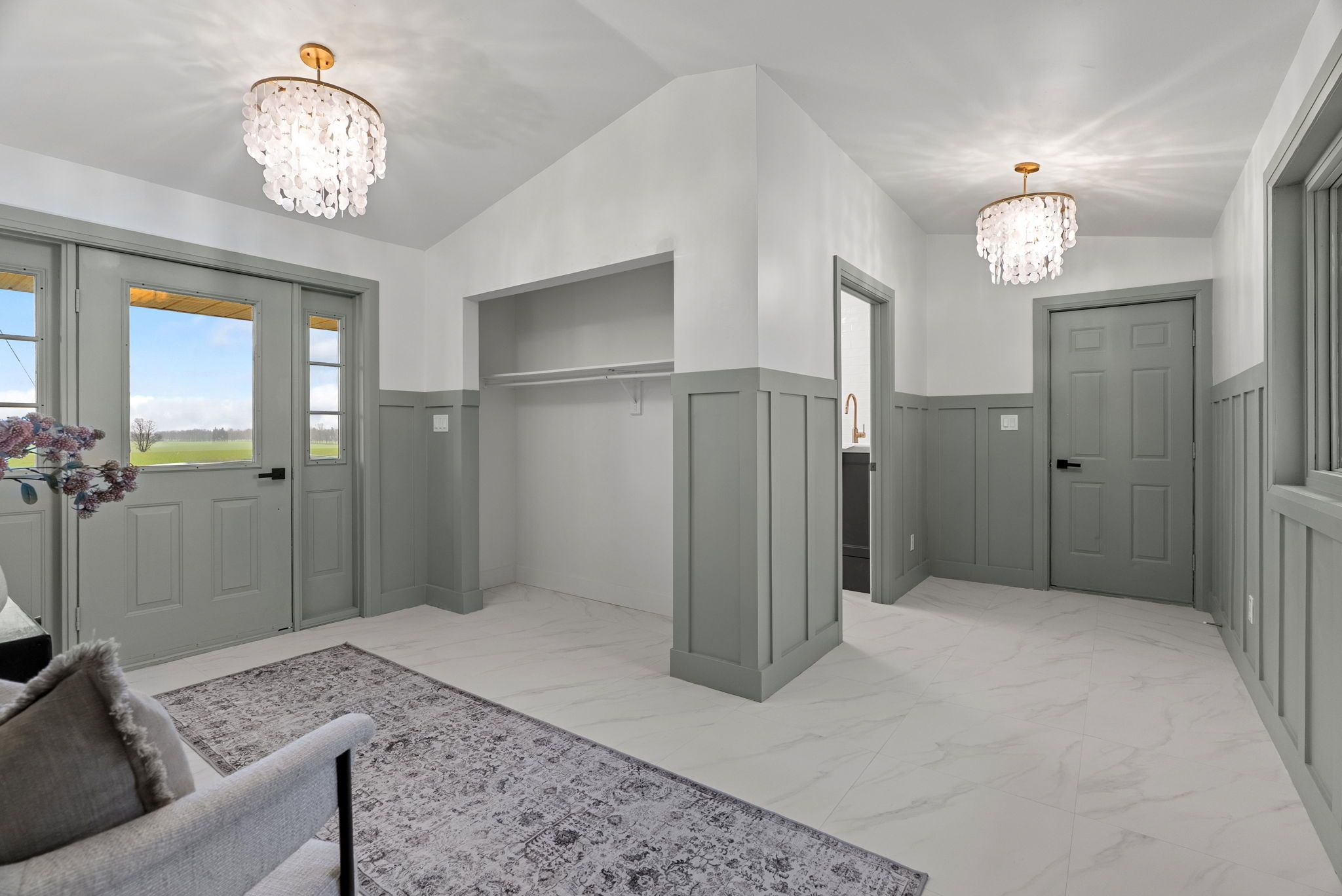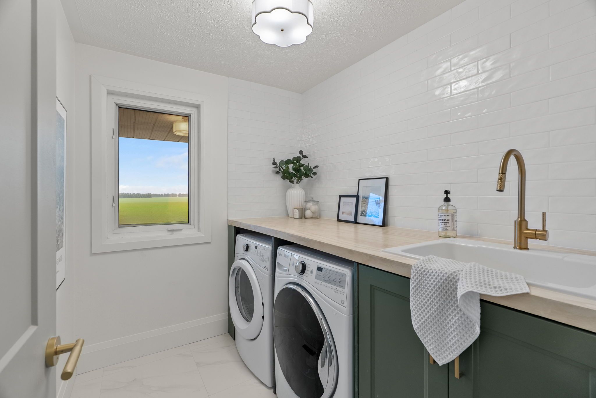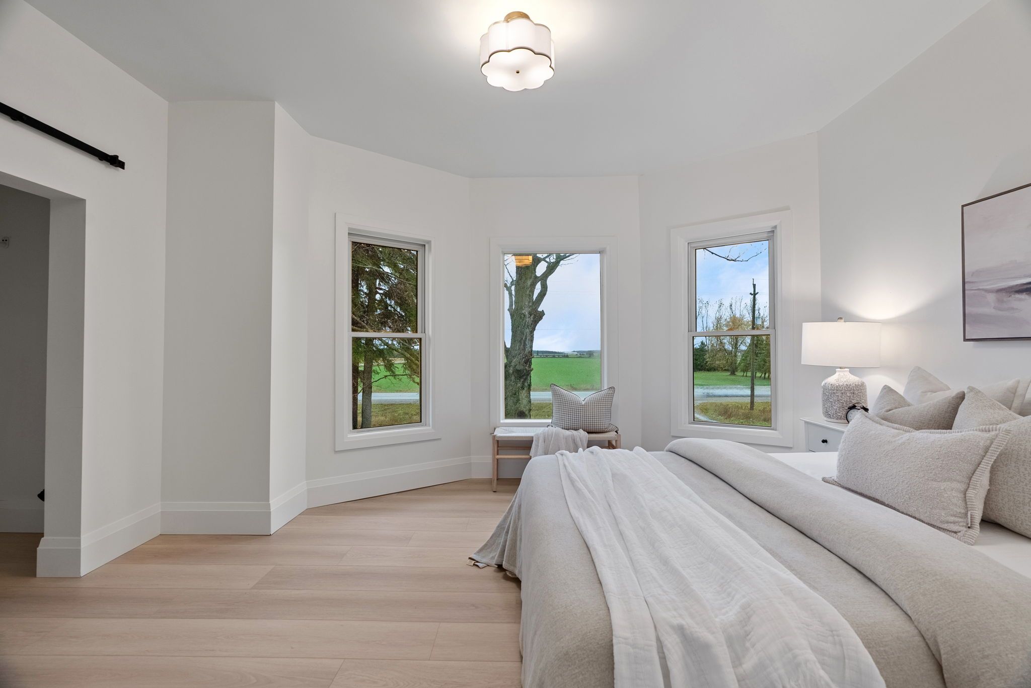 Out where the nights go quiet and the sky still turns gold at dinner hour, this double yellow brick country home sits on 1. 88 acres, calm, finished, and ready for its next people. No renos. No projects. Just move in and start living. Inside, the home feels fresh and grounded. White walls, soft greens, and warm black and gold accents play off natural wood tones for that modern farmhouse feel. The kitchen is the kind that makes you want to cook again, with a massive quartz island, pot filler, and a door to the deck where you catch the sunset over the fields. Off the entry, the laundry room is both beautiful and practical, and the main floor bedroom doubles perfectly as an office. The living room opens to the kitchen so no one ever misses the game or the conversation. The bay window floods the space with golden evening light, while a tiled electric fireplace and reclaimed wood-beam mantle add cozy charm. Upstairs, the primary bedroom feels like a quiet retreat, airy, and spacious enough for a king bed and sitting area. The upper bath is the true showstopper: a full wet room with an open-concept shower and freestanding soaking tub, tiled to the ceiling and accented with gold fixtures. Both bathroom vanities feature warm wood textures, including a stunning fluted double vanity that feels straight out of a design magazine. Outside, the lifestyle speaks for itself, natural gas heat in the country, fibre internet, mature trees, and open, flat land with room for a future shop, garden, or pool. The deck is updated, water and hydro are already run outside, and the double garage with inside entry is spotless. If you've been waiting to move to the country without inheriting someone else's projects, this is the one you simply walk into and start living.