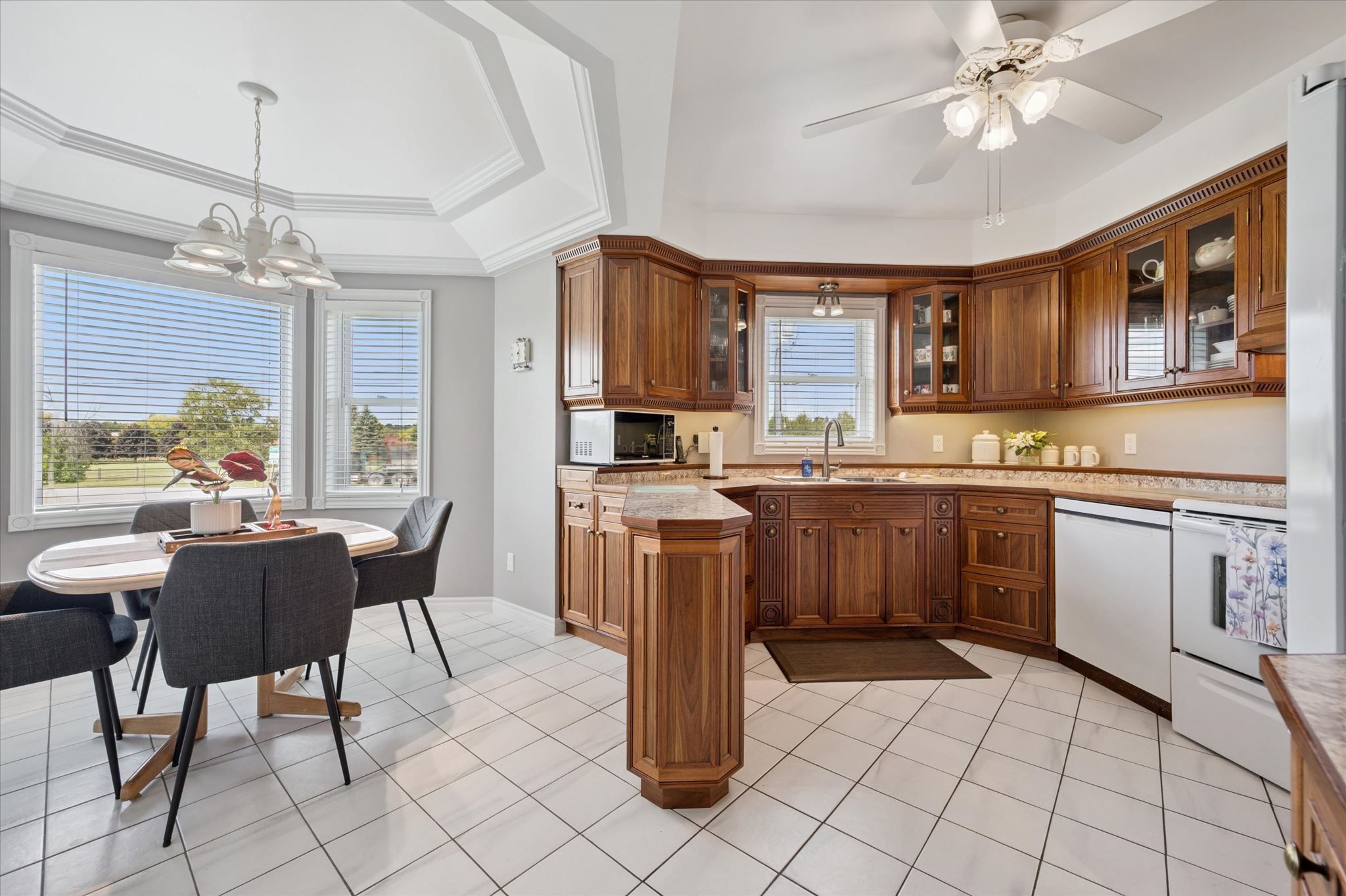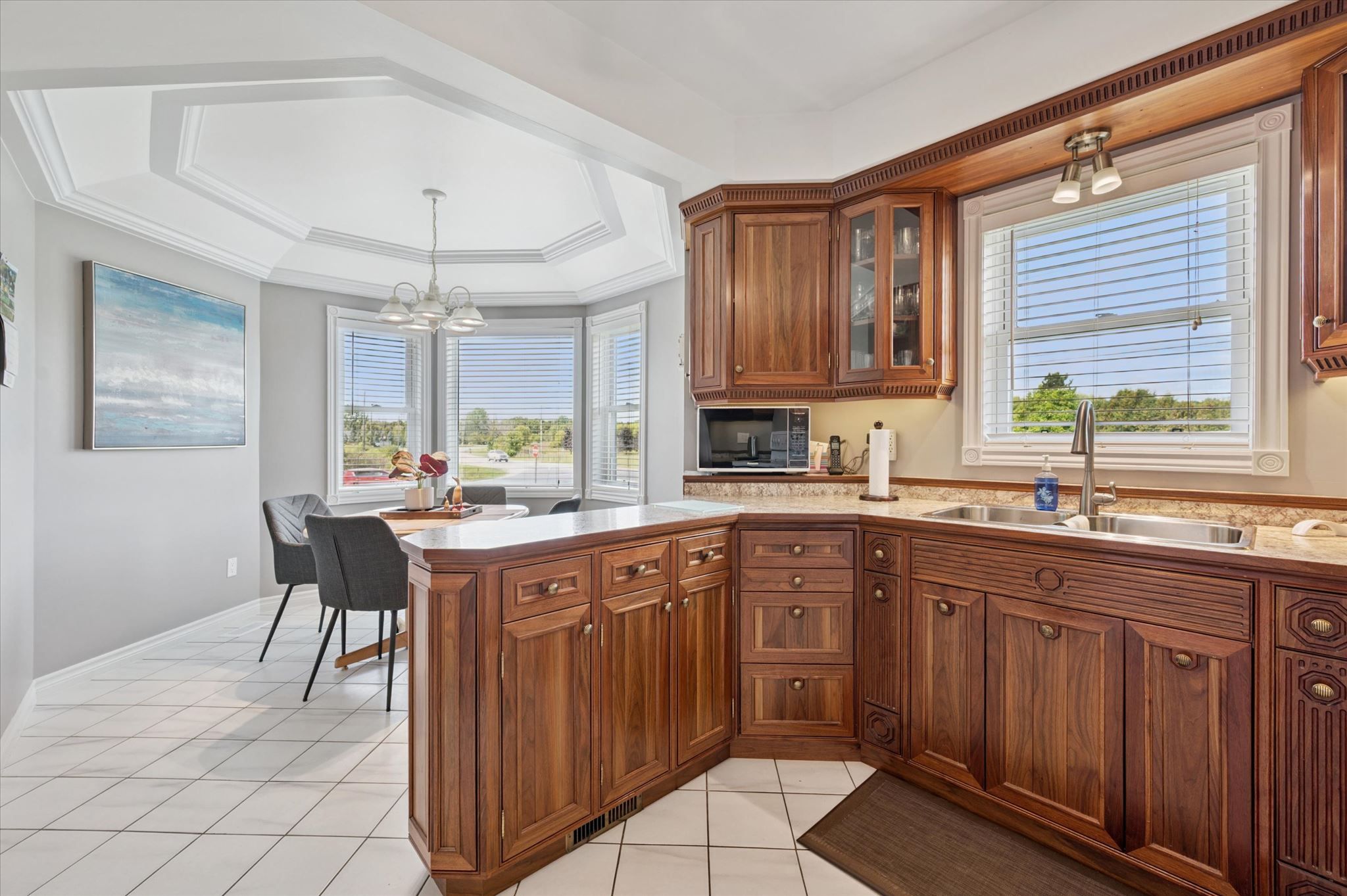 • Bright custom kitchen with black walnut cabinetry and a sunny breakfast area.