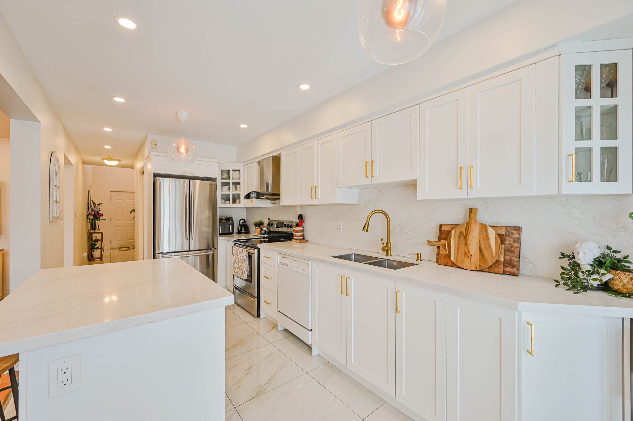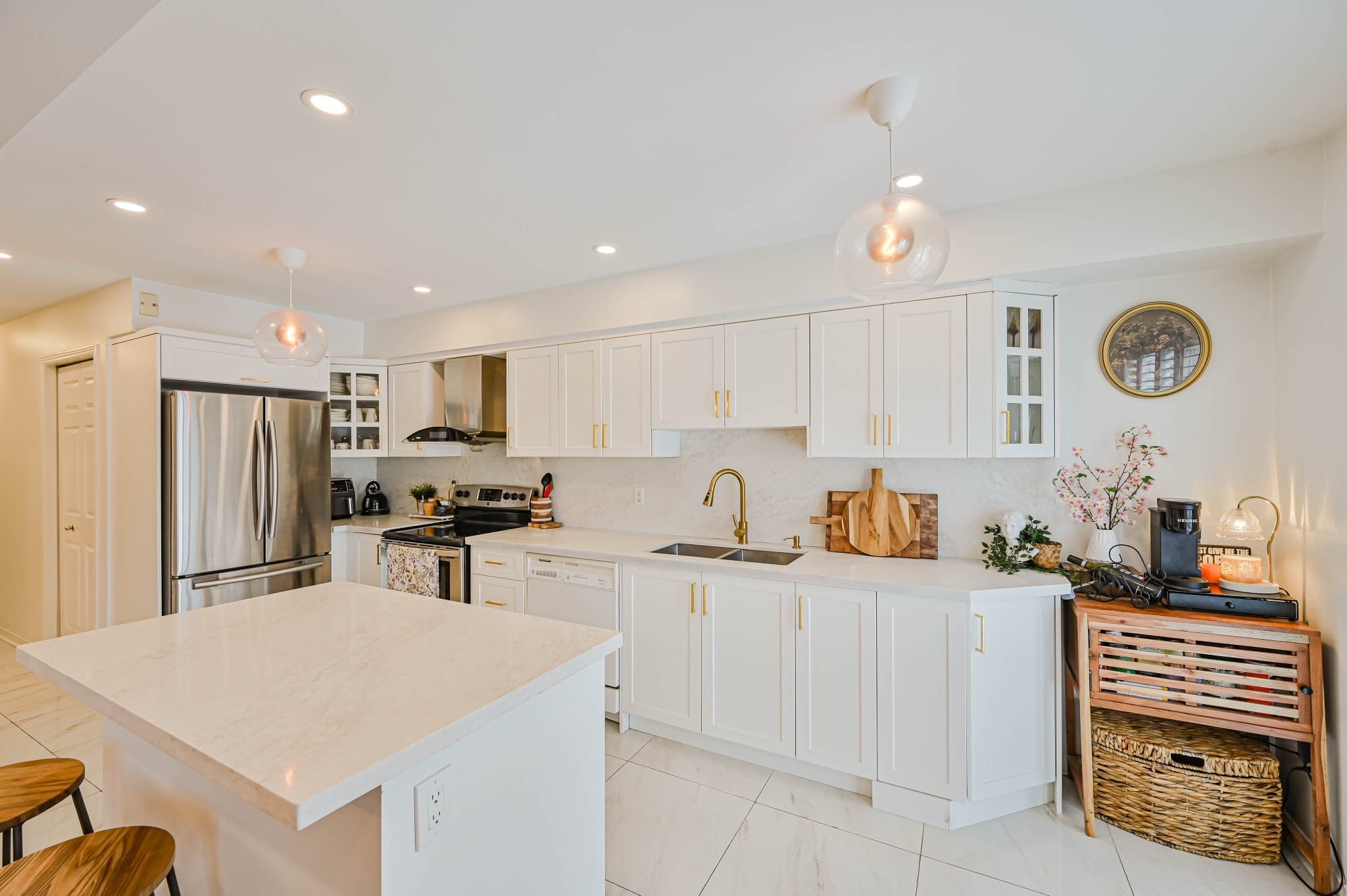 • Upgraded kitchen with new cabinetry, quartz countertops, and a large island.