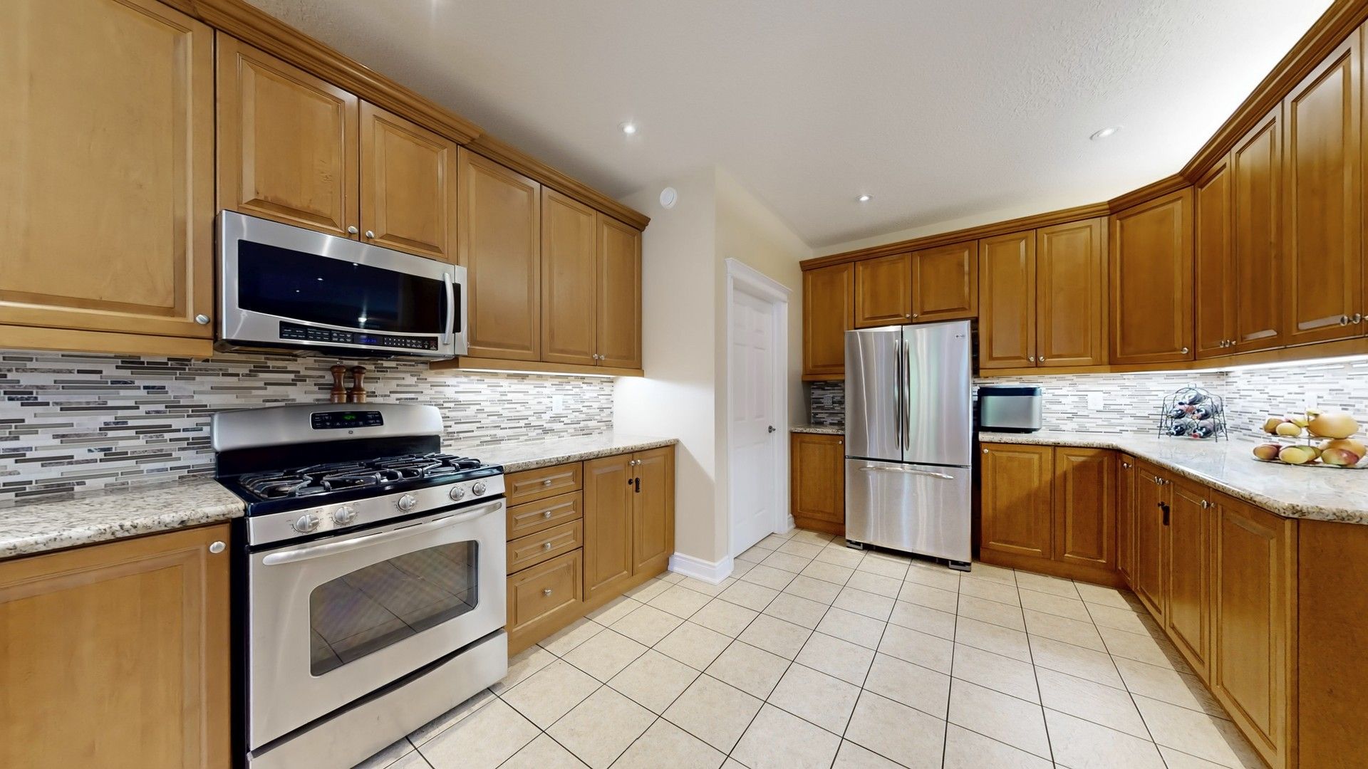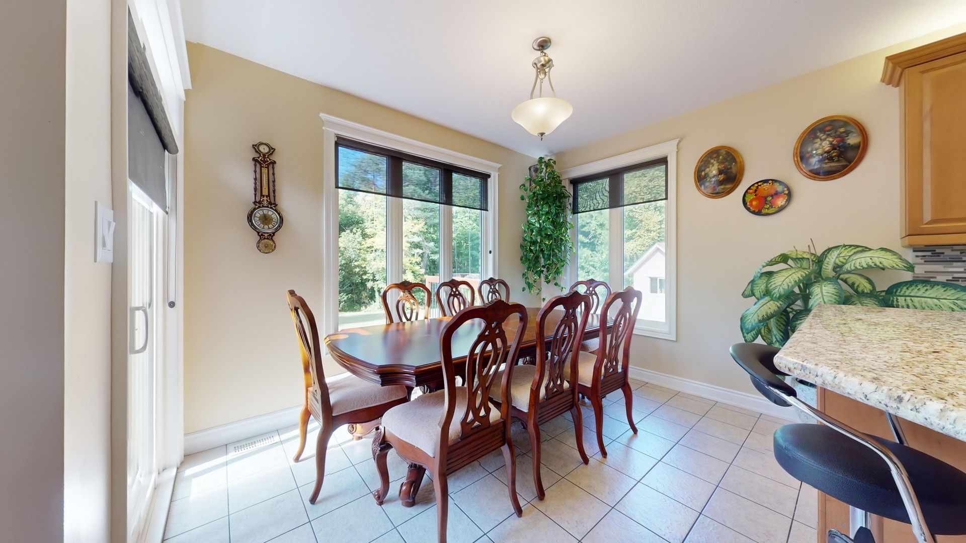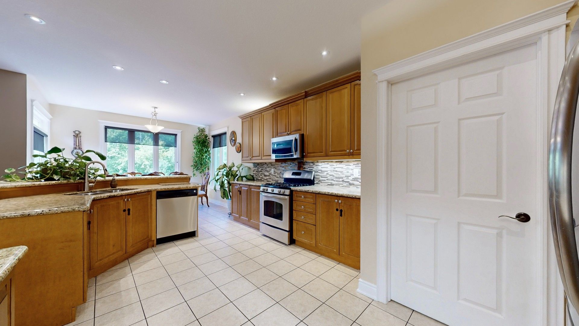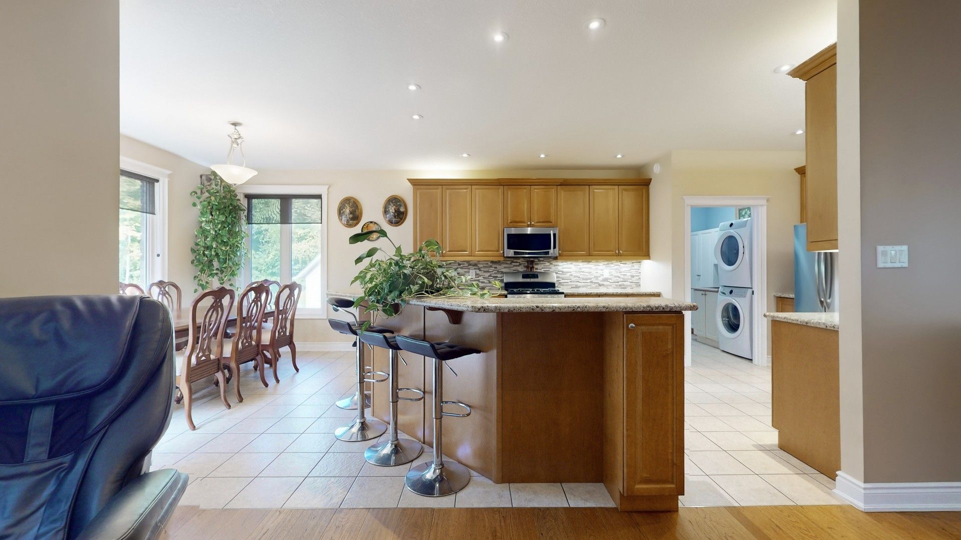 • Gourmet kitchen features granite counters and a large breakfast bar.