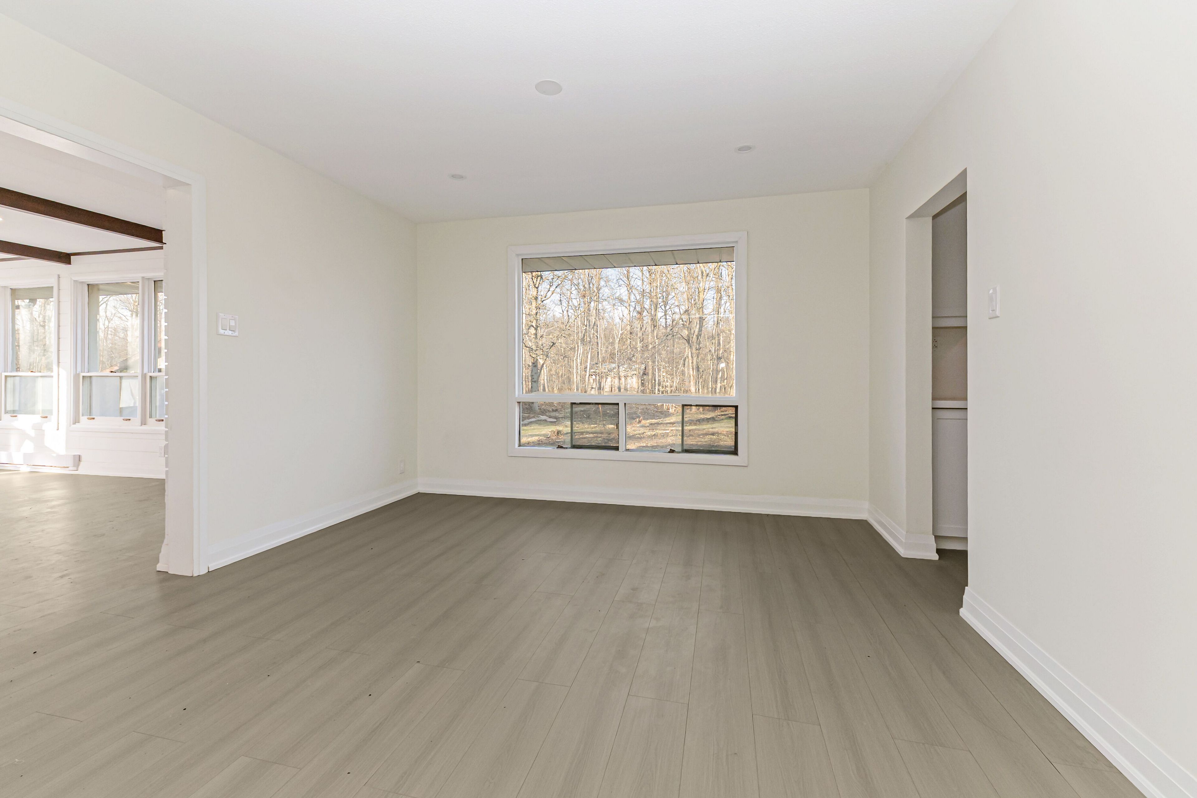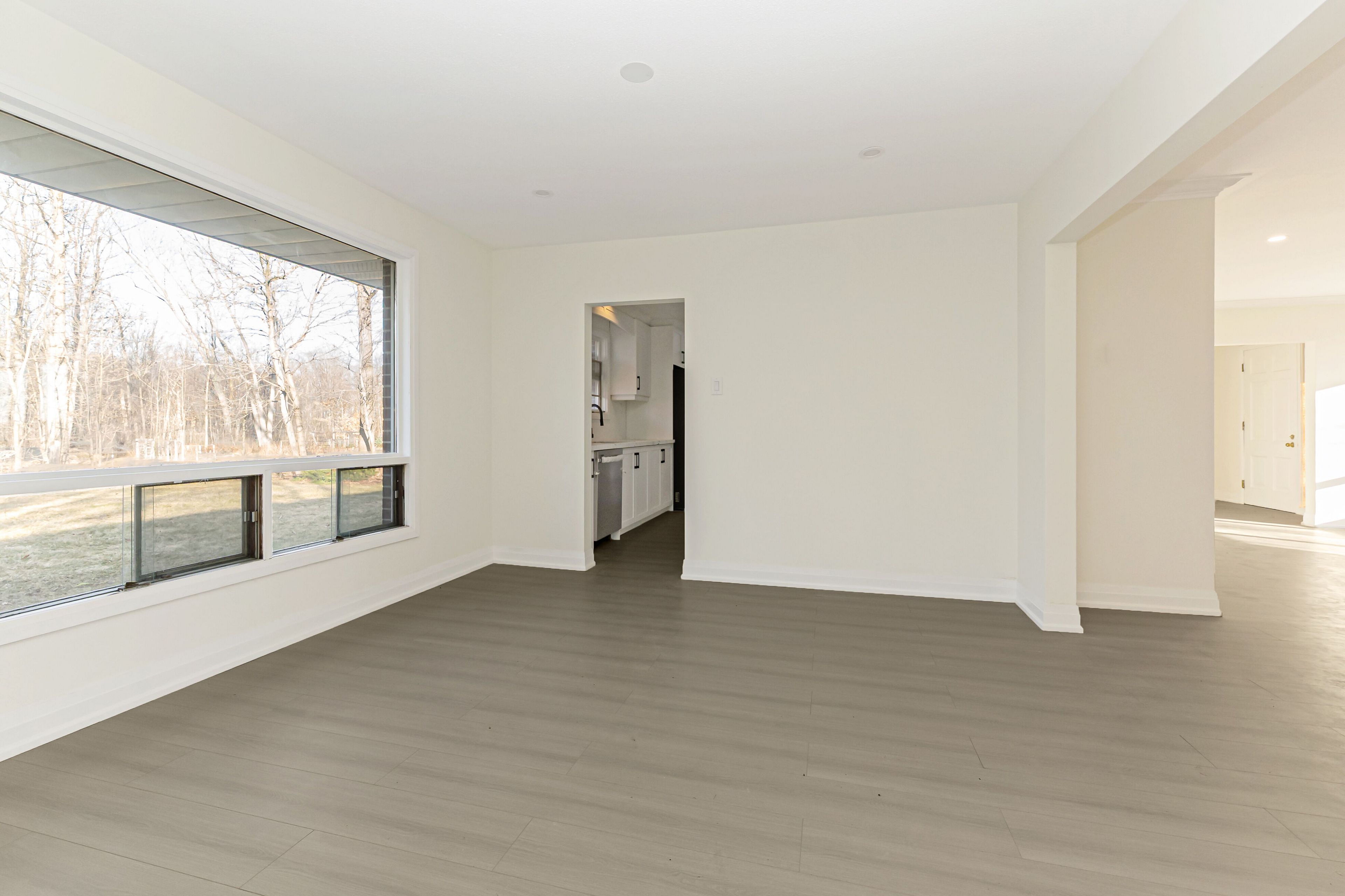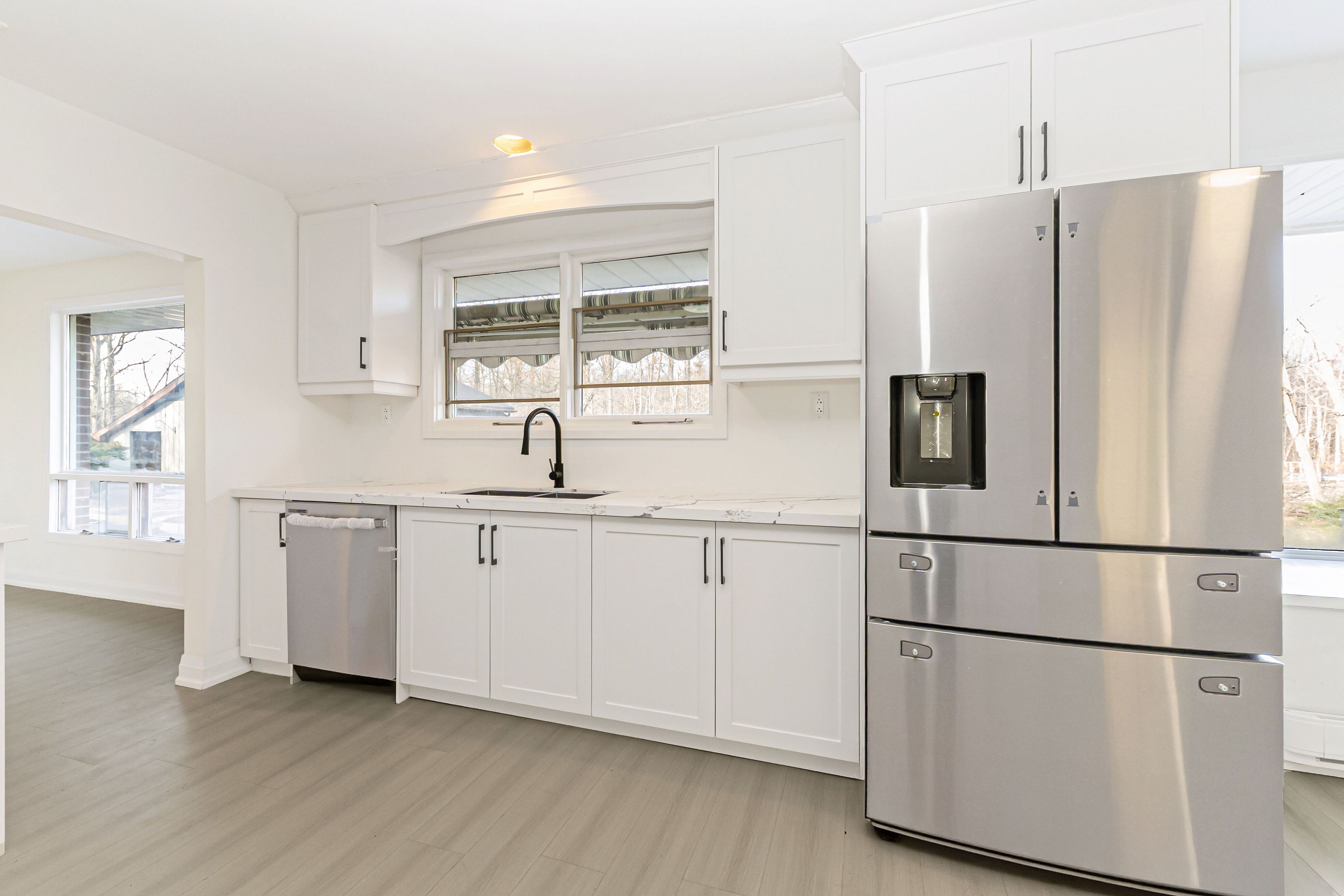 • Bright kitchen with natural sunlight and scenic views of nature.