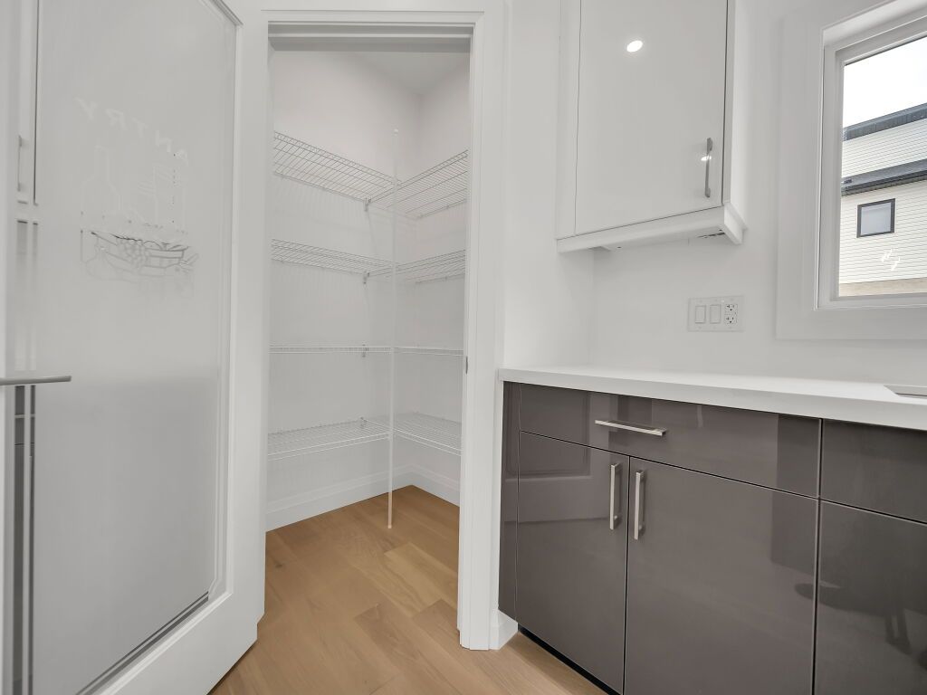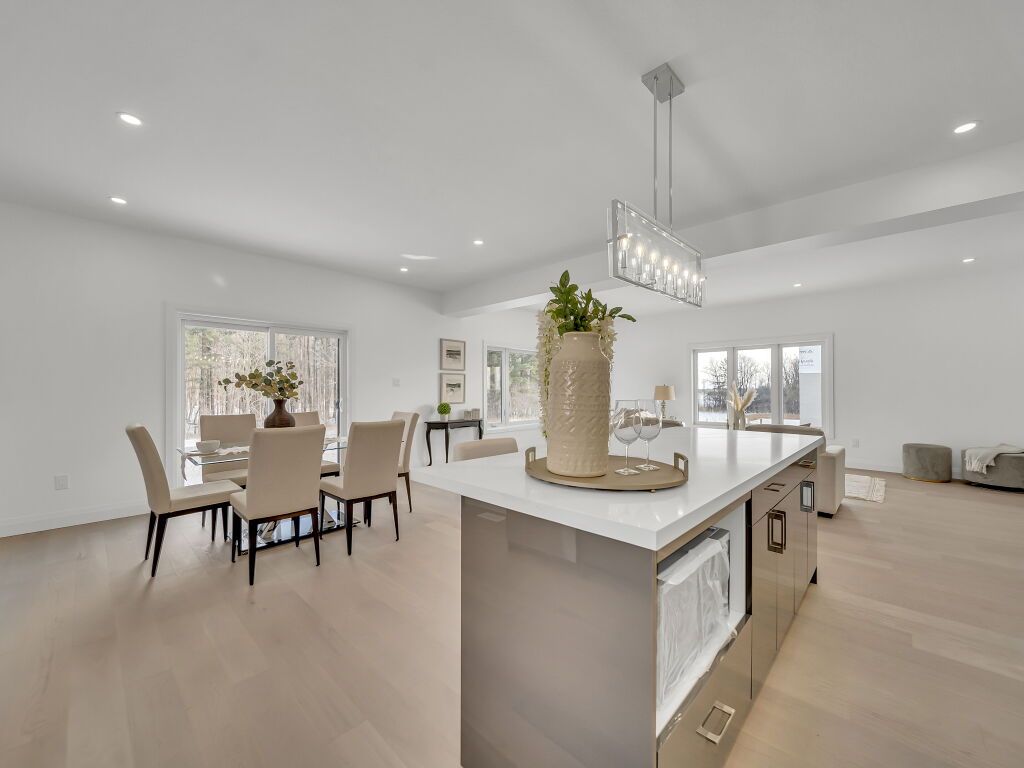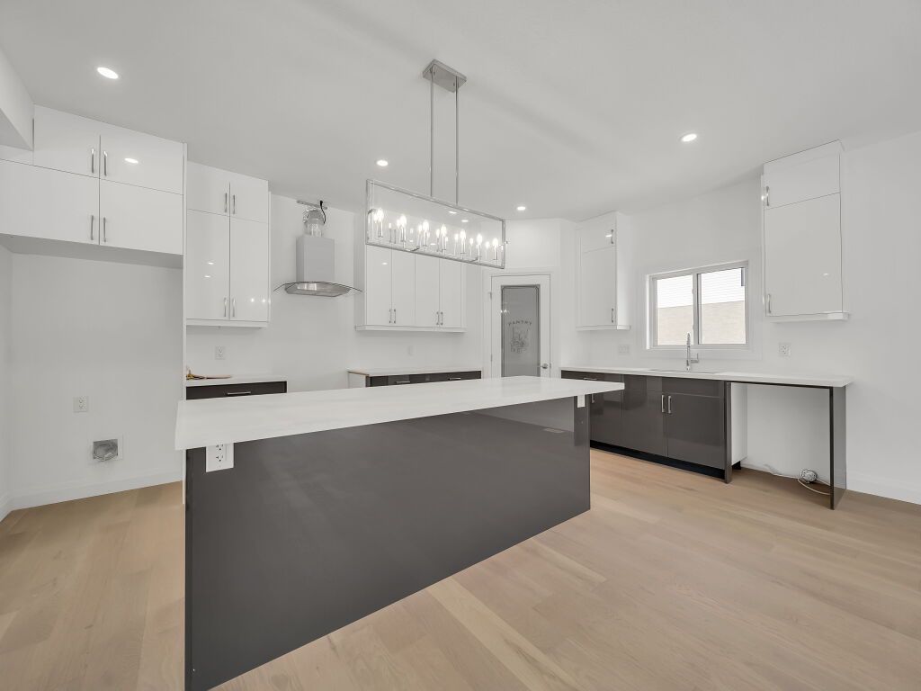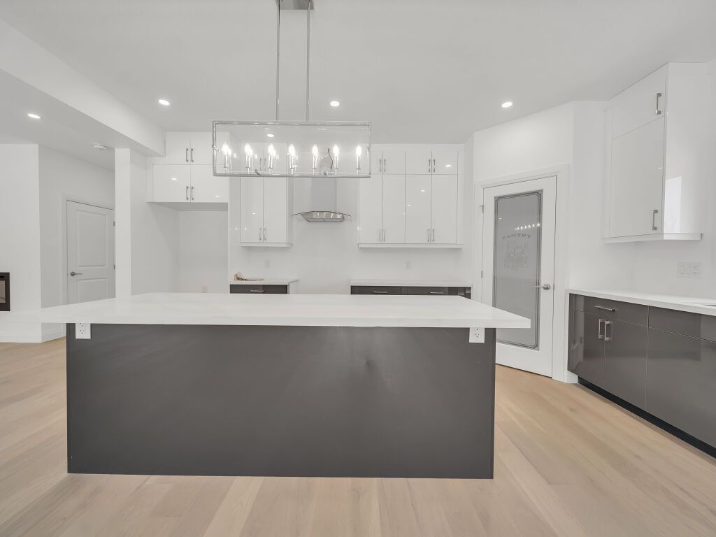 • Modern kitchen features custom cabinets and a convenient breakfast island.