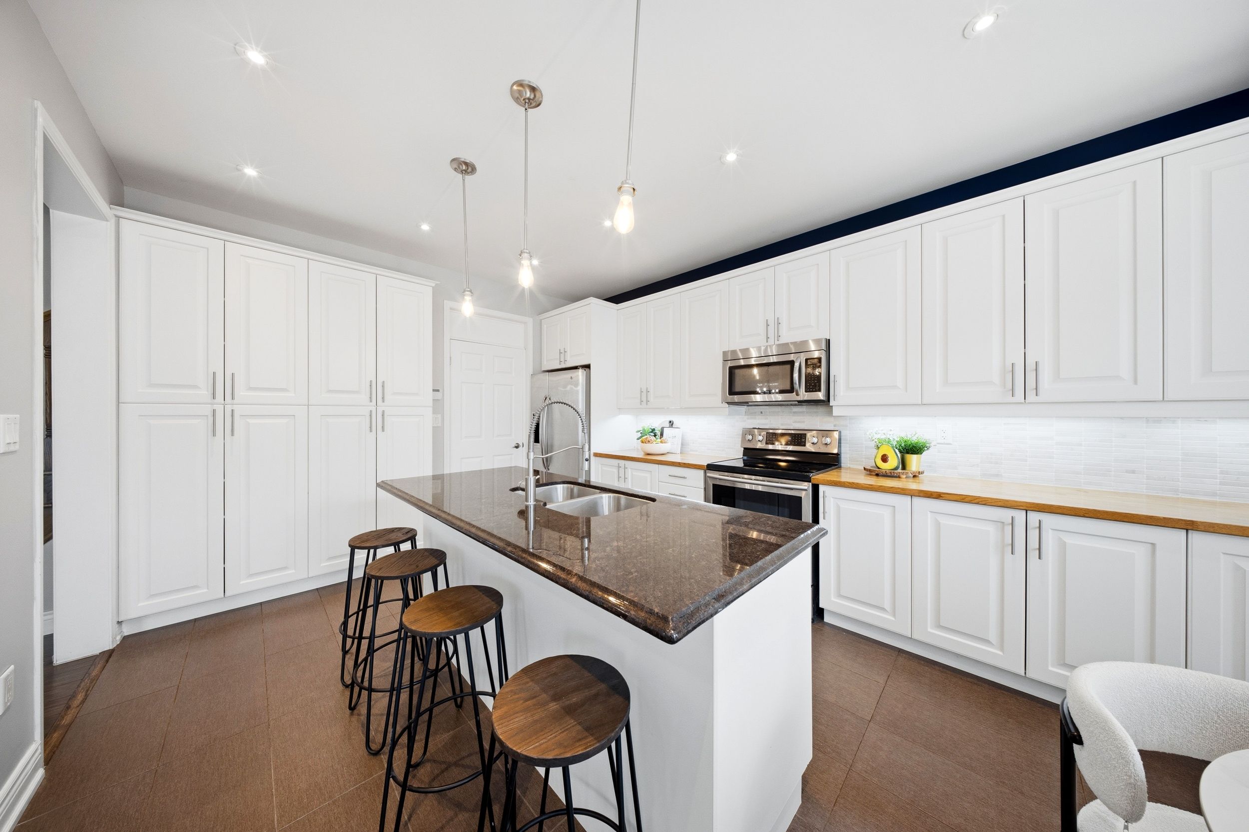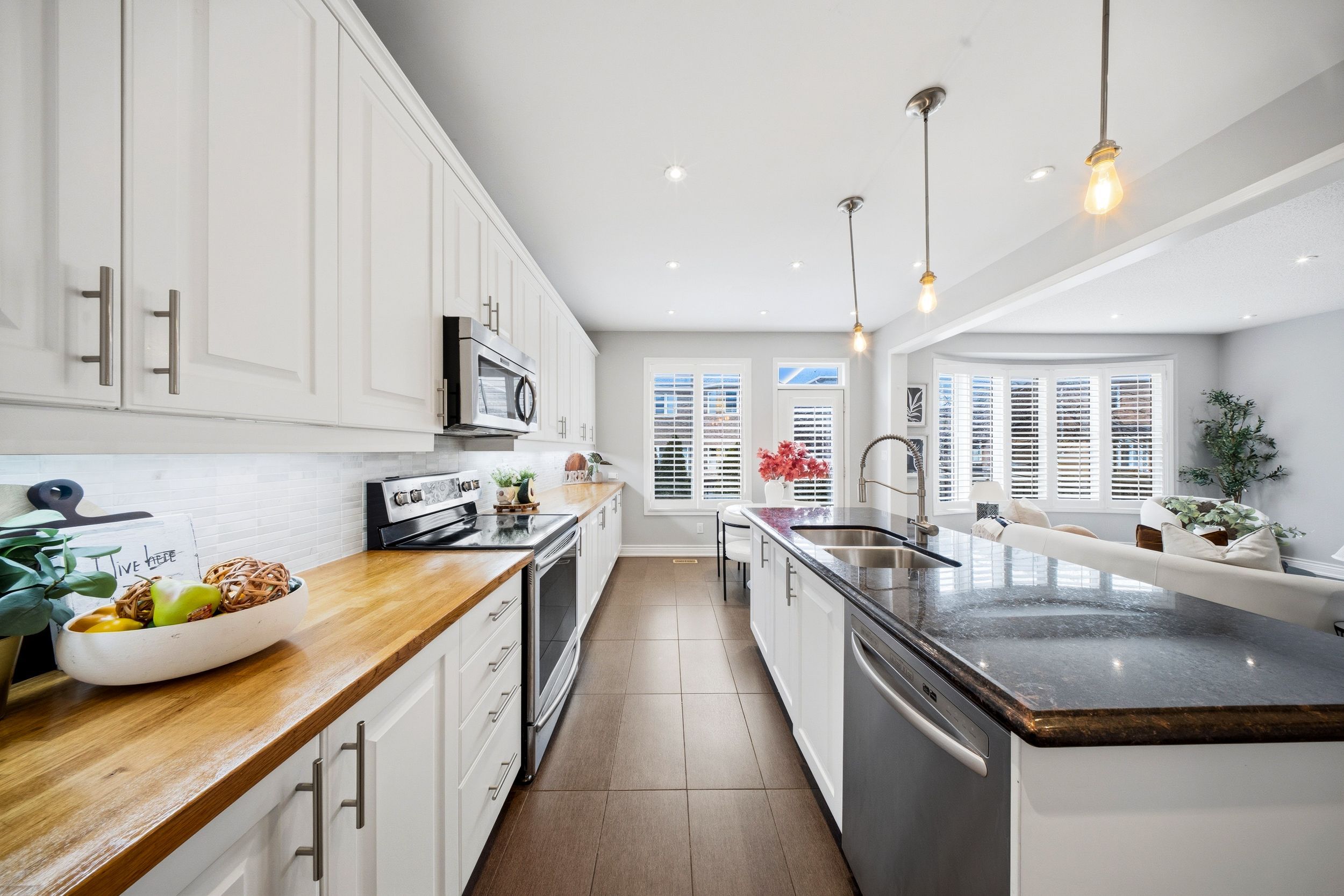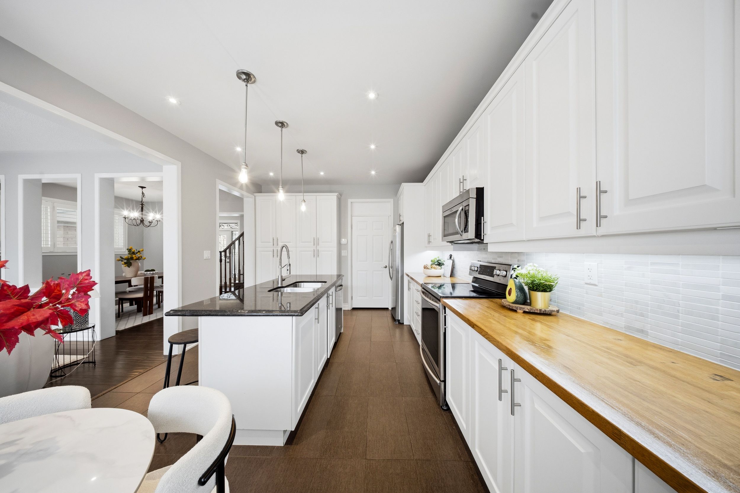 • Spacious kitchen featuring butcher block countertops and stainless steel appliances.