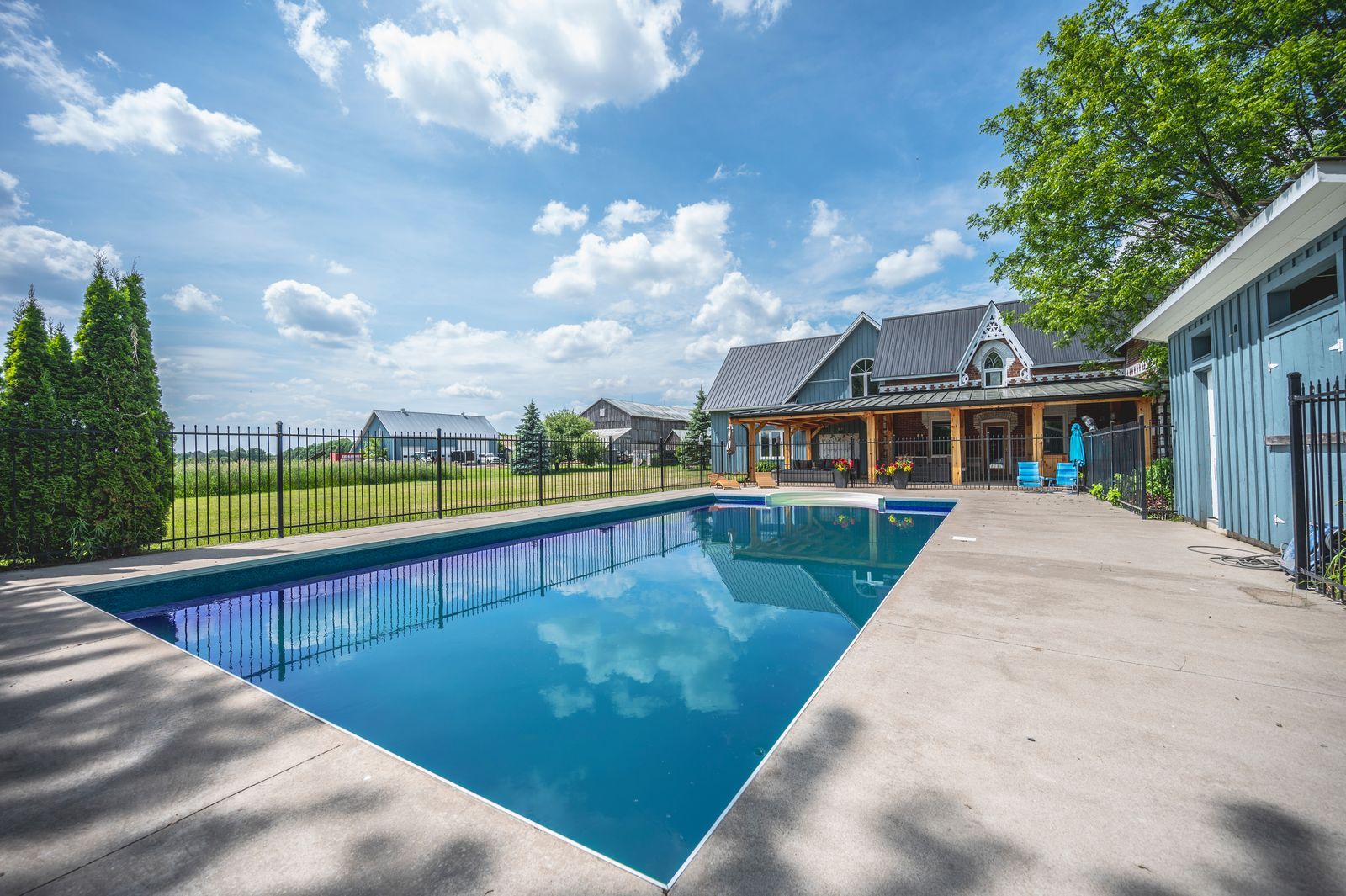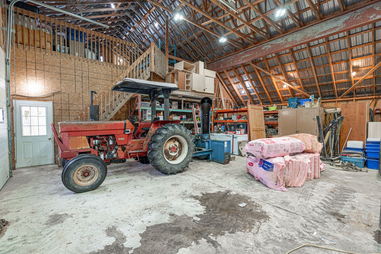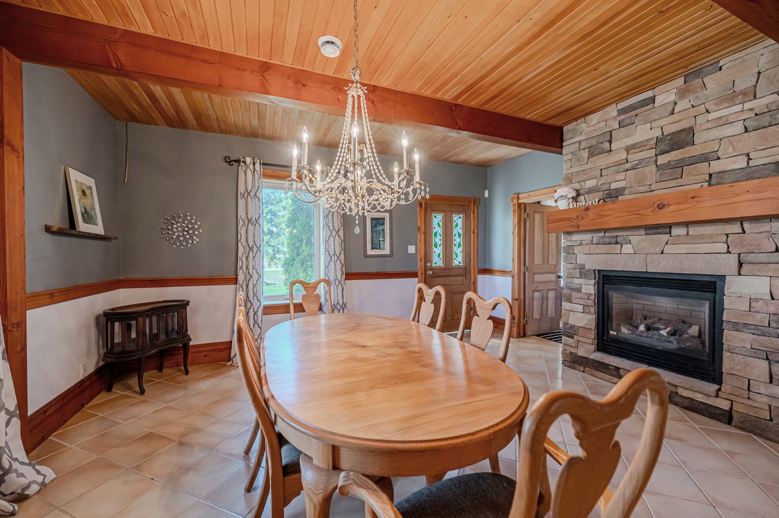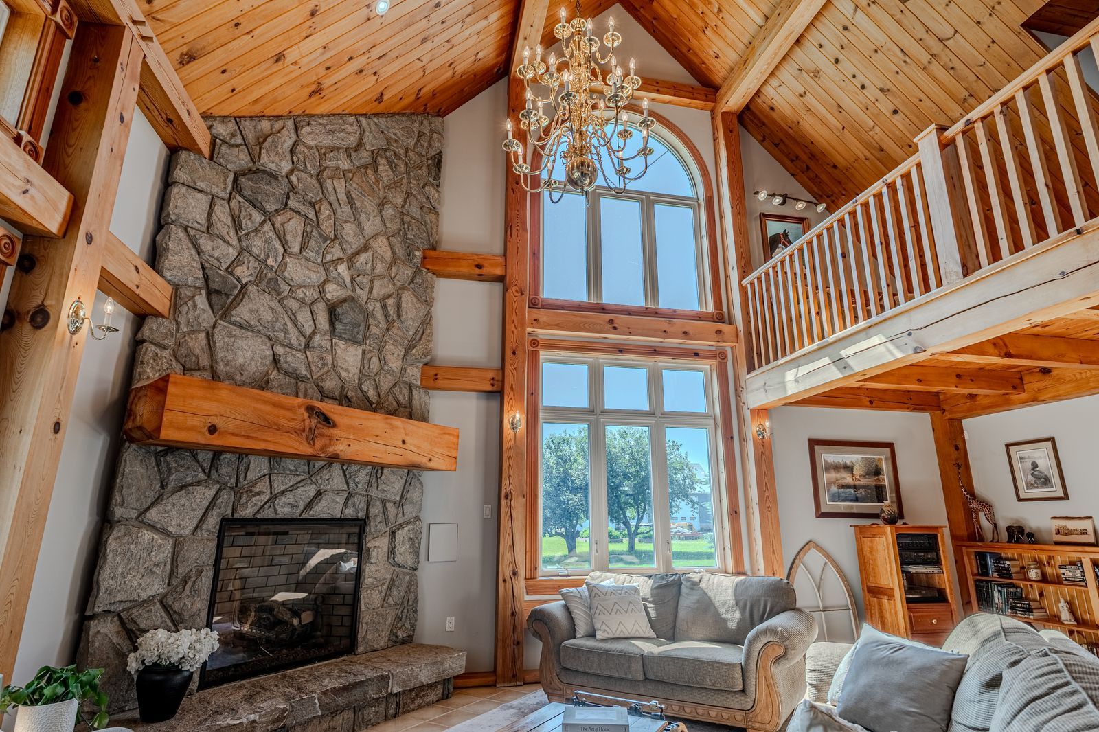 Timber-frame estate on 10 acres with inground pool, expansive barn, versatile outbuildings, & a 4,544 sq ft home built to impress! Call it a farmhouse if you want, but this 10-acre estate works harder than most properties ever will, with outbuildings built to perform and a 4,544 sq ft home that redefines rural craftsmanship. Anchoring the property is a 4,500 sq ft barn with box stalls, paddocks, and tack space, a heated 62 x 38 ft saltbox-style workshop, an 18 x 28 ft drive shed, multiple accessory buildings, and a two-car garage, perfect for home-based businesses, contractors, or equestrian enthusiasts. The home stands among open fields and mature trees, showcasing steep gables, brick and board-and-batten siding, an updated steel roof, and an outdoor retreat with an inground saltwater 20 x 40 ft pool, a pool house with a shower and change room, and a timber-framed covered patio. The great room showcases true timber-frame craftsmanship, with soaring wood-plank ceilings, expansive arched windows, and a floor-to-ceiling stone fireplace crowned by a wood mantle and chandelier, and in-floor radiant heat throughout most of the home. Handcrafted wood cabinets, stone counters, open shelving, and a large island with an apron sink make the kitchen the perfect gathering place, while the breakfast nook invites casual mornings and the formal dining room provides an elegant setting with a fireplace and patio access. A main-floor office offers a dedicated workspace, while upstairs, a billiards room with vaulted ceilings and arched windows overlooks the great room and flows into a large family/games area. The primary suite enjoys its own private wing, accessed by a separate staircase, with a walk-in closet and ensuite featuring a jetted tub. Every part of this estate, from the surrounding acreage to the timber-frame home and equipped outbuildings, is ready to support a lifestyle of work, recreation, and country living at its finest.