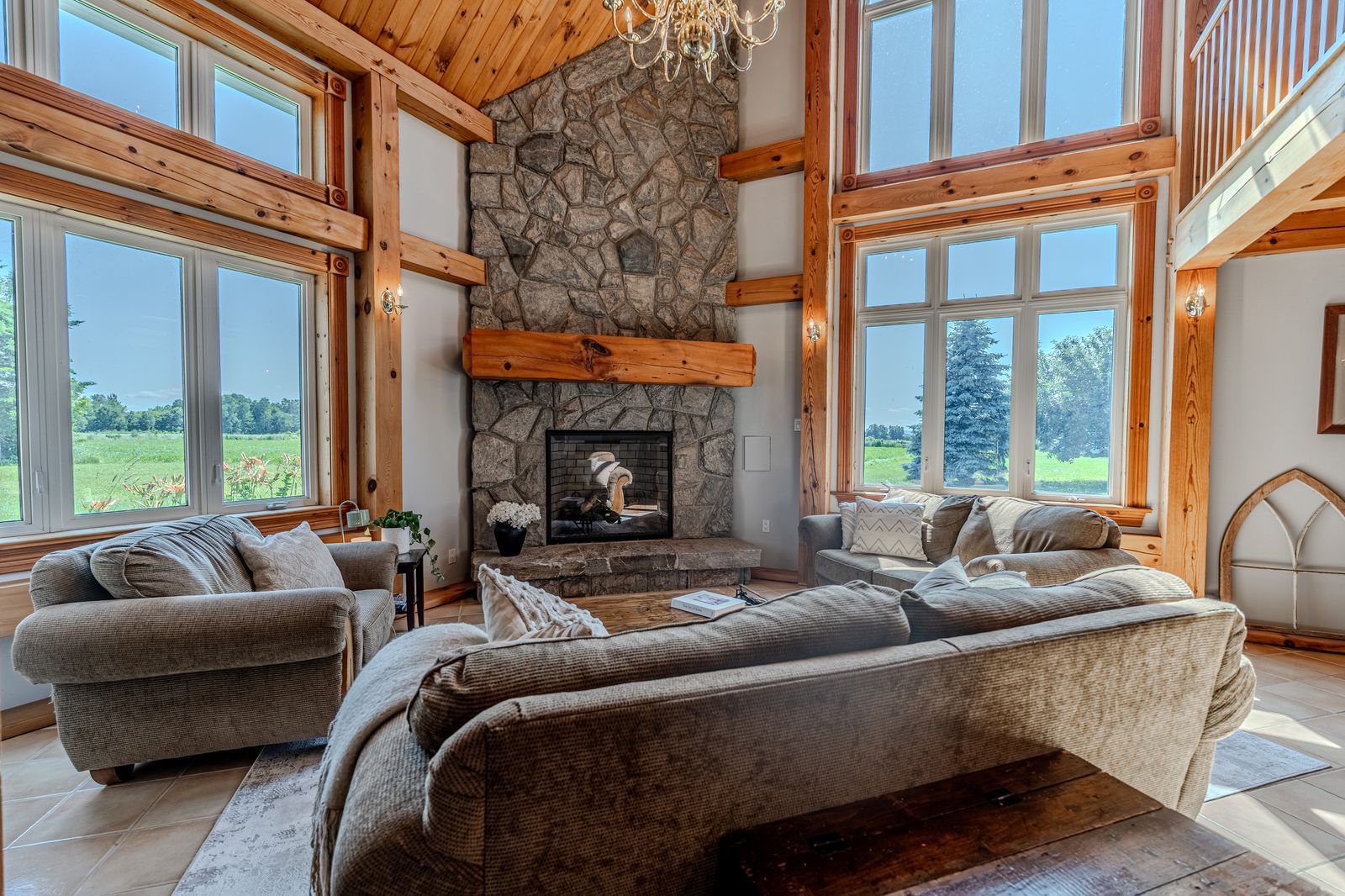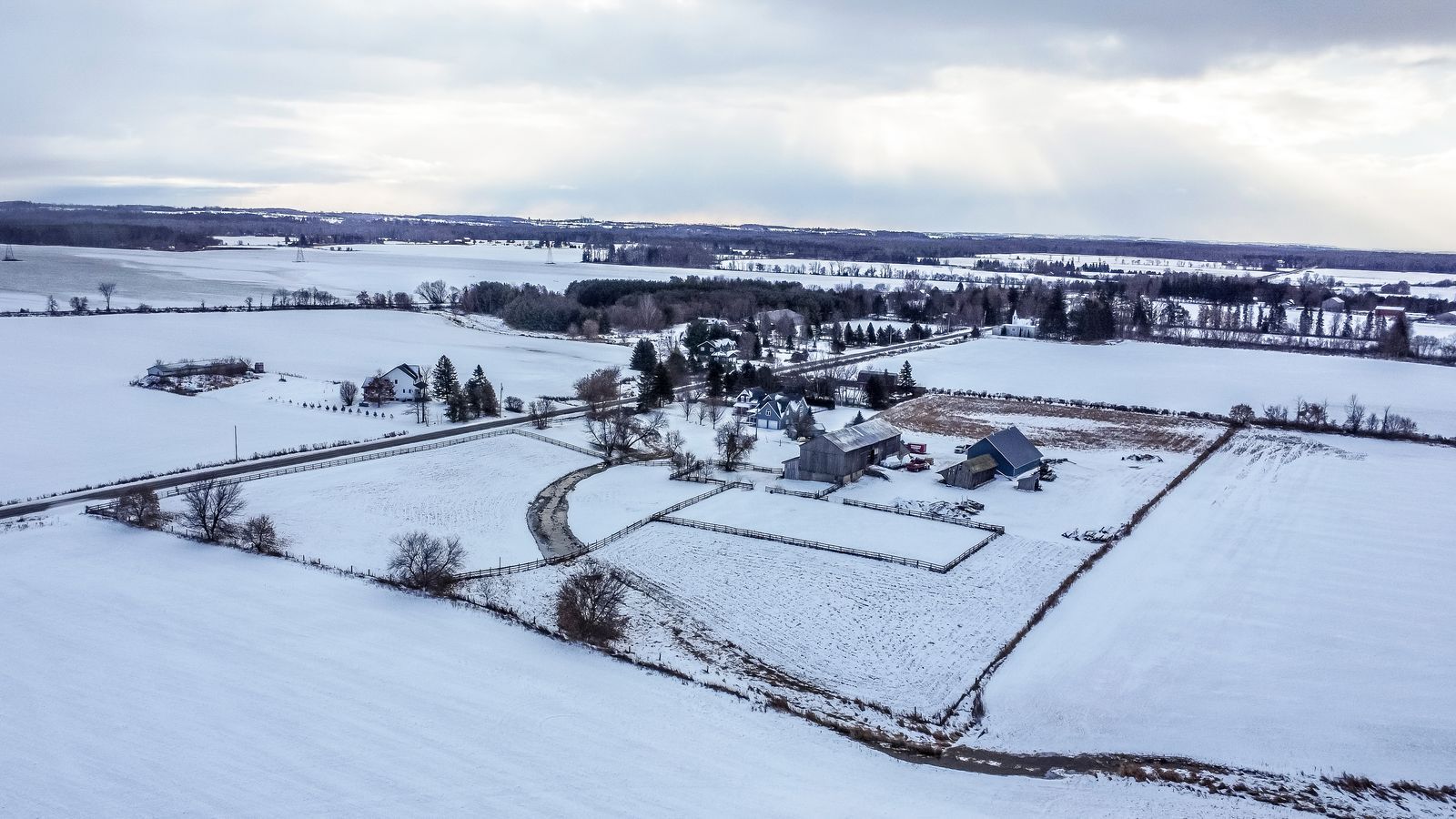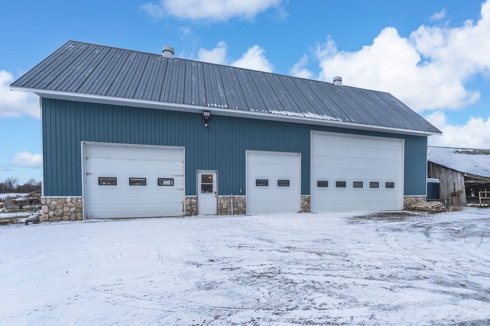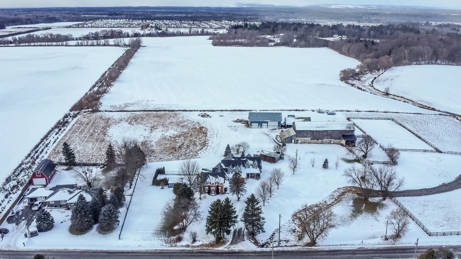 Timber-frame estate on 10 acres with inground pool, expansive barn, versatile outbuildings, & a 4,544 sq ft home built to impress! Call it a farmhouse if you want, but this 10-acre estate works harder than most properties ever will, with outbuildings built to perform and a 4,544 sq ft home that redefines rural craftsmanship. Anchoring the property is a 4,500 sq ft barn with box stalls, paddocks, and tack space, a heated 62 x 38 ft saltbox-style workshop, an 18 x 28 ft drive shed, multiple accessory buildings, and a two-car garage, perfect for home-based businesses, contractors, or equestrian enthusiasts. The home stands among open fields and mature trees, showcasing steep gables, brick and board-and-batten siding, an updated steel roof, and an outdoor retreat with an inground saltwater 20 x 40 ft pool, a pool house with a shower and change room, and a timber-framed covered patio. The great room showcases true timber-frame craftsmanship, with soaring wood-plank ceilings, expansive arched windows, and a floor-to-ceiling stone fireplace crowned by a wood mantle and chandelier, and in-floor radiant heat throughout most of the home. Handcrafted wood cabinets, stone counters, open shelving, and a large island with an apron sink make the kitchen the perfect gathering place, while the breakfast nook invites casual mornings and the formal dining room provides an elegant setting with a fireplace and patio access. A main-floor office offers a dedicated workspace, while upstairs, a billiards room with vaulted ceilings and arched windows overlooks the great room and flows into a large family/games area. The primary suite enjoys its own private wing, accessed by a separate staircase, with a walk-in closet and ensuite featuring a jetted tub. Every part of this estate, from the surrounding acreage to the timber-frame home and equipped outbuildings, is ready to support a lifestyle of work, recreation, and country living at its finest.