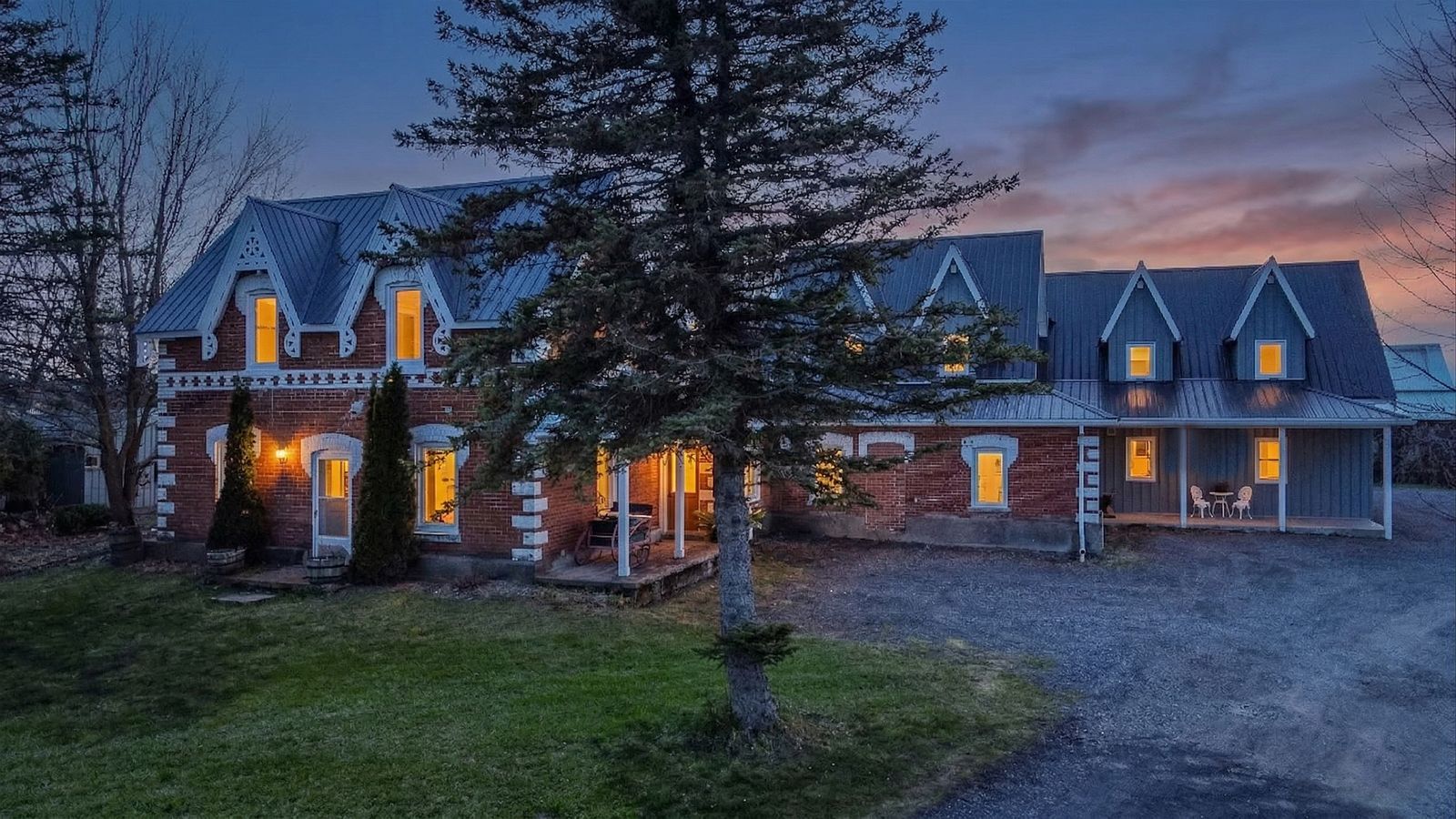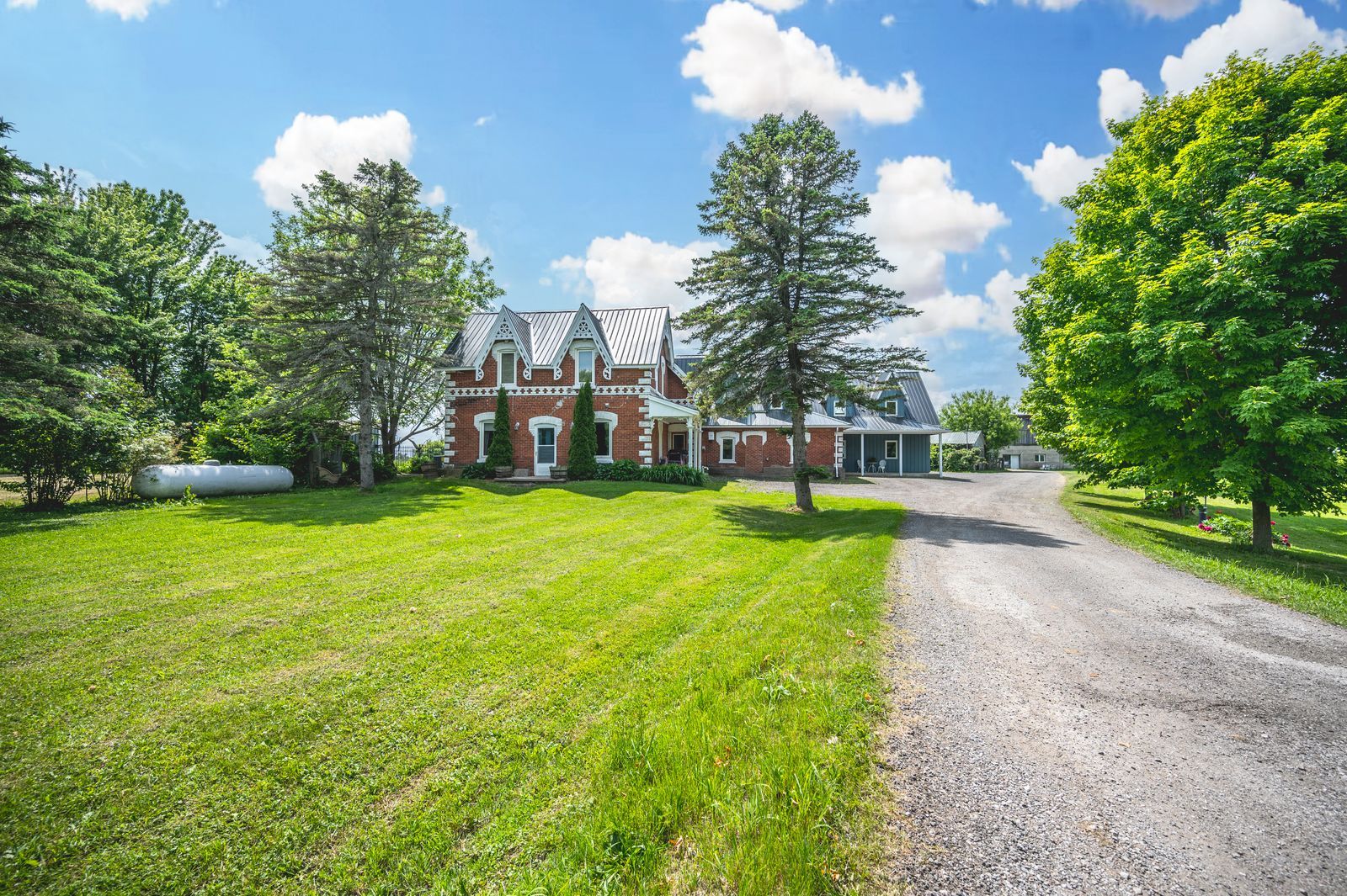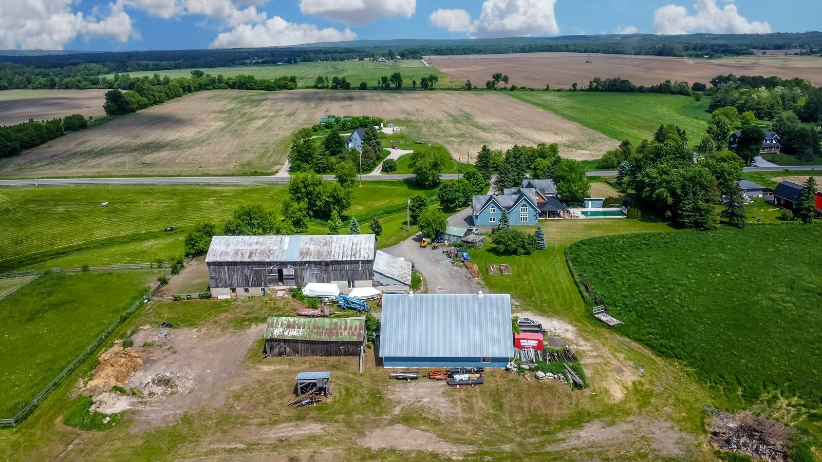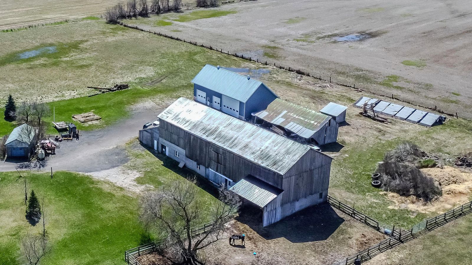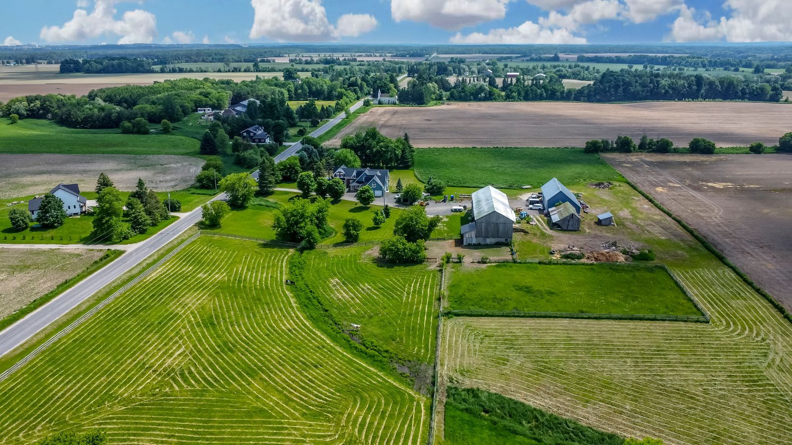 Timber-frame estate on 10 acres with inground pool, expansive barn, versatile outbuildings, & a 4,544 sq ft home built to impress! Call it a farmhouse if you want, but this 10-acre estate works harder than most properties ever will, with outbuildings built to perform and a 4,544 sq ft home that redefines rural craftsmanship. Anchoring the property is a 4,500 sq ft barn with box stalls, paddocks, and tack space, a heated 62 x 38 ft saltbox-style workshop, multiple accessory buildings, and a two-car garage, perfect for home-based businesses, contractors, or equestrian enthusiasts. The home stands among open fields and mature trees, showcasing steep gables, brick and board-and-batten siding, an updated steel roof, and an outdoor retreat with an inground saltwater 20 x 40 ft pool, a pool house with a shower and change room, and a timber-framed covered patio. The great room showcases true timber-frame craftsmanship, with soaring wood-plank ceilings, expansive arched windows, and a floor-to-ceiling stone fireplace crowned by a wood mantle and chandelier, and in-floor radiant heat throughout most of the home. Handcrafted wood cabinets, stone counters, open shelving, and a large island with an apron sink make the kitchen the perfect gathering place, while the breakfast nook invites casual mornings and the formal dining room provides an elegant setting with a fireplace and patio access. A main-floor office offers a dedicated workspace, while upstairs, a billiards room with vaulted ceilings and arched windows overlooks the great room and flows into a large family/games area. The primary suite enjoys its own private wing, accessed by a separate staircase, with a walk-in closet and ensuite featuring a jetted tub. Every part of this estate, from the surrounding acreage to the timber-frame home and equipped outbuildings, is ready to support a lifestyle of work, recreation, and country living at its finest.