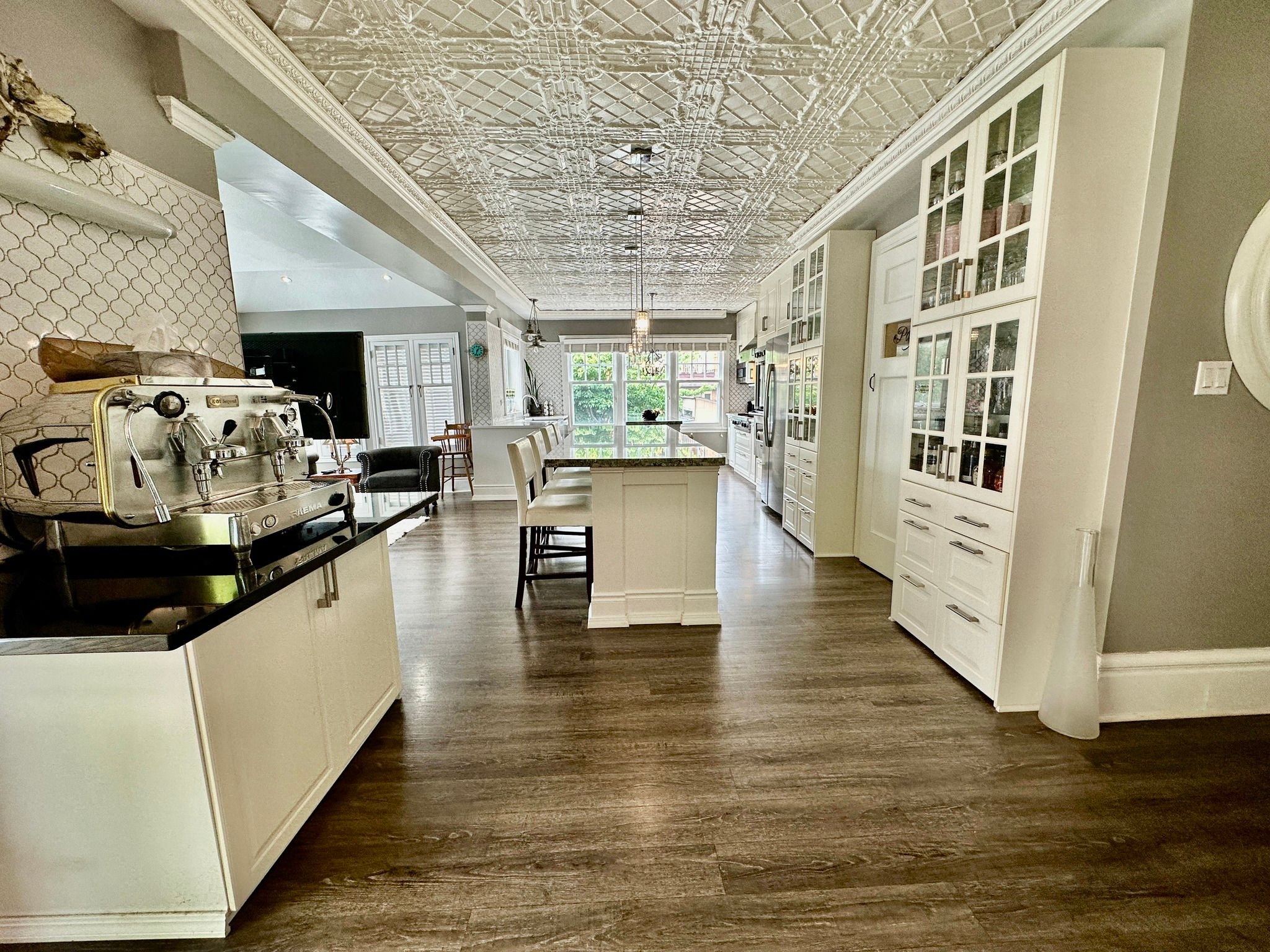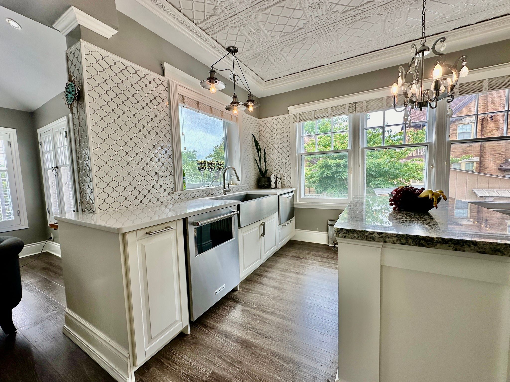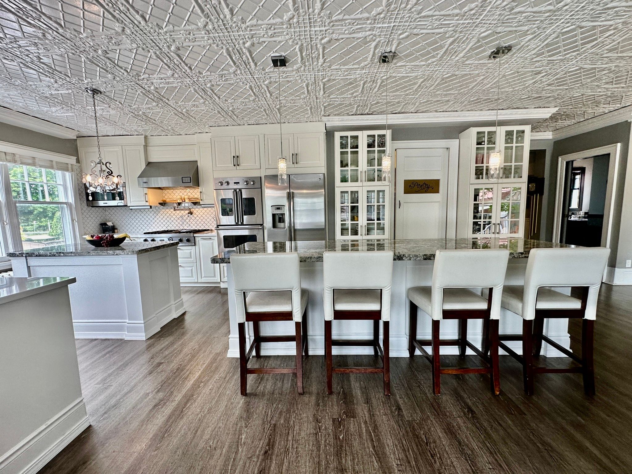• Modern chef-style kitchen with granite countertops and inviting sitting area.