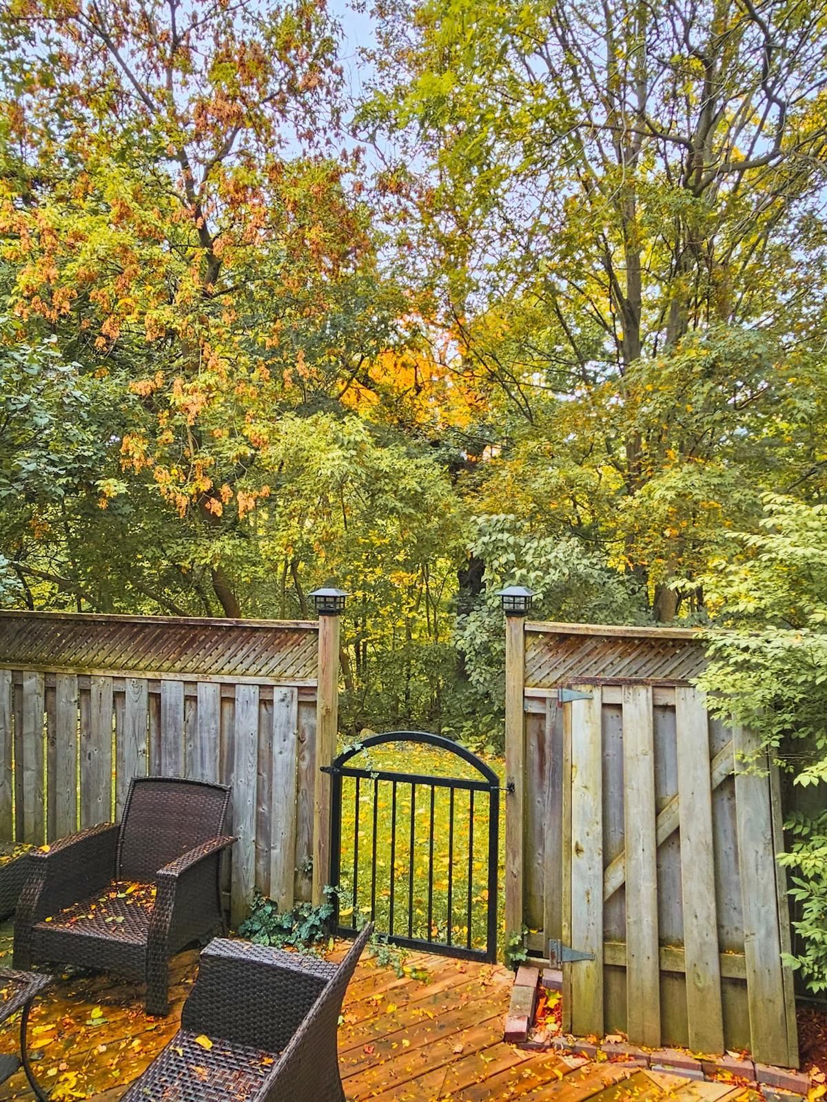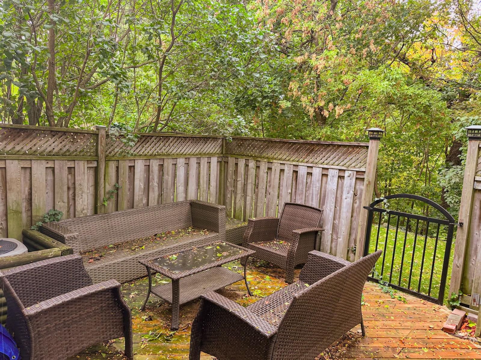 • Spacious living room leading to a deck and fenced yard overlooking a ravine.
