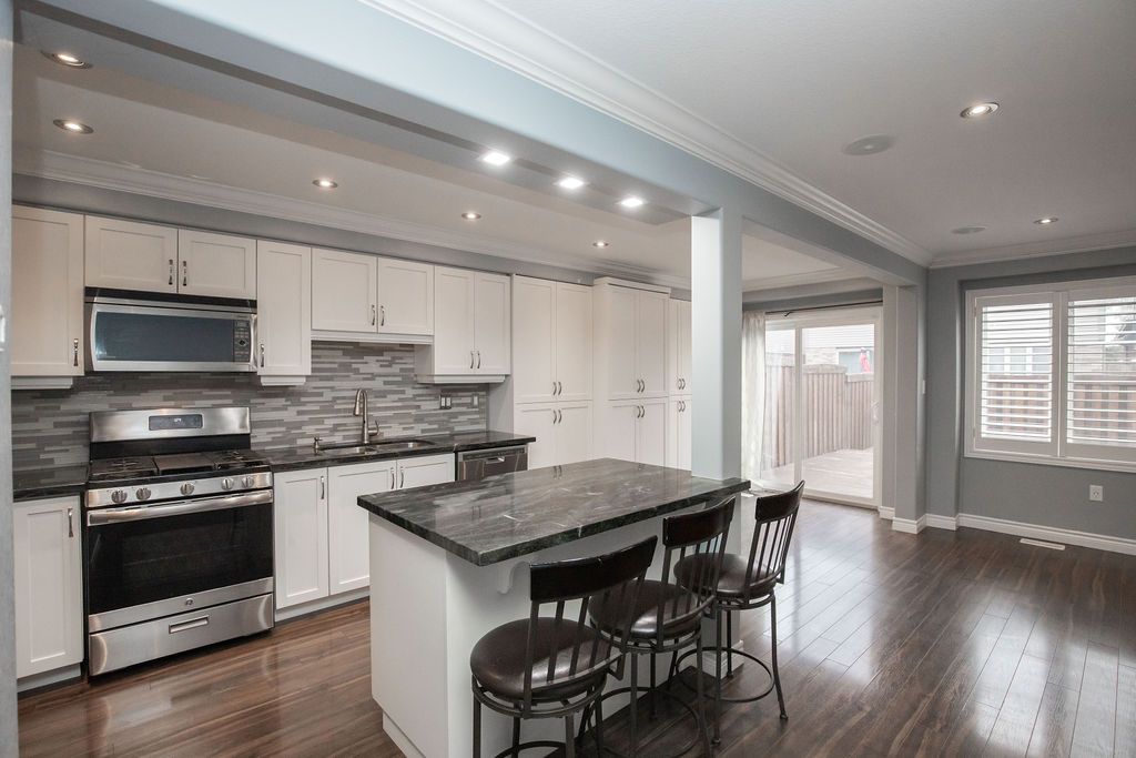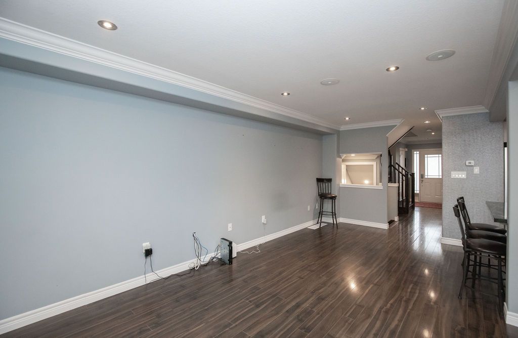 Gorgeous freehold townhome, no condo fees! Stunning freehold townhome offers large rooms, open concept, loads of upgrades, pot lights, laminate floors, granite countertops, crown moulding, extended full-size pantry, exposed concrete driveway, finished basement, camera system, and a full backyard deck. Close to schools, parks, shopping, buses, and easy access to linc.