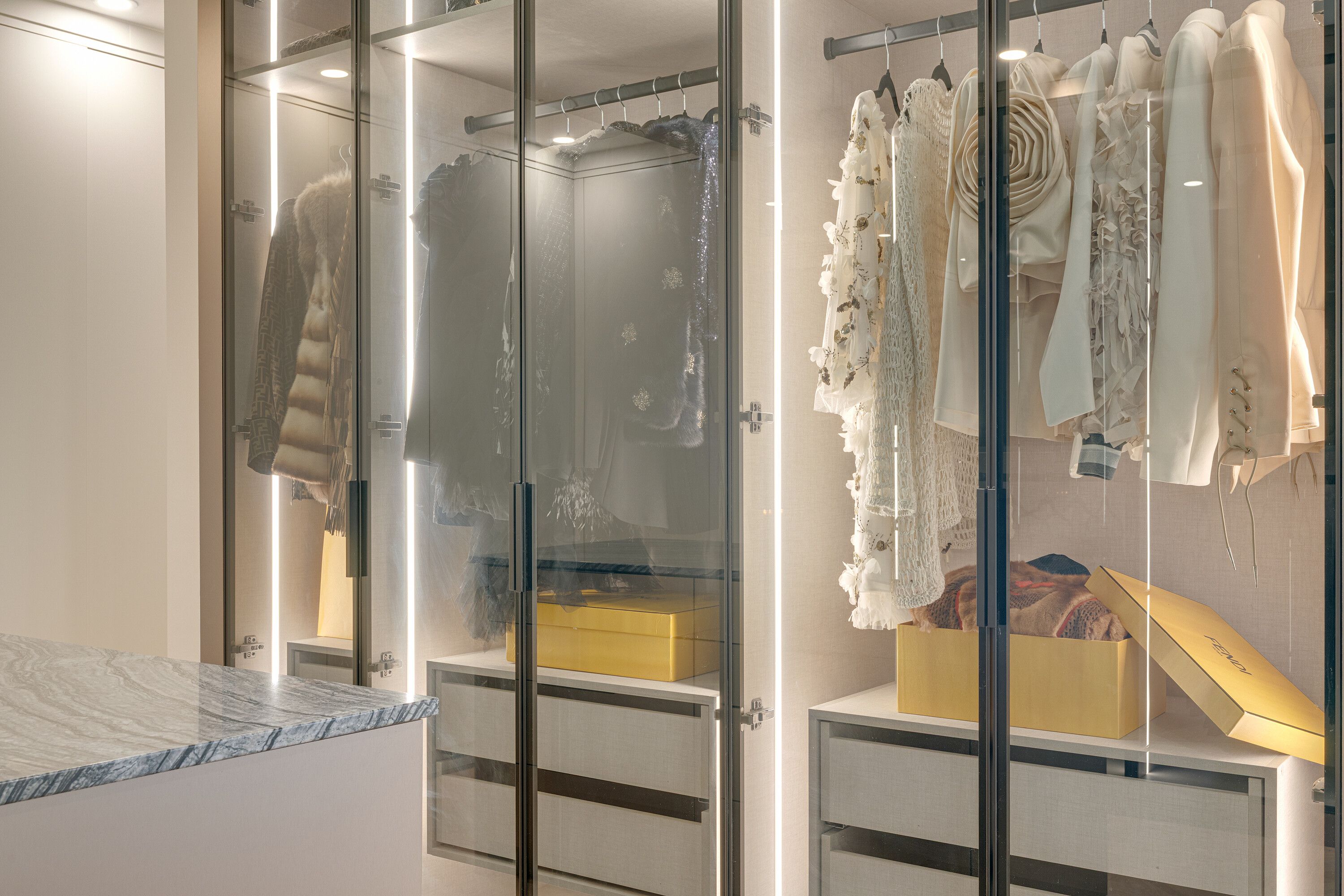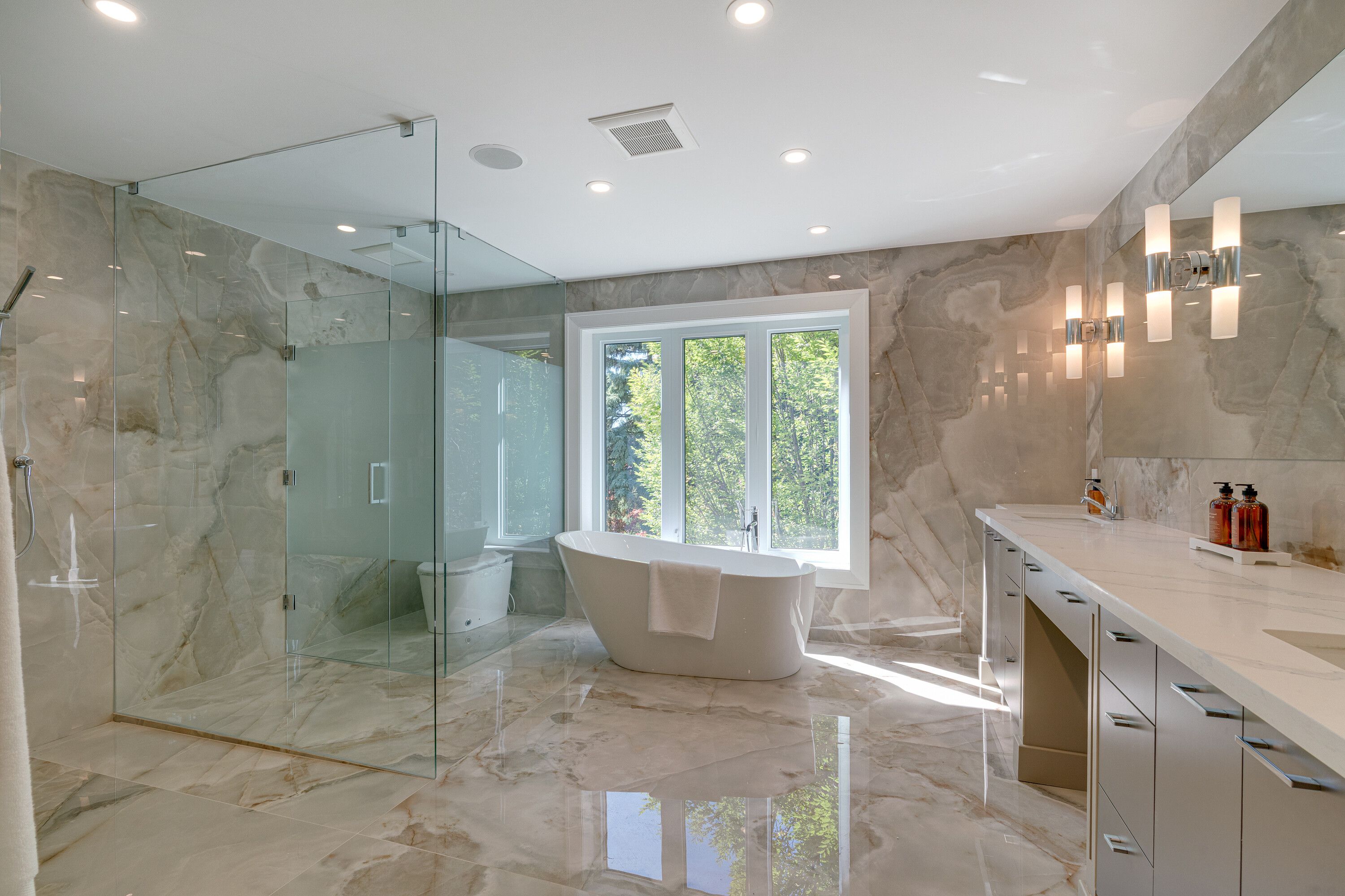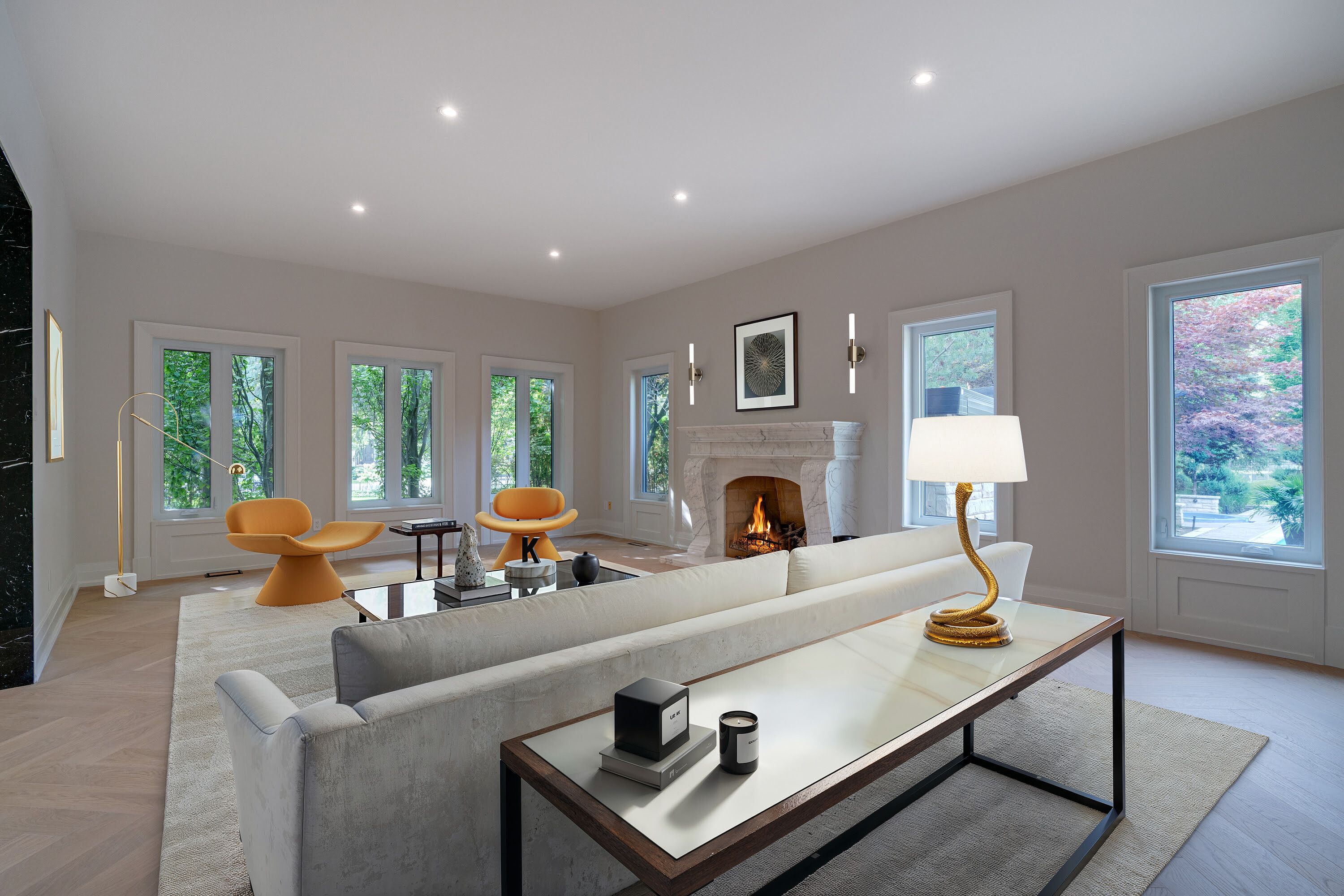• Elegant interior features slab stone finishes and marble fireplaces.