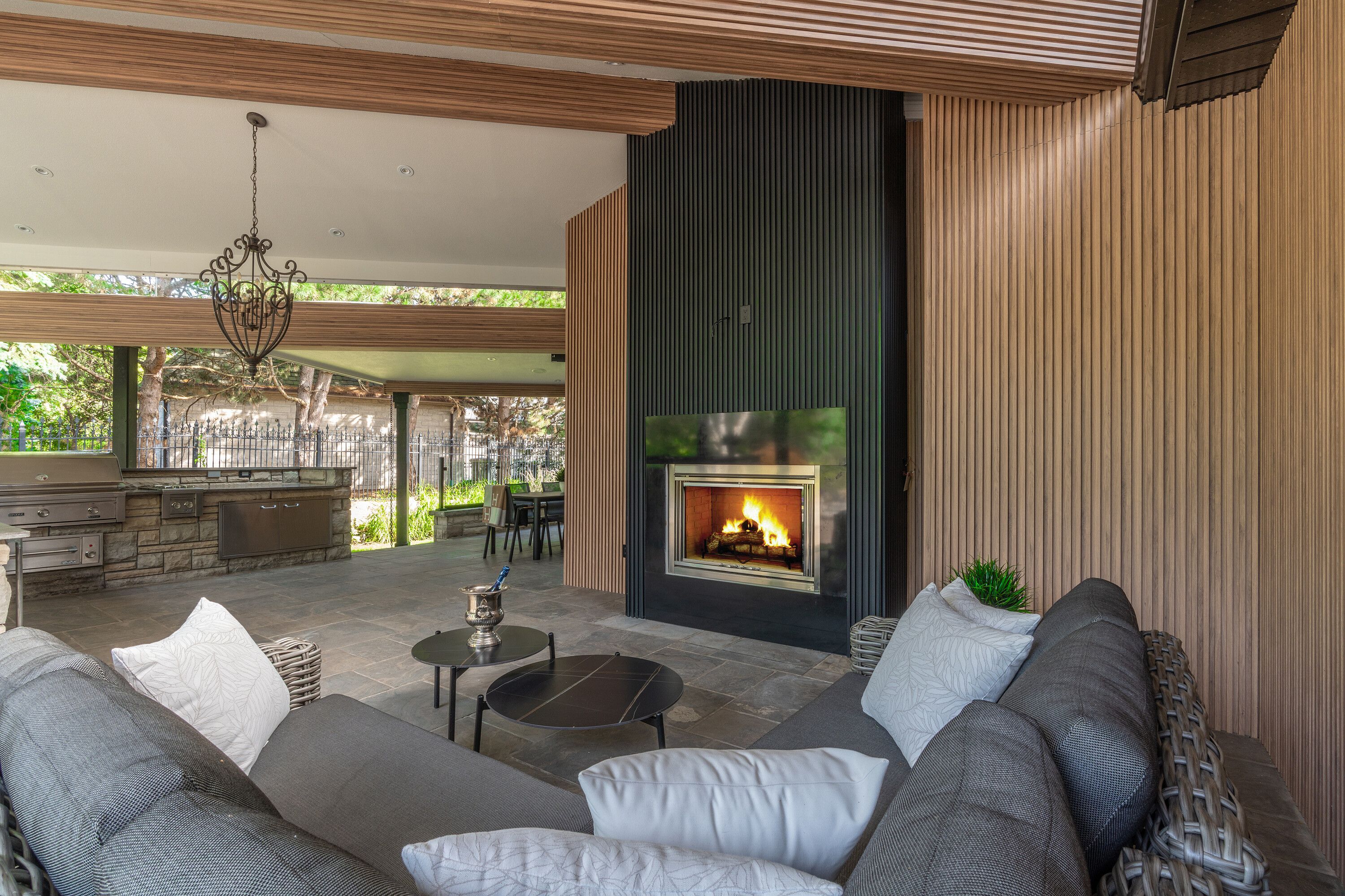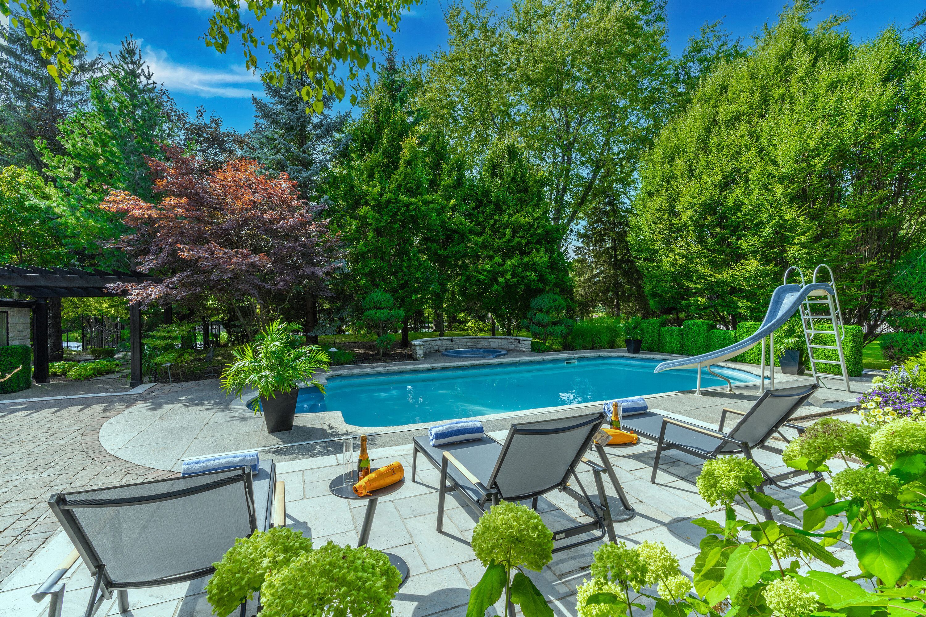 • Resort-style backyard with inground pool and outdoor kitchen.