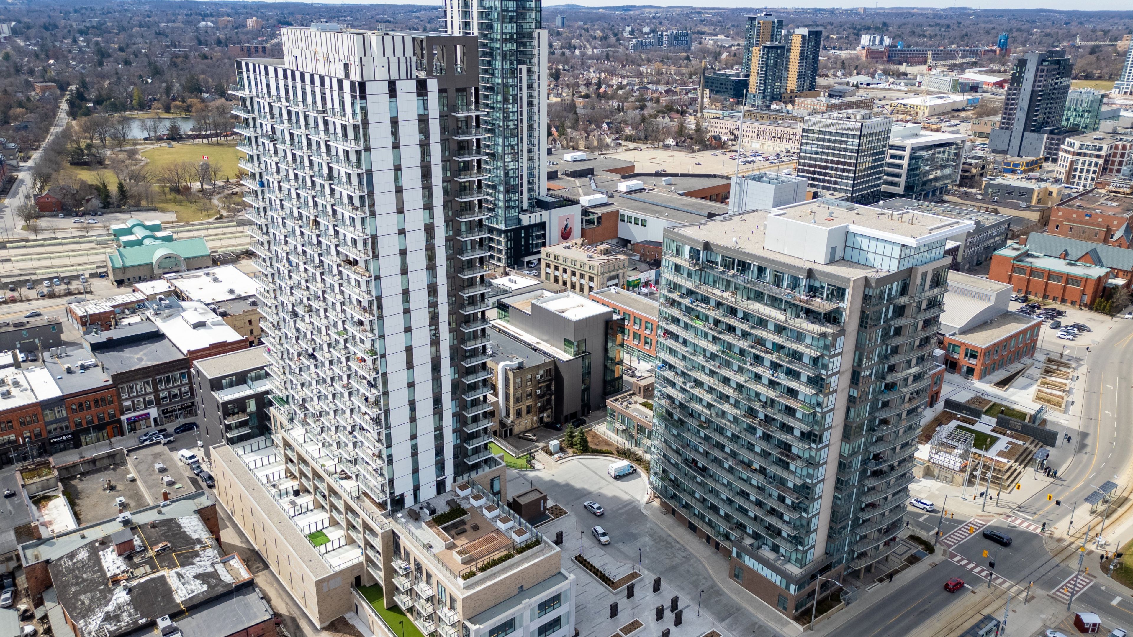 This very conveniently located home downtown kitchener is priced to sell! Walkout from hall. This cute and perfectly situated unit doesn't feel like a highrise. Large balcony offers view of piazza behind city hall with park like setting. Spacious unit offers easy access from the street with no stairs to walk! Extra large balcony feels like you're truly part of the neighborhood! This newer building includes party room, shared rooftop patio with one parking spot underground. Large locker just down the hall from your door:) full time concierge onsite ensures security and convenience while public transit like ion are steps from your front door. This one might not last long folks so book your private viewing today for a full tour of this beautiful building! Access to gym, personal workspaces in sister building included.