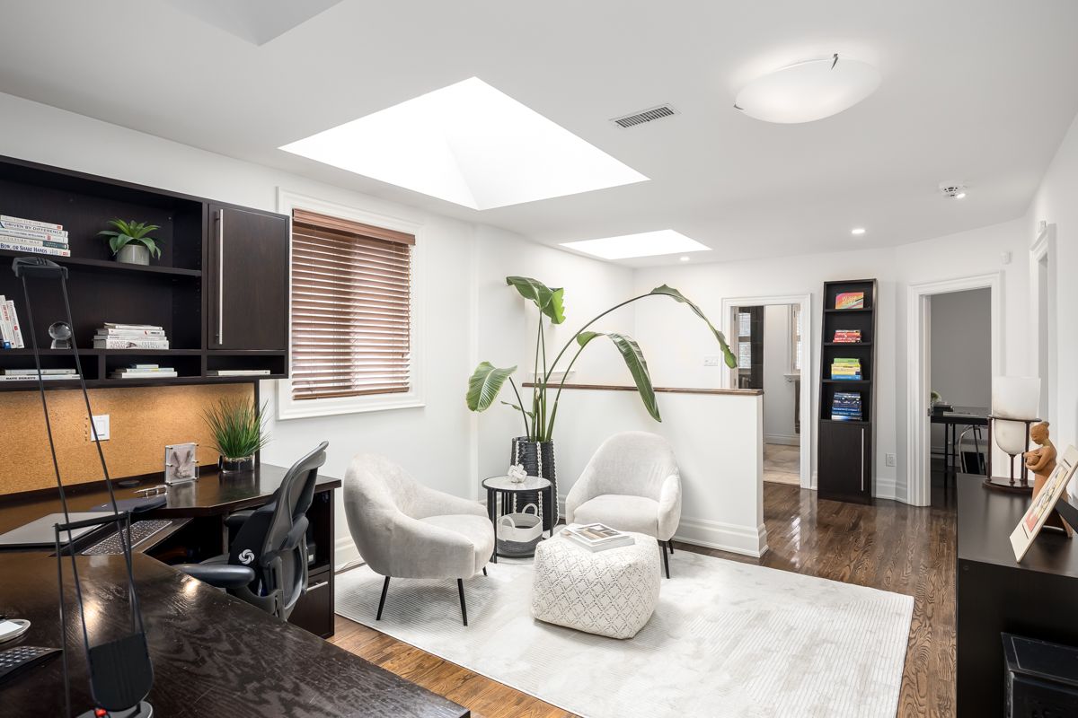 Welcome to 85 kimbark blvd, a beautifully maintained and inviting home nestled in one of the city's most sought-after neighbourhoods. This charming residence offers a seamless blend of timeless design, modern comfort, and exceptional functionality, featuring three spacious bedrooms and thoughtfully designed living spaces- ideal for families and professionals alike. The bright, airy interior is enhanced by expansive windows that fill the home with natural light, creating a warm and welcoming atmosphere throughout. The main floor showcases an open-concept living, kitchen, and dining area, perfect for both everyday living and effortless entertaining. A well-appointed kitchen anchors the space, flowing into a generous family room with soaring ceilings and a rare wood-burning fireplace- adding both character and comfort. A formal dining room provides and elegant setting for hosting. On the second level, you will find well-proportioned bedrooms, including a serene and spacious principal retreat featuring a vaulted ceiling and a spa-like ensuite. An open-concept office area, illuminated by two large skylights, offers a bright and inspiring workspace for today's remote professional or creative pursuits. The fully finished lower level adds exceptional versatility, offering a large recreation room or optional fourth bedroom, a three piece bathroom, dedicated laundry, and ample storage. Set on a quiet, tree lined street, the home also features a very private backyard surrounded by mature trees- an ideal setting for outdoor relaxation and entertaining. Located just steps from top-rated schools, boutique shopping, fine dining, and convenient transit, this is a rare opportunity to own a truly special home in a prime location.
