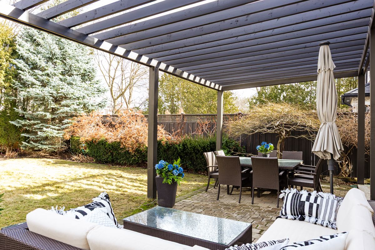 • Private backyard surrounded by trees, ideal for relaxation and gatherings.