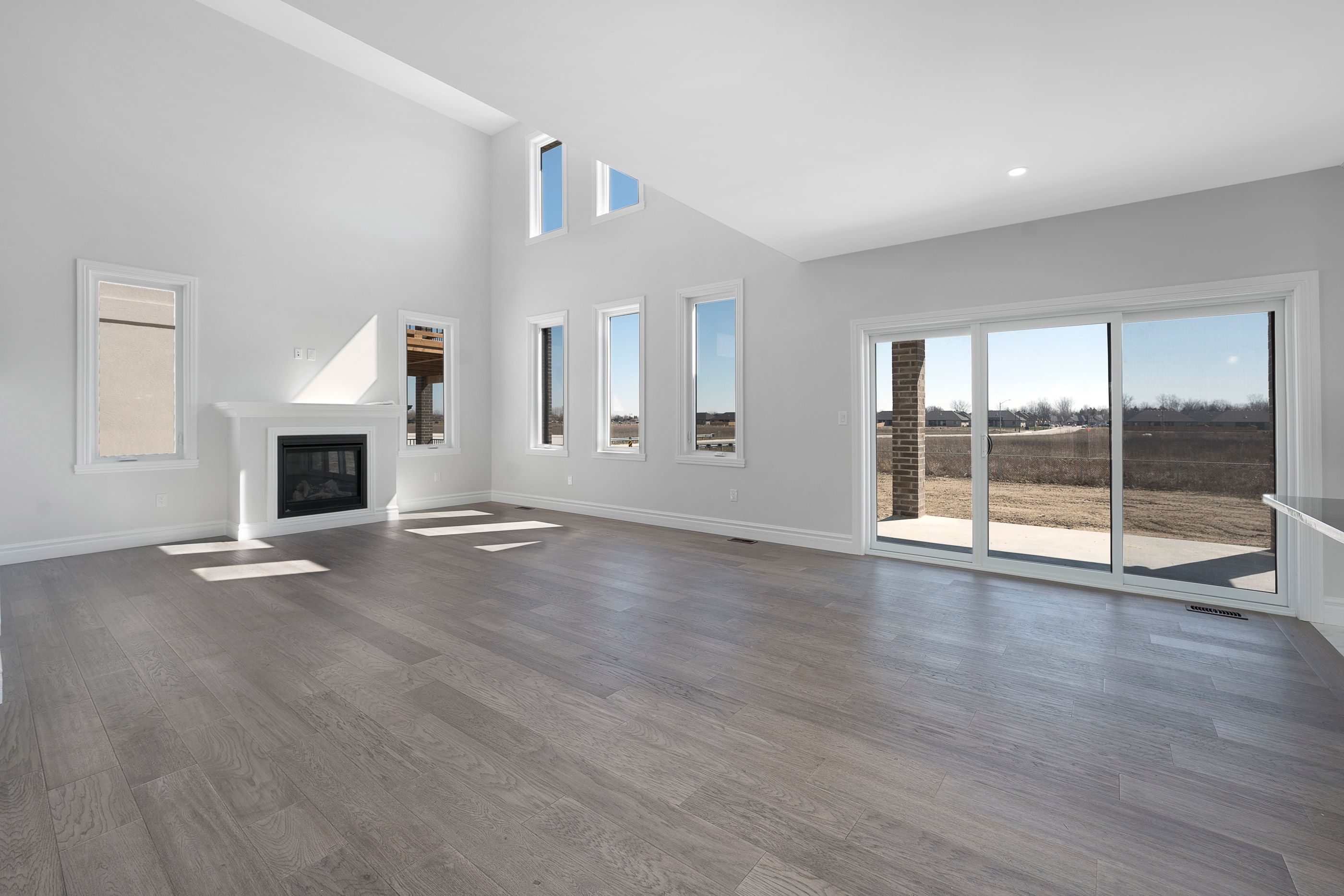 • Bright living room with 17ft ceilings and cozy gas fireplace.