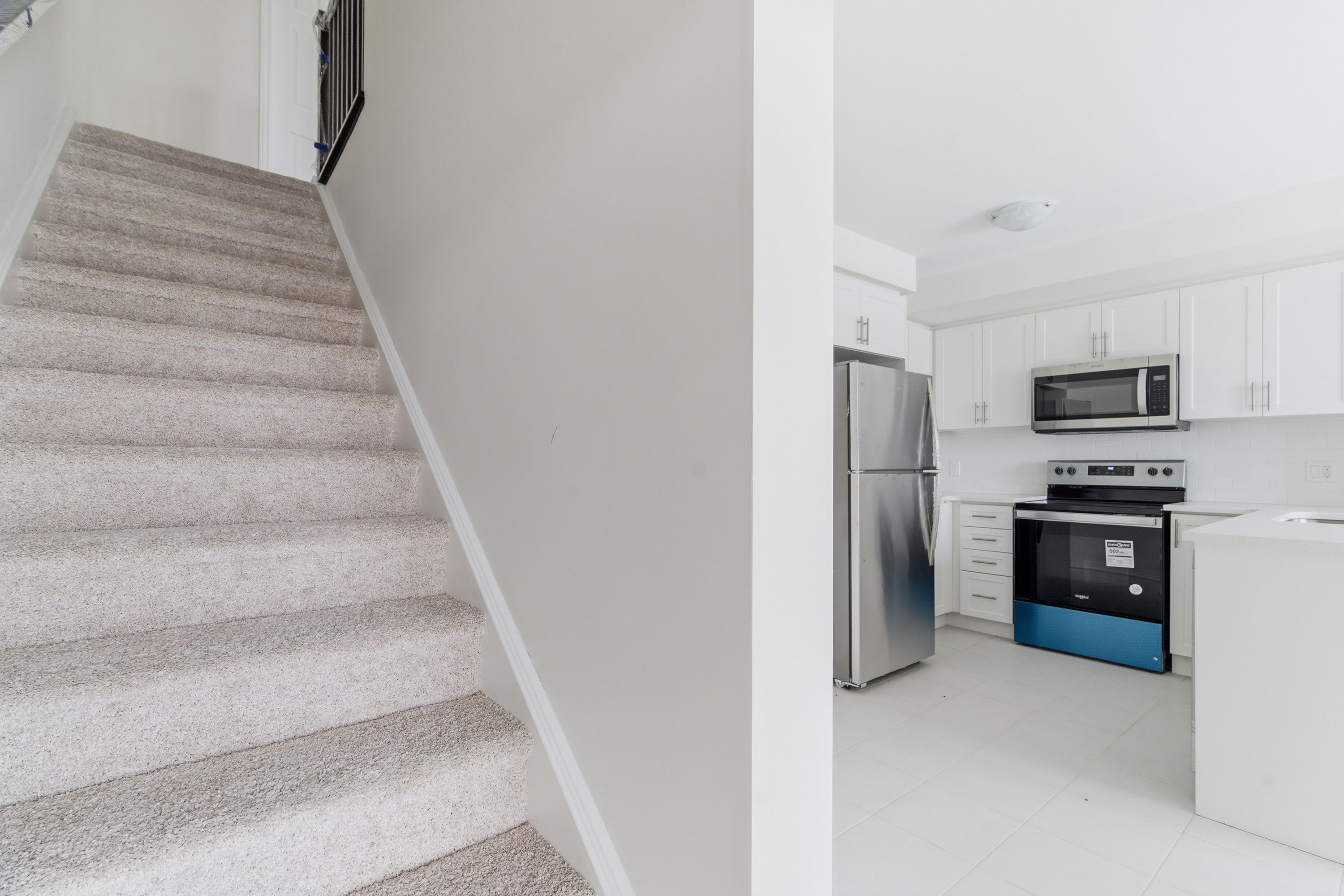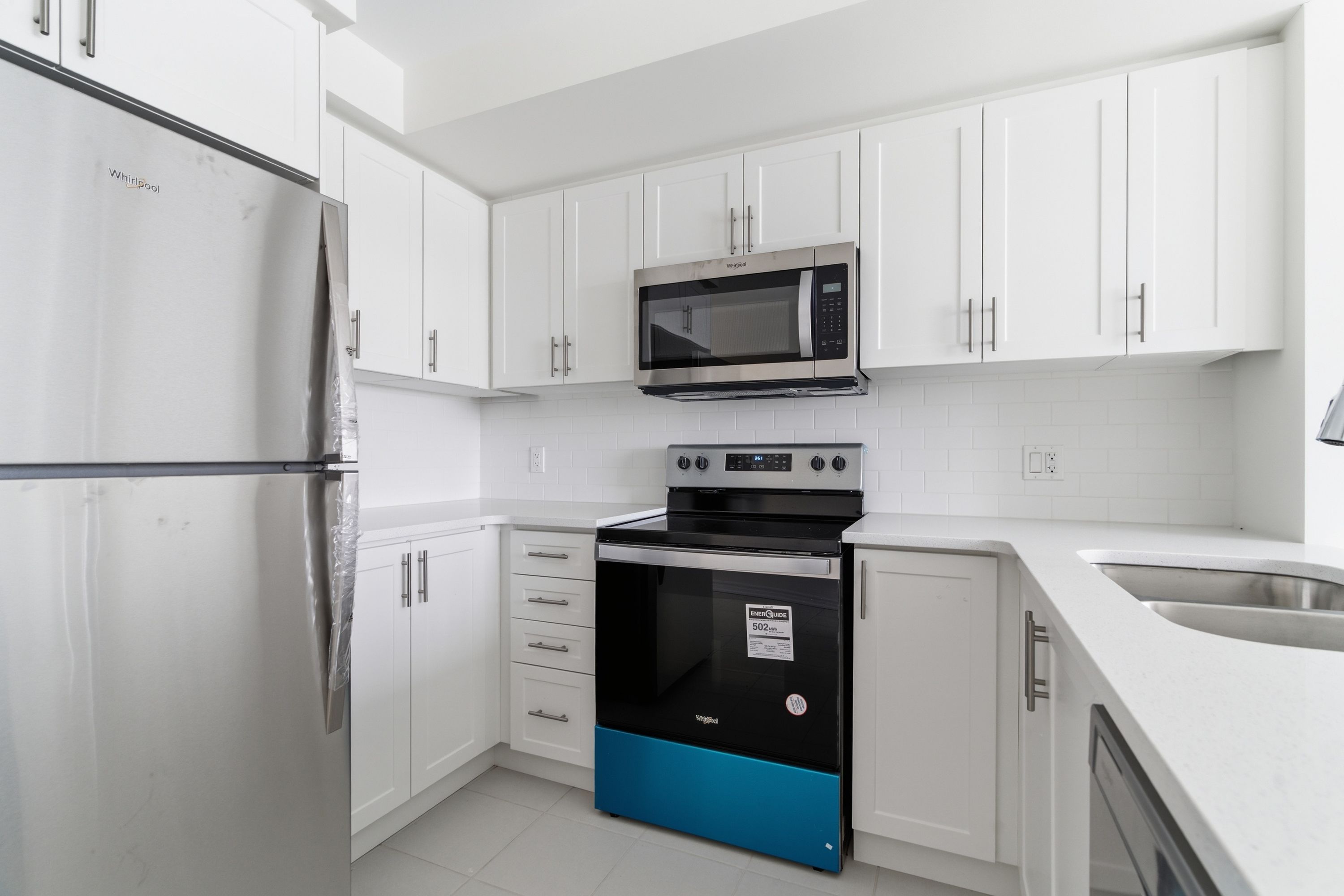 • Bright kitchen with stainless steel appliances and quartz countertops.