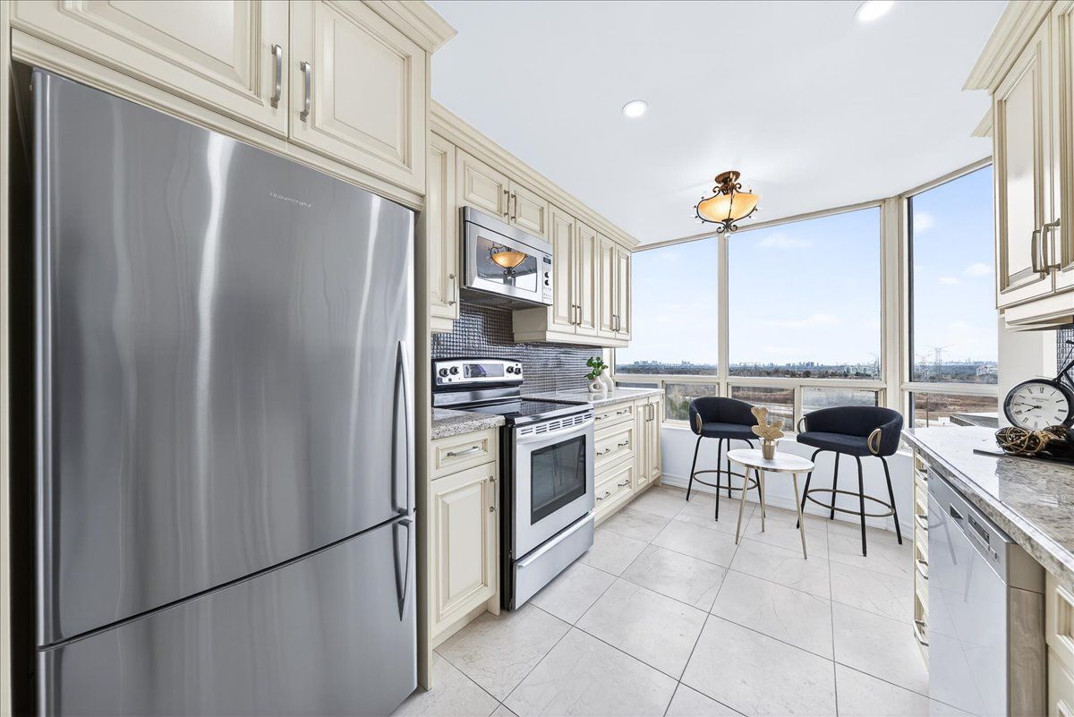 A rare opportunity to own one of the largest and most functional layouts in the building, offering exceptional space, comfort, and value. This beautifully maintained residence features a spacious 2-bedroom + large den layout with 2 full bathrooms and approximately 1,233 sq. Ft. Of well designed living space, complemented by a private balcony. The open-concept living and dining areas provide a bright and inviting setting, ideal for both everyday living and entertaining. The kitchen with breakfast area offers ample workspace and storage, making it as practical as it is inviting. The primary bedroom features a walk-in closet and full ensuite. A separate oversized laundry room adds rare in-suite storage and functionality. Maintenance fees are all-inclusive, covering heat, hydro, water, cable tv, internet, and parking - offering true convenience and predictable monthly costs. Building amenities include 24-hour concierge, indoor pool, fitness centre, sauna, squash and tennis courts, party room, and visitor parking. Prime location close to shopping, transit, highways 7, 404 & 407, mackenzie health, parks, and top-rated schools. Note: a temporary special assessment of $214. 53/month is in place until march 31, 2028. Upon completion, maintenance fees will be reduced starting april 1, 2028.
