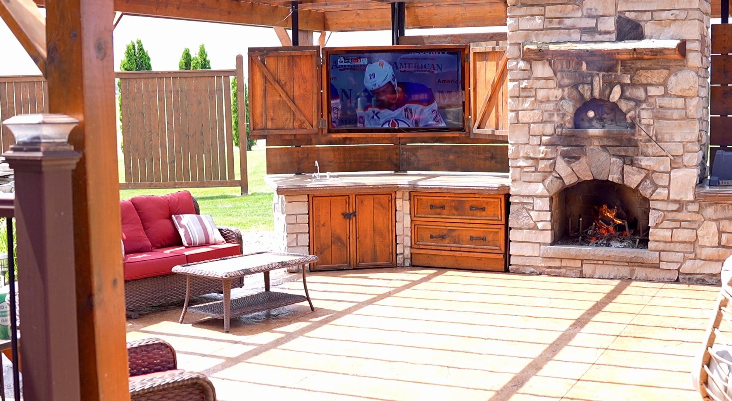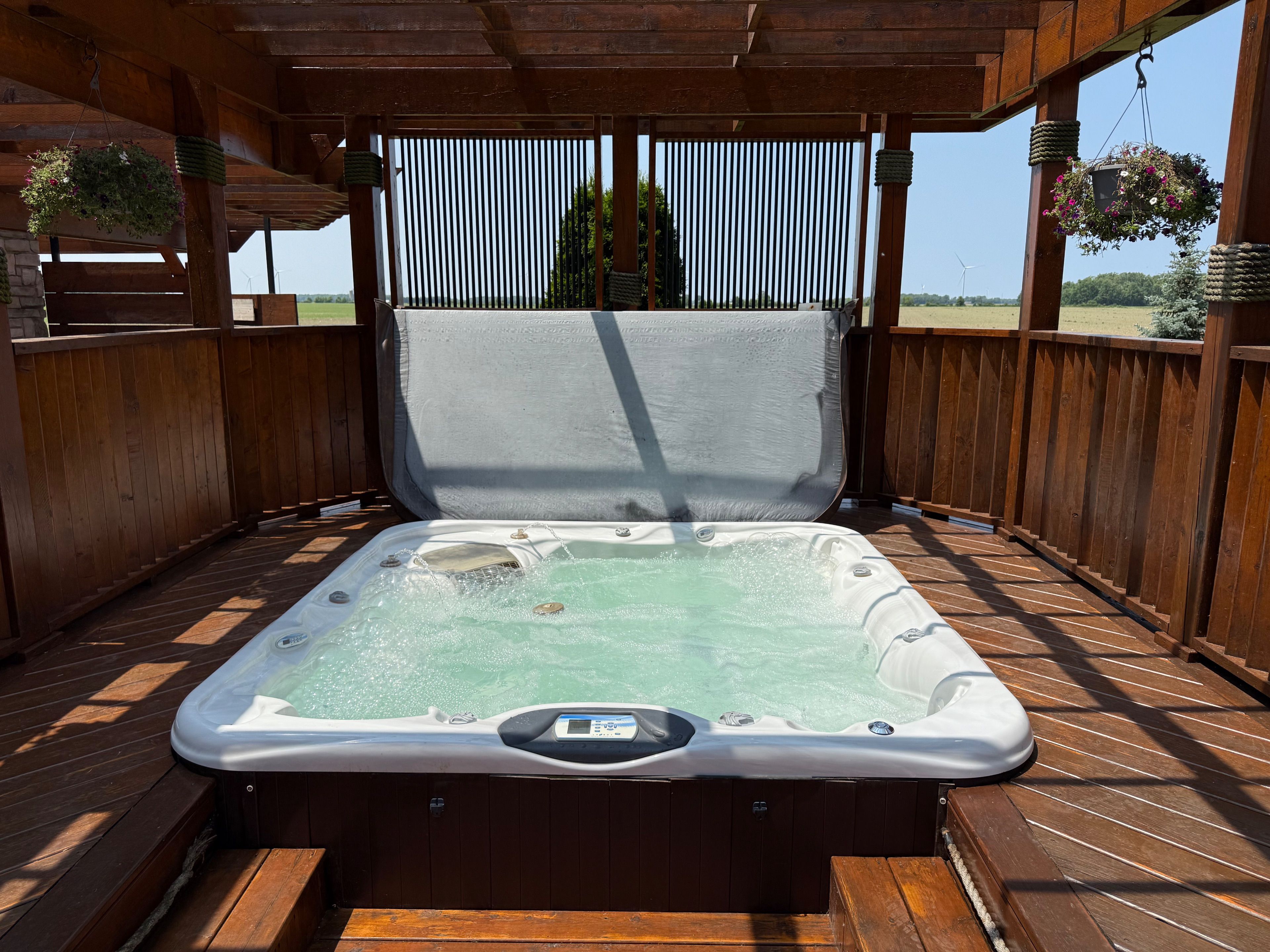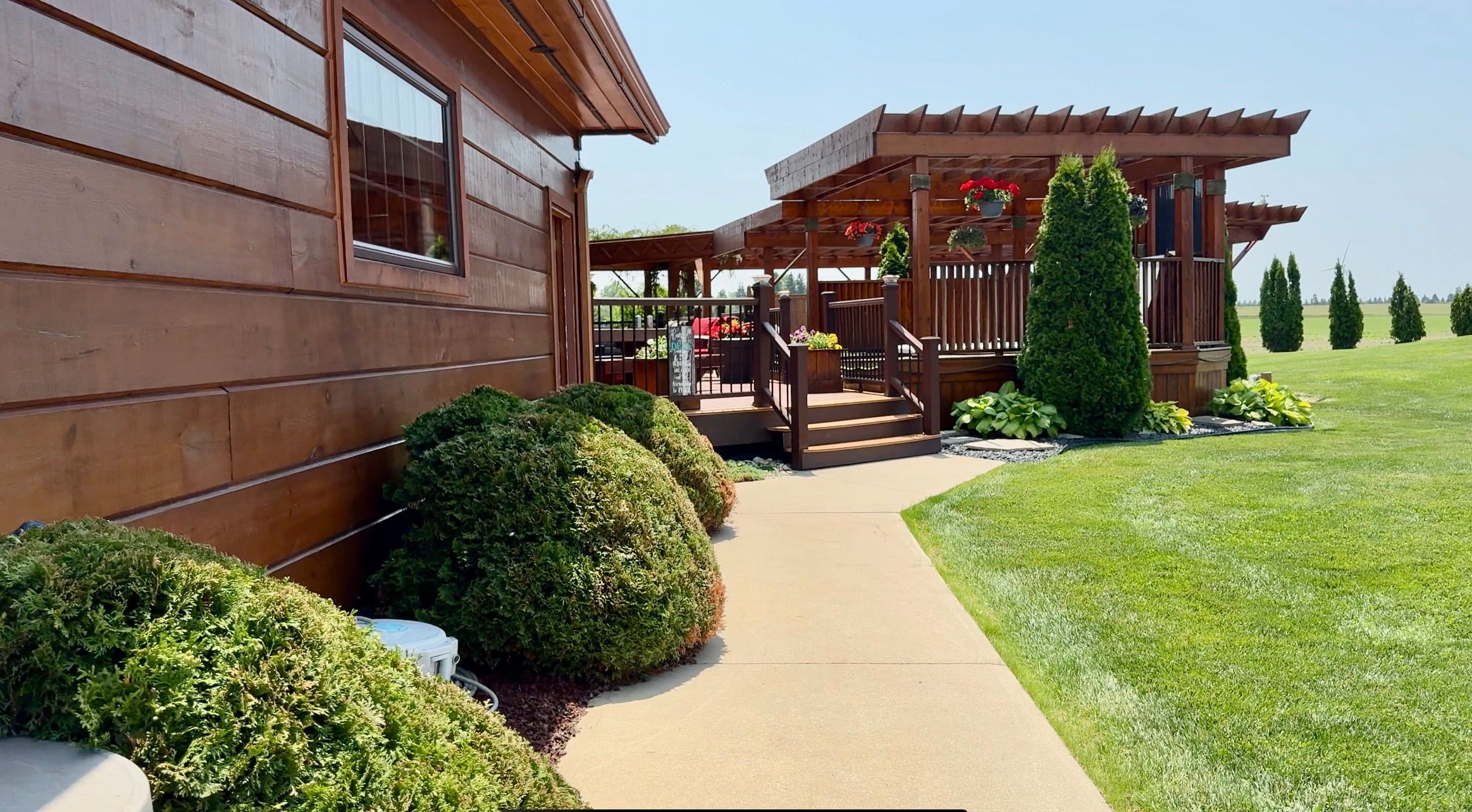 • Massive back deck with outdoor kitchen, pizza oven, and hot tub.