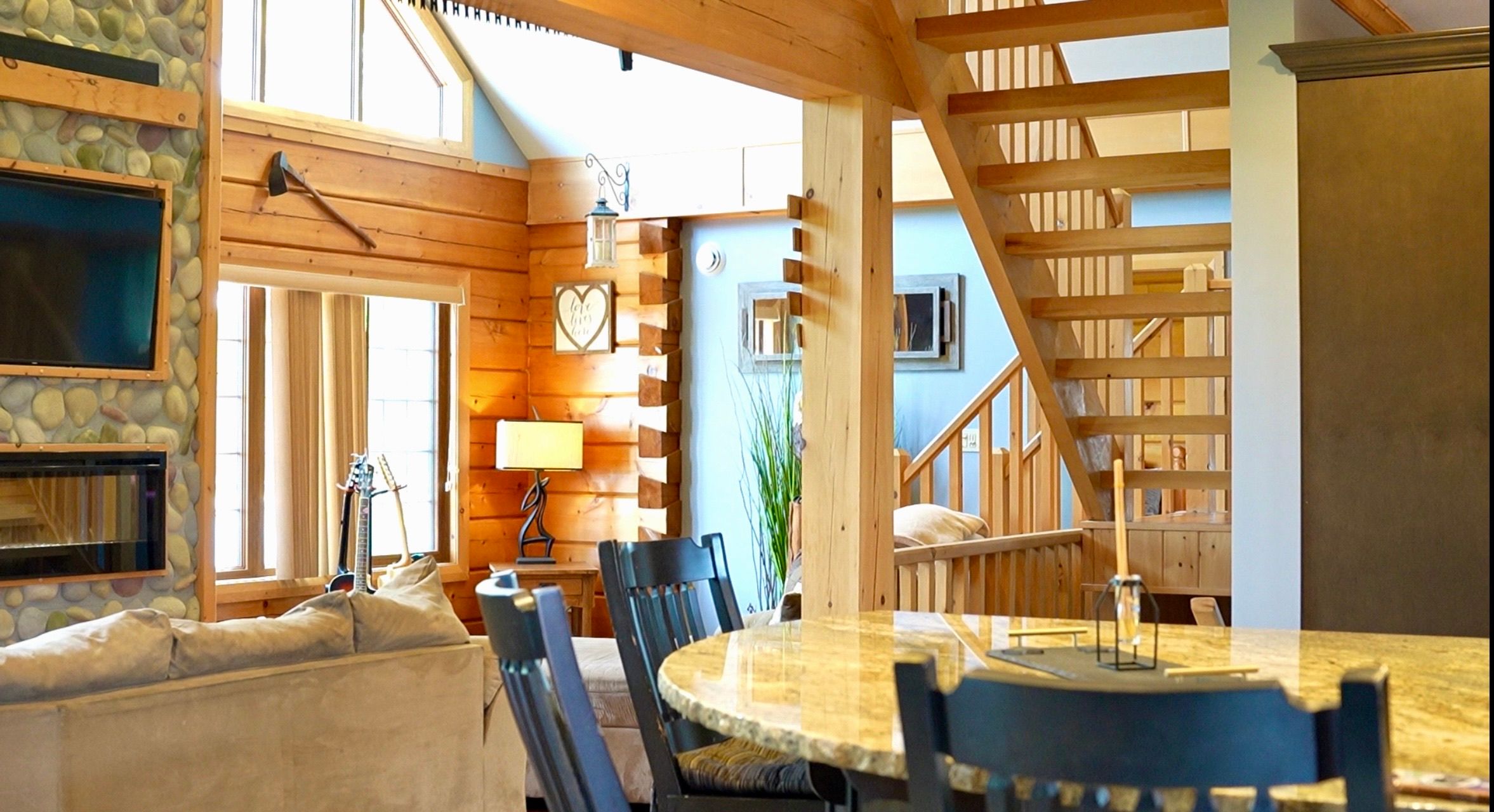 • Open-concept design with 20-foot cathedral ceilings and heated floors.
