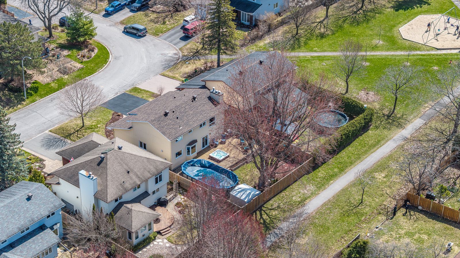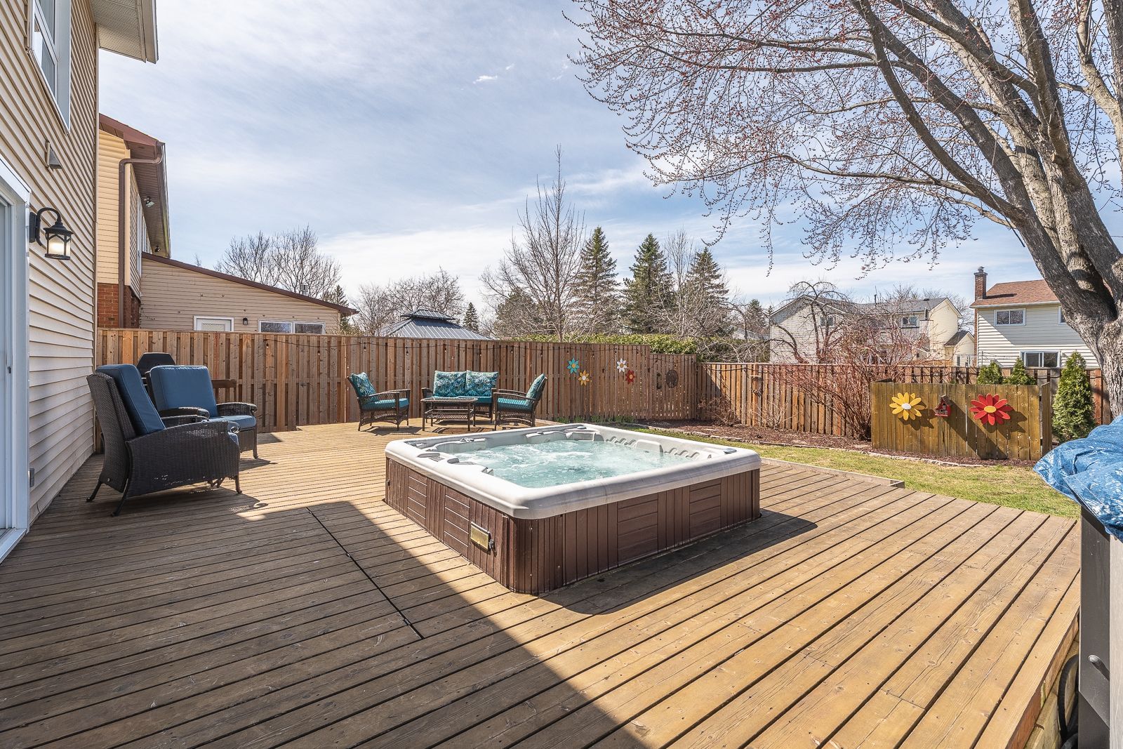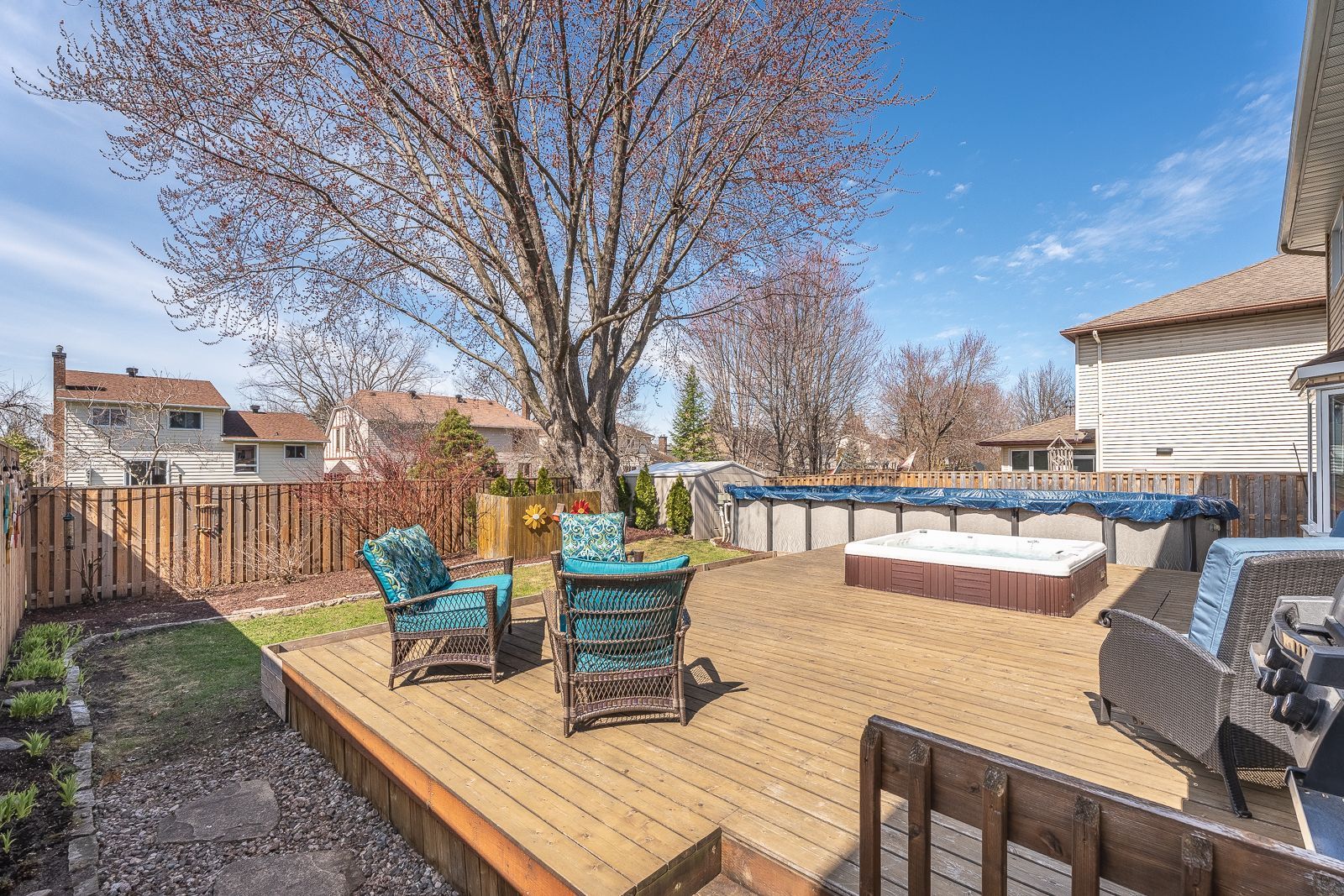 853 acadian gardens is a beautifully maintained and updated 2 storey, 4 bedroom single detached home, nestled on a quiet, local traffic only, mature tree lined crescent, backing onto parkland just steps away from the ottawa river pathway, perfect for cycling, walking, and cross-country skiing. Enjoy this practical floor plan perfect for both entertaining and everyday family living, featuring an enclosed front foyer, a custom hickory staircase and railings, formal living and dining rooms with natural finished oak floors, and a bright open concept kitchen/eating area/family room with patio doors leading to a spacious western red cedar deck. The renovated kitchen is designed for functionality, offering a breakfast bar, granite countertops, ceramic backsplash, and enhanced by pot and task lighting. The family room boasts a cozy wood burning fireplace, and the main level also includes a powder room and a laundry room/mudroom with inside access to the double attached garage. Upstairs, you'll find four generously sized bedrooms, with the primary suite featuring a wood burning fireplace, walk-in closet, and a renovated 3-piece ensuite. Three sun-filled bedrooms with hickory wood flooring throughout and a 4 piece bathroom round out the upper level. The finished lower level offers a massive recreation room with high ceilings, gym space, and a relaxing entertainment zone, as well as a large unfinished utility room with ample shelving. Step outside to your southwest facing backyard summer oasis, complete with expansive decking, hot tub, heated above ground pool and shed, fully enclosed by a stunning wood privacy fence with a rich, natural cedar tone. The home features additional updates including crown mouldings, pot lighting, modernized closet doors, and has been freshly painted in tasteful earth tones. With easy access to highway 174, amenities, reputable schools, parks, and the future lrt, this premium location offers both convenience and lifestyle - welcome home!