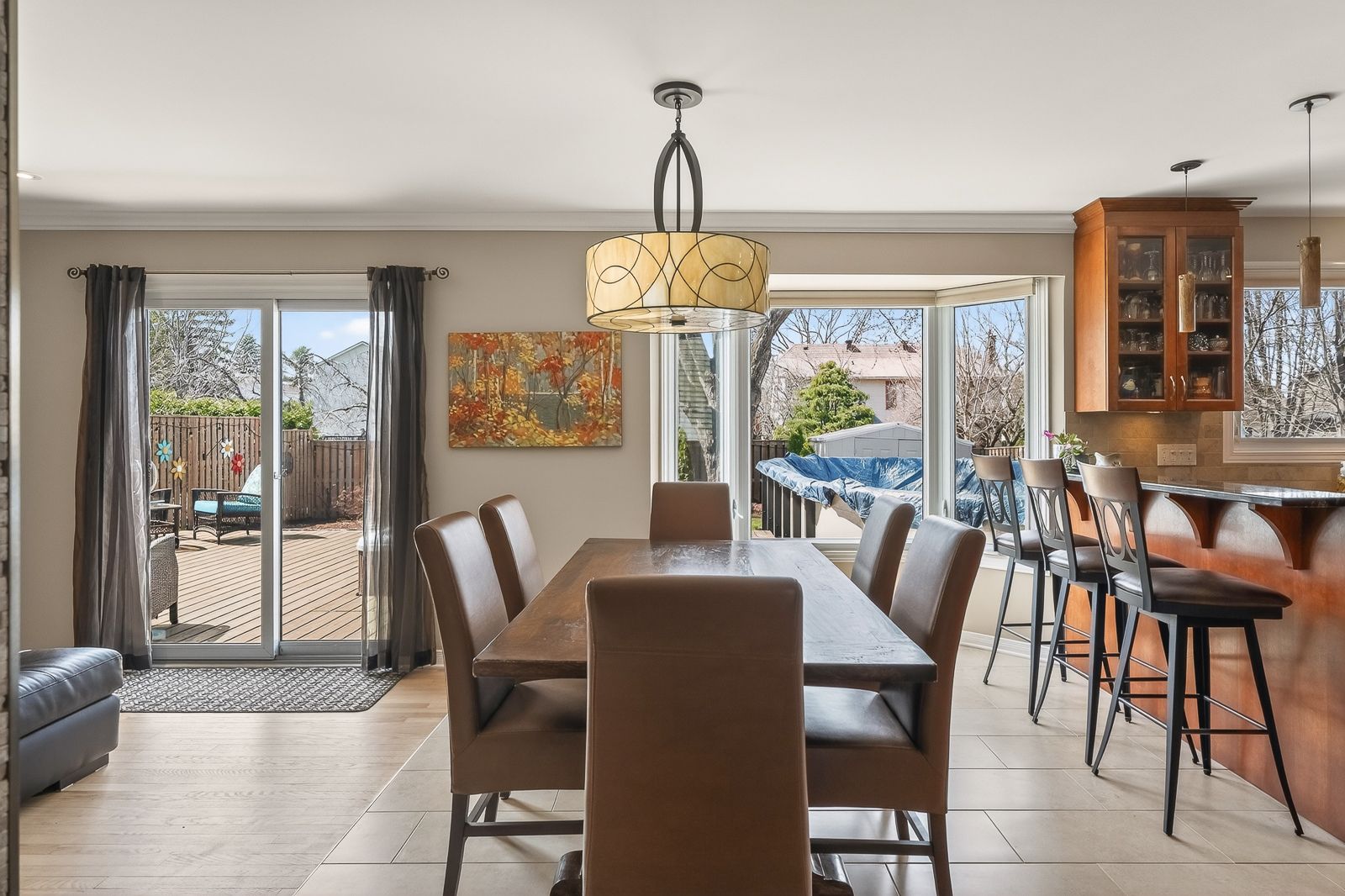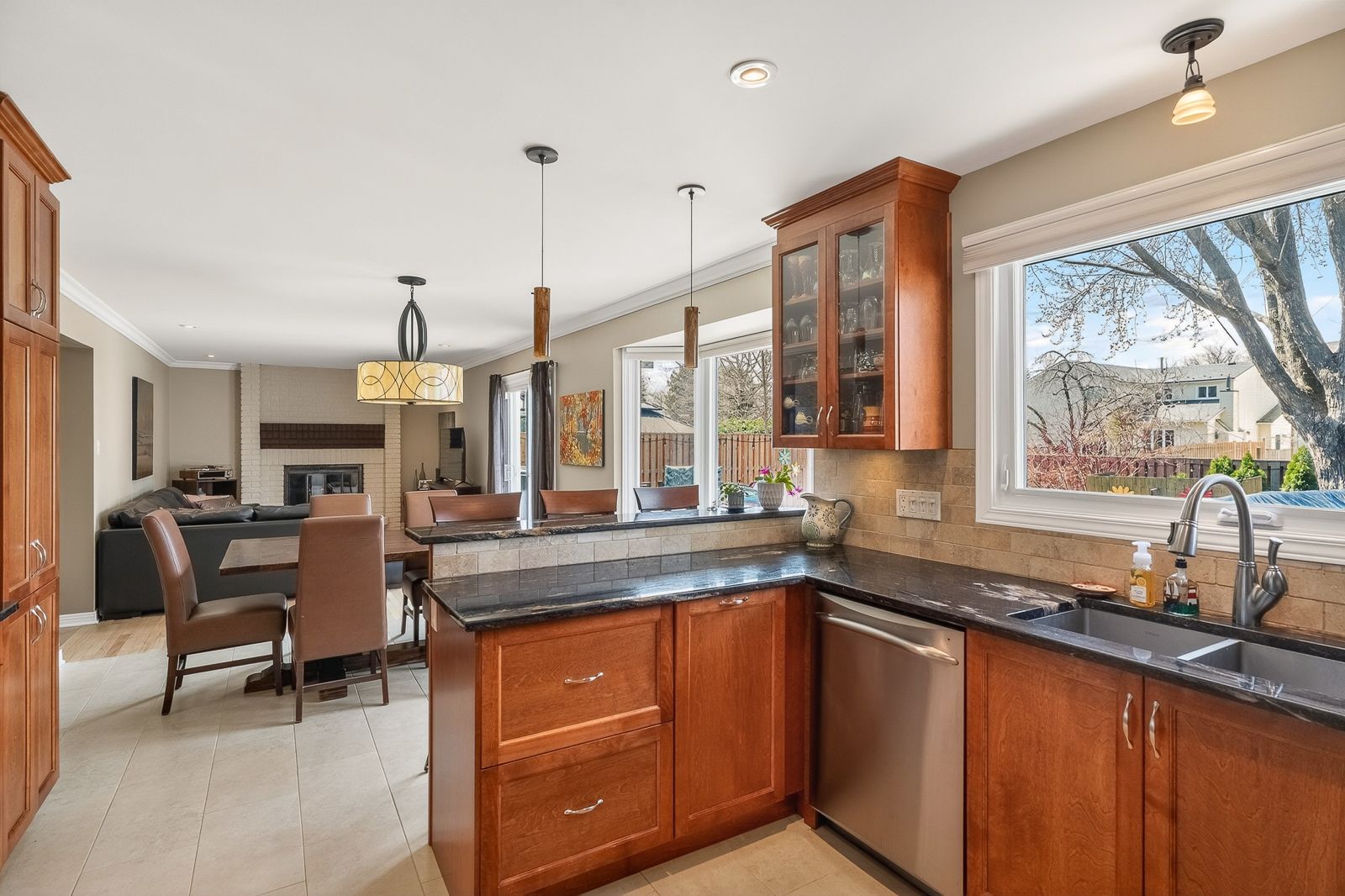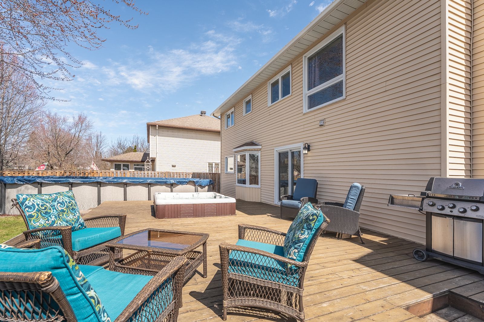 853 acadian gardens is a beautifully maintained and updated 2 storey, 4 bedroom single detached home, nestled on a quiet, local traffic only, mature tree lined crescent, backing onto parkland just steps away from the ottawa river pathway, perfect for cycling, walking, and cross-country skiing. Enjoy this practical floor plan perfect for both entertaining and everyday family living, featuring an enclosed front foyer, a custom hickory staircase and railings, formal living and dining rooms with natural finished oak floors, and a bright open concept kitchen/eating area/family room with patio doors leading to a spacious western red cedar deck. The renovated kitchen is designed for functionality, offering a breakfast bar, granite countertops, ceramic backsplash, and enhanced by pot and task lighting. The family room boasts a cozy wood burning fireplace, and the main level also includes a powder room and a laundry room/mudroom with inside access to the double attached garage. Upstairs, you'll find four generously sized bedrooms, with the primary suite featuring a wood burning fireplace, walk-in closet, and a renovated 3-piece ensuite. Three sun-filled bedrooms with hickory wood flooring throughout and a 4 piece bathroom round out the upper level. The finished lower level offers a massive recreation room with high ceilings, gym space, and a relaxing entertainment zone, as well as a large unfinished utility room with ample shelving. Step outside to your southwest facing backyard summer oasis, complete with expansive decking, hot tub, heated above ground pool and shed, fully enclosed by a stunning wood privacy fence with a rich, natural cedar tone. The home features additional updates including crown mouldings, pot lighting, modernized closet doors, and has been freshly painted in tasteful earth tones. With easy access to highway 174, amenities, reputable schools, parks, and the future lrt, this premium location offers both convenience and lifestyle - welcome home!