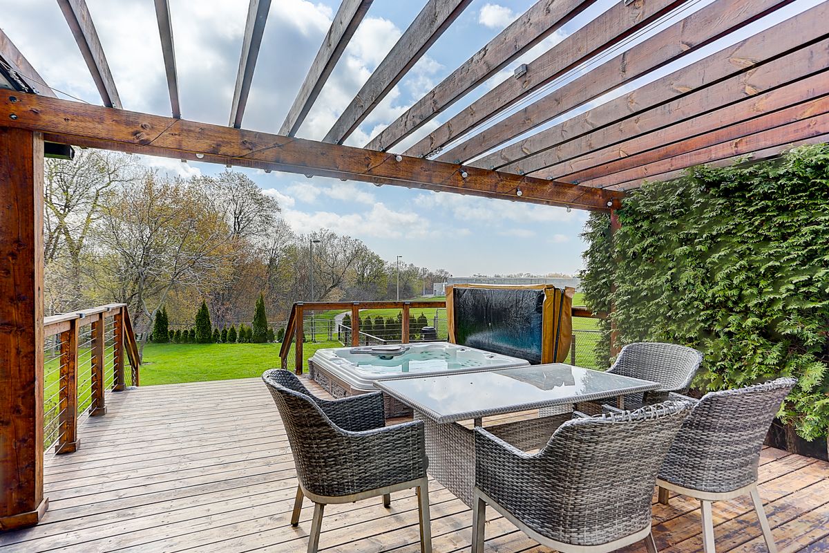 • Private backyard oasis with a deck and hot tub, perfect for relaxation.