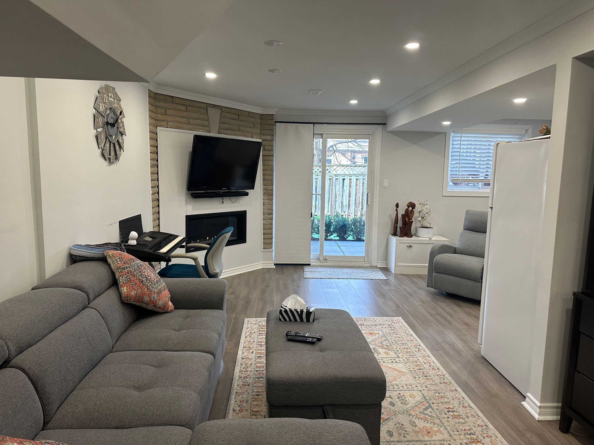 Outstanding lease opportunity in the gorham-college manor community of newmarket, located at the intersection of mulock & college manor. This bright and spacious one-bedroom walk-out basement suite offers full private use of the entire basement and has been freshly and beautifully renovated throughout. Designed with a highly functional open-concept layout, the suite features a modern kitchen and living area with a cozy fireplace, abundant natural light, and direct walk-out access to the outdoors, creating an airy and welcoming atmosphere. Includes in-suite laundry and one parking space. Ideally suited for one professional tenant. Tenant to pay one-third of utilities.