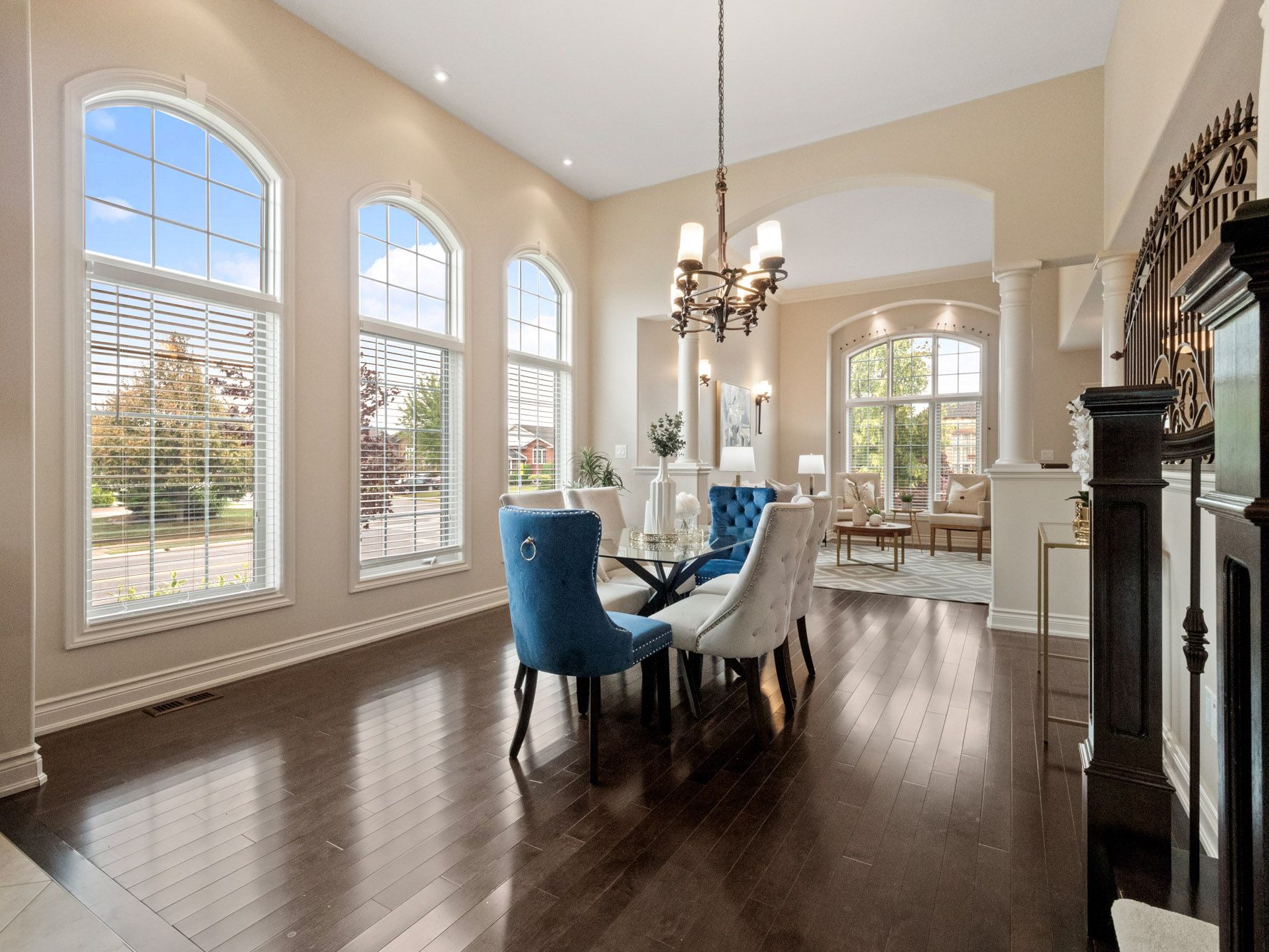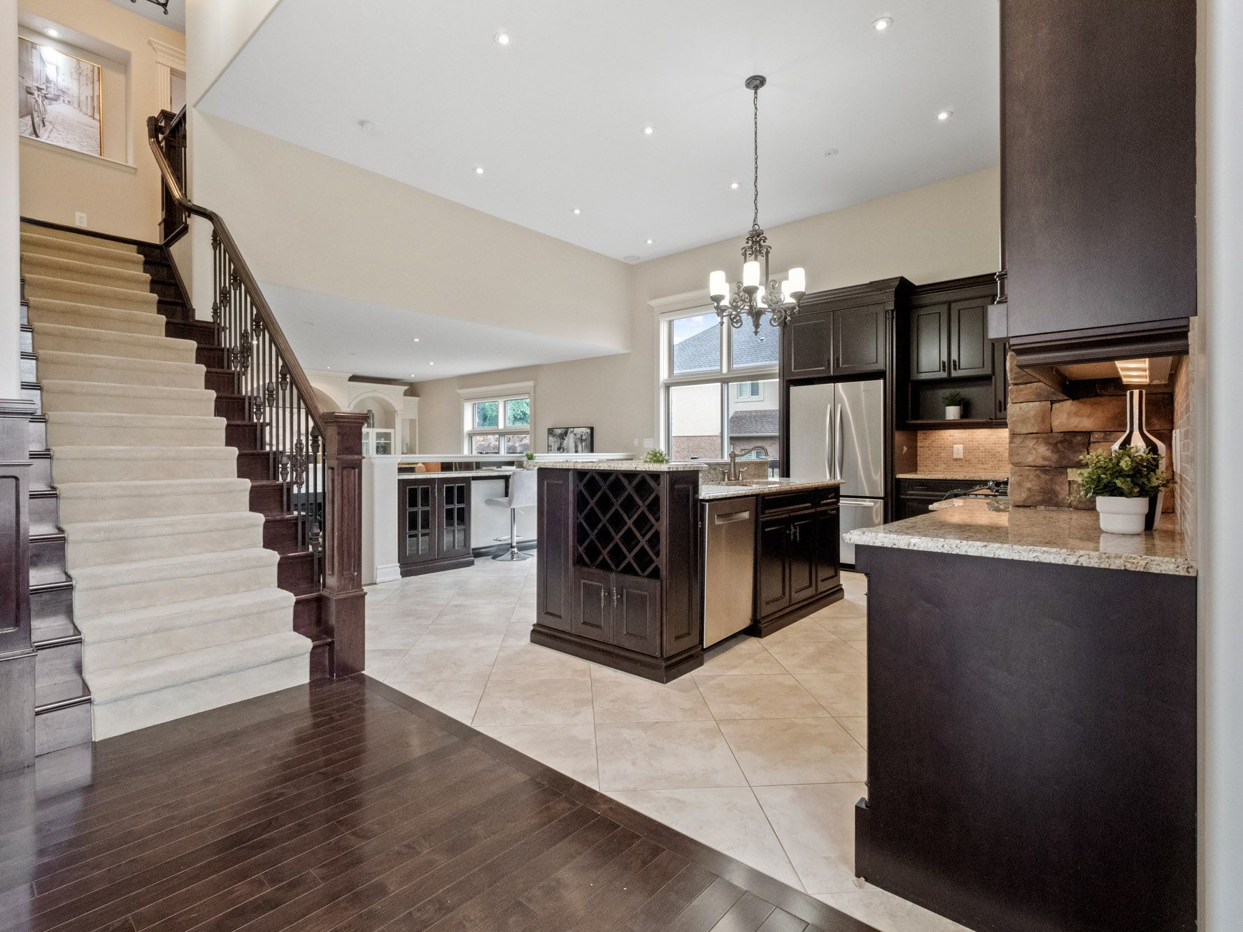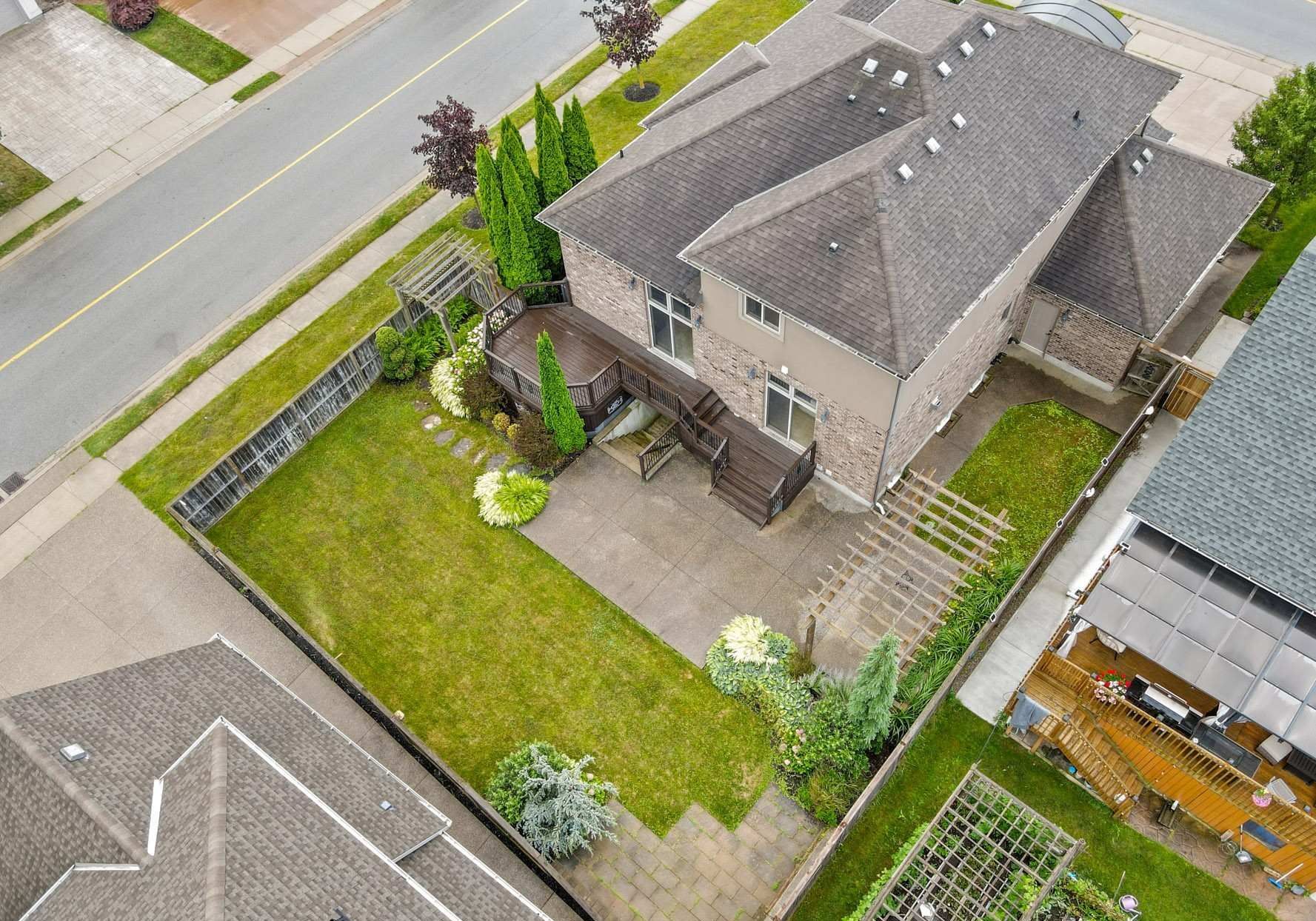 Model-home luxury with soaring 12-foot ceilings! Experience the elegance of a true model home featuring dramatic 12-ft ceilings in the living, dining & kitchen areas, creating an impressive sense of space and light. Situated on a premium corner lot in a sought-after neighbourhood with a school just steps away this custom-built home offers approx. 3,775 sq. Ft. Of beautifully finished living space. Highlights include hardwood floors, exquisite trim, arched windows, and wrought-iron railings. The old-world inspired chef's kitchen showcases a gas range set in a striking stone alcove, custom maple cabinetry, granite counters, soft-close drawers, wine rack, and a large island with breakfast bar. Enjoy seamless indoor-outdoor living with patio doors leading to a 2-tier deck (gas bbq line), concrete patio, and pergola. The great room features a built-in entertainment centre with integrated speakers. The primary suite offers 2 separate 4-pc ensuites and dual walk-in closets. Two additional bedrooms share a hollywood bath. The finished lower level includes a wet bar with waterfall feature, rec room with walk-up, home gym, and 5th bath. Heated 3-car garage with stamped concrete floors, irrigation system & central vacuum complete this exceptional home. Some photos are from previous listing, seller and listing brokerage make no representations or warranties regarding retrofit status of property.