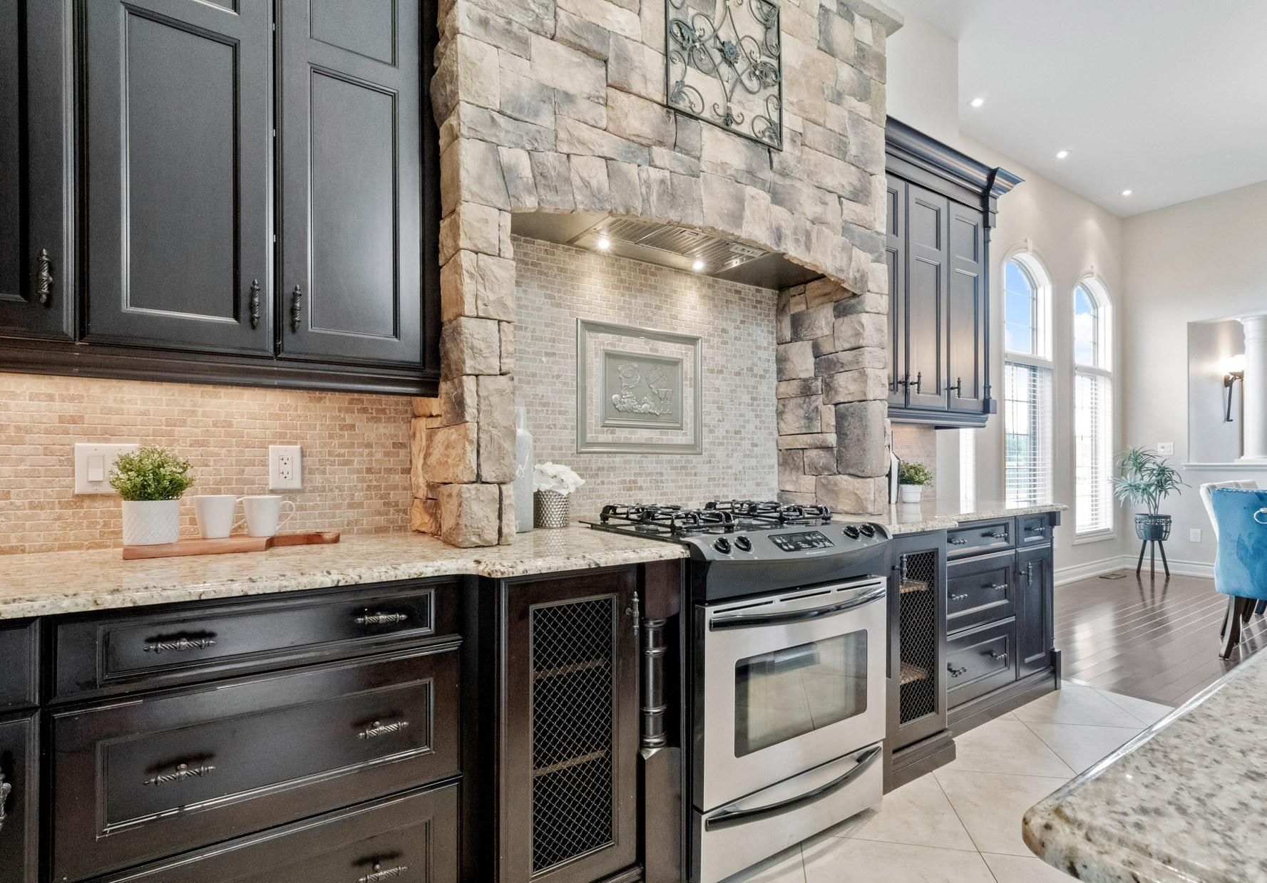 • Chef's Kitchen features granite counters, gas range, and custom cabinetry.
