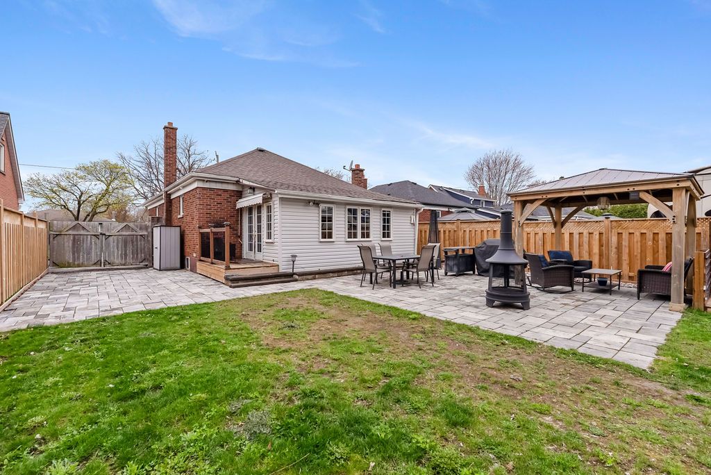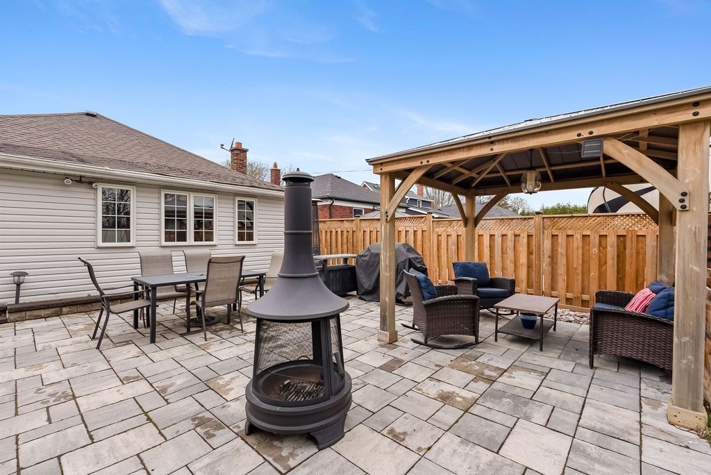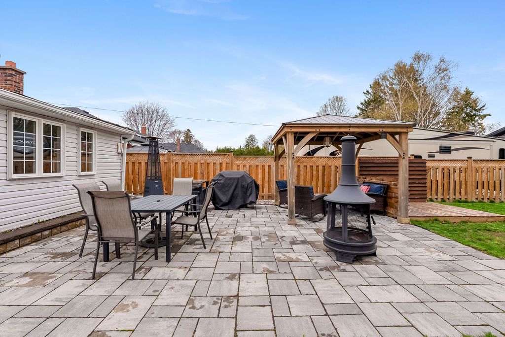 • Fully fenced backyard with patio and gazebo for outdoor enjoyment.