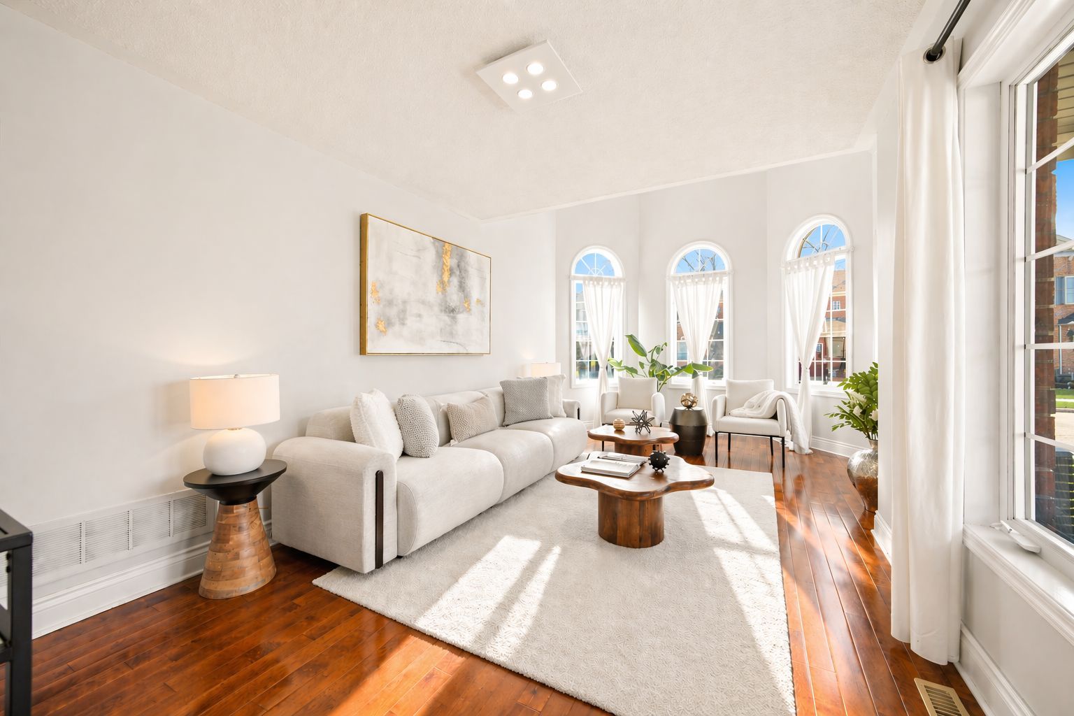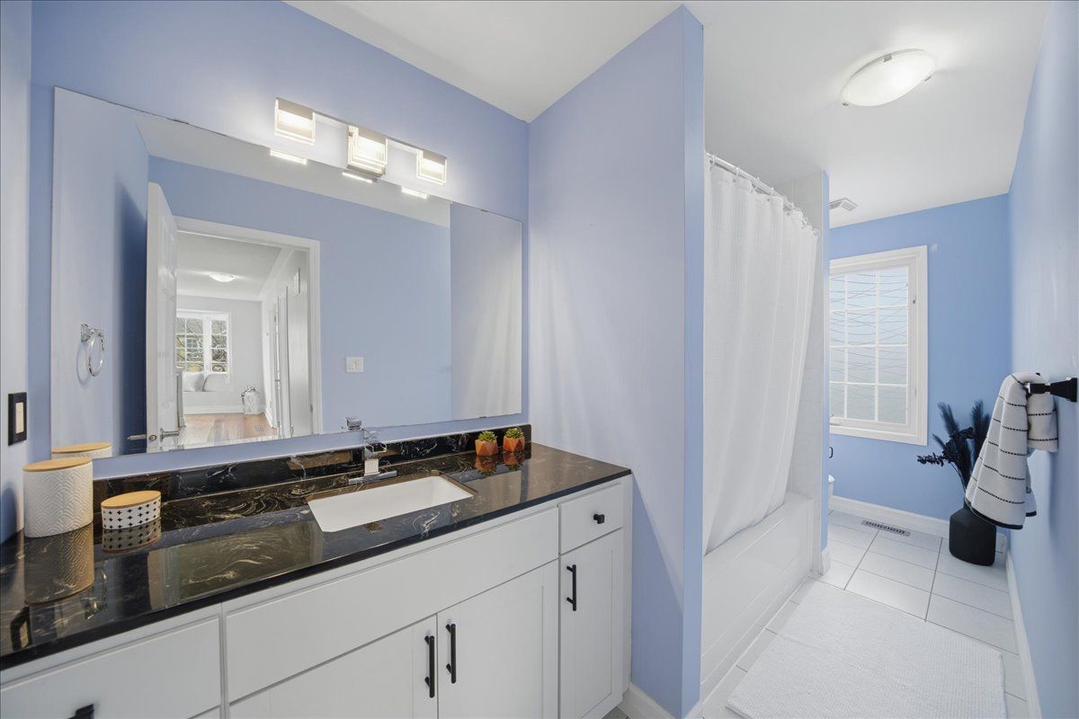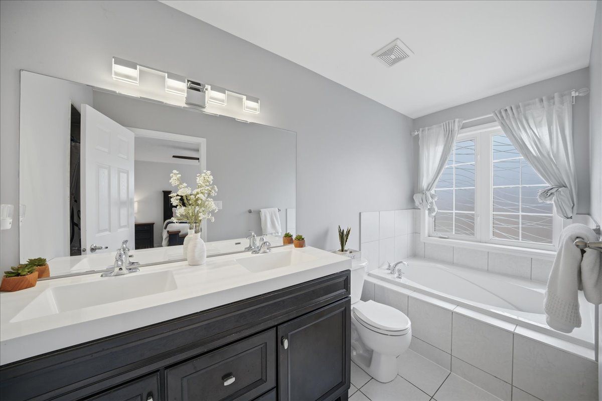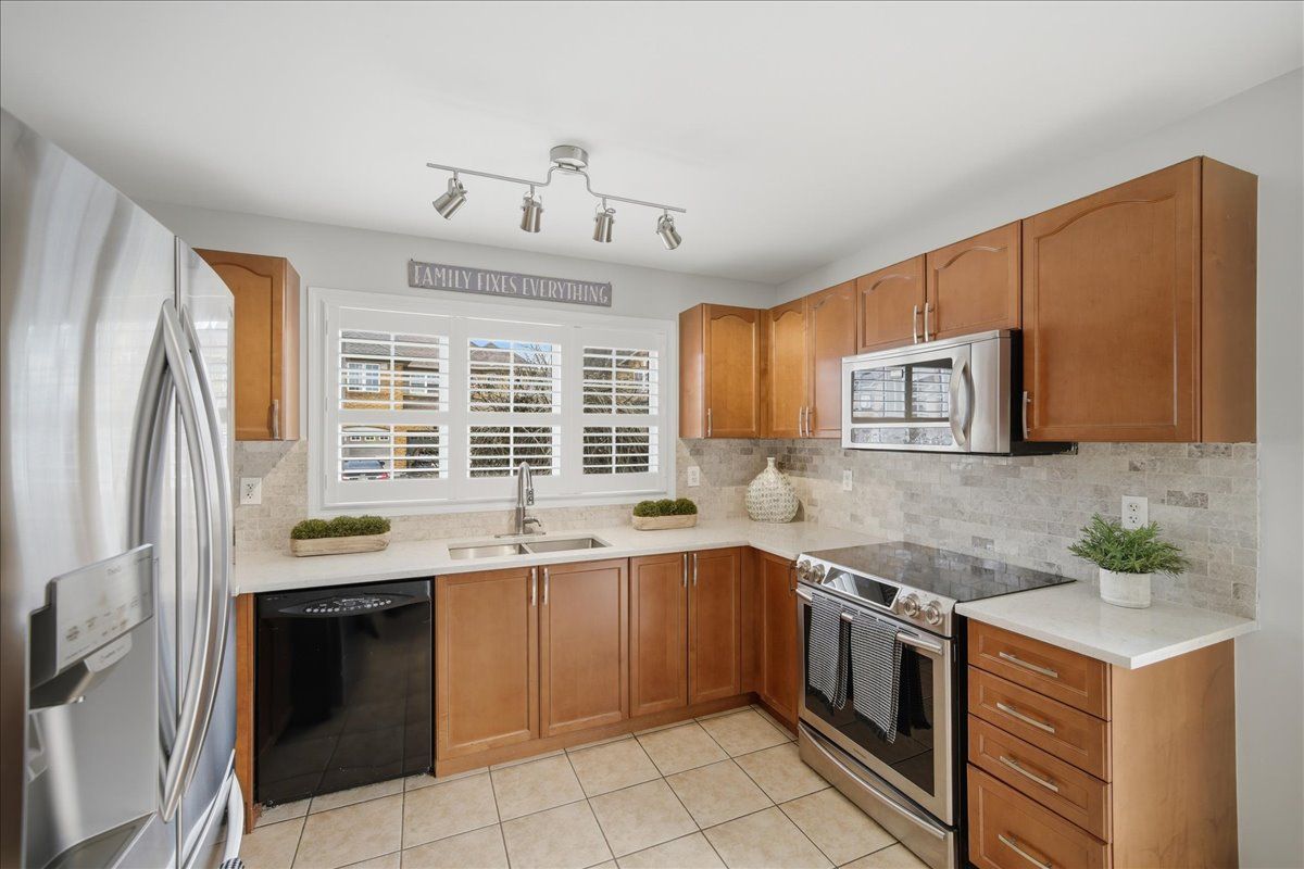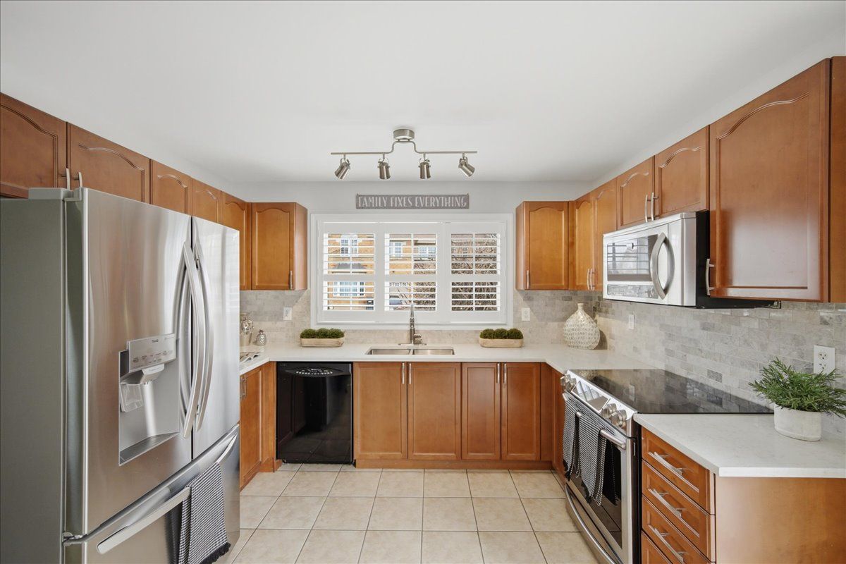 • Bright kitchen includes quartz countertops and stainless steel appliances.