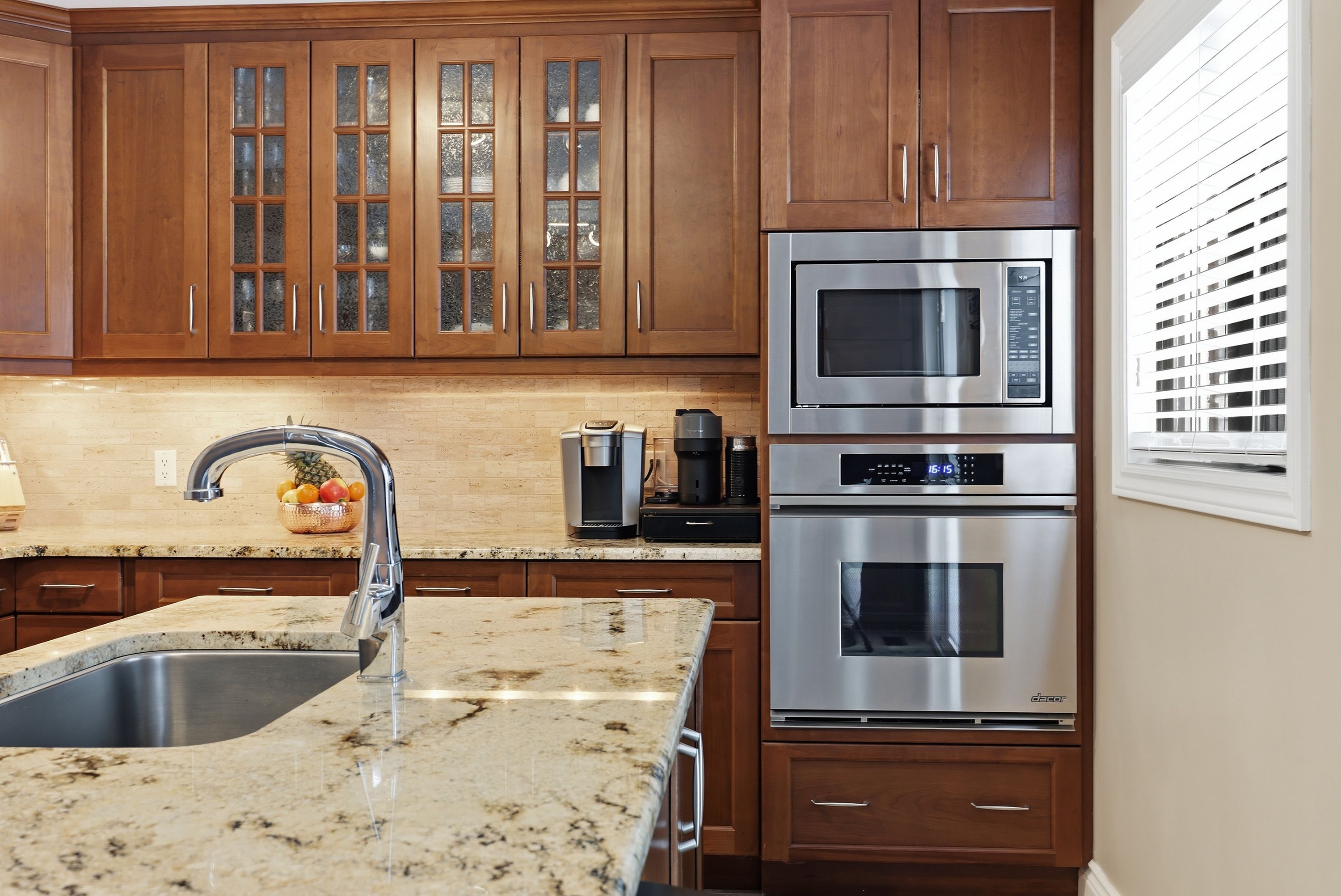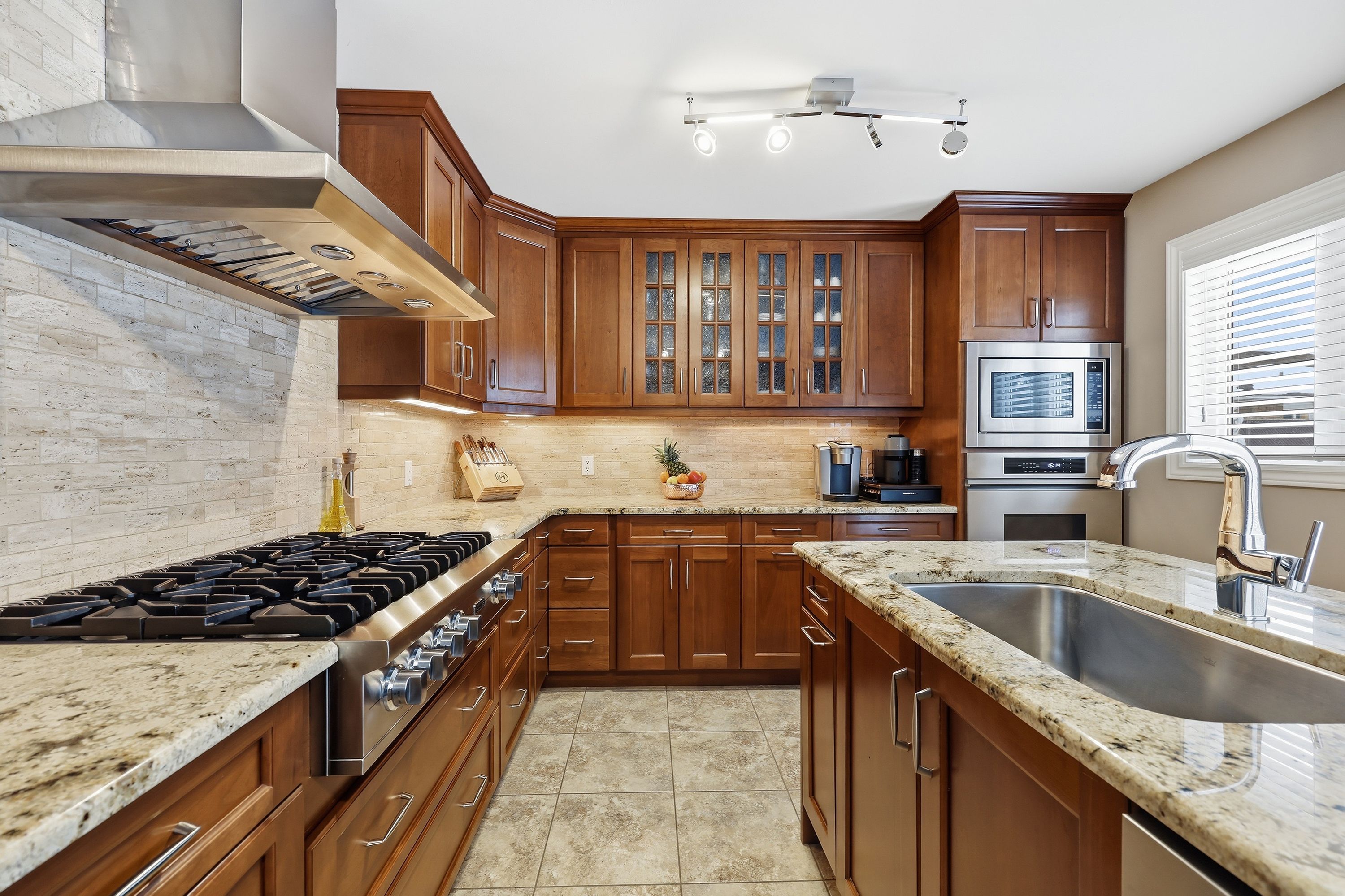 • Custom kitchen with stainless steel appliances and granite countertops.