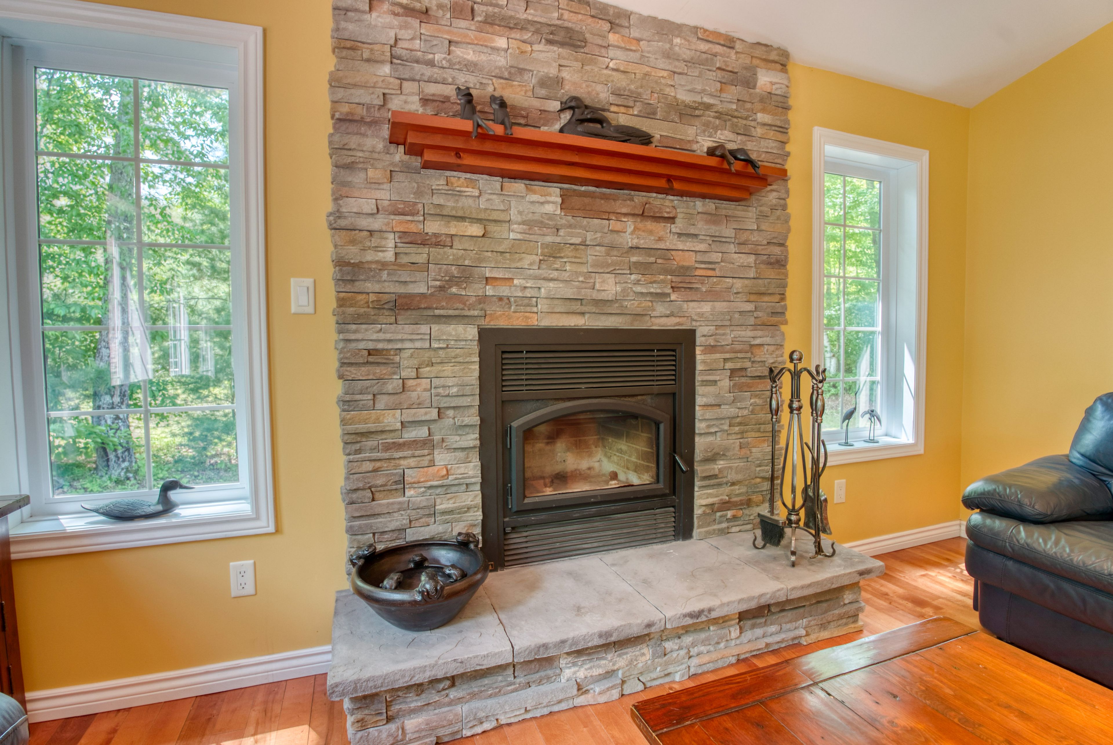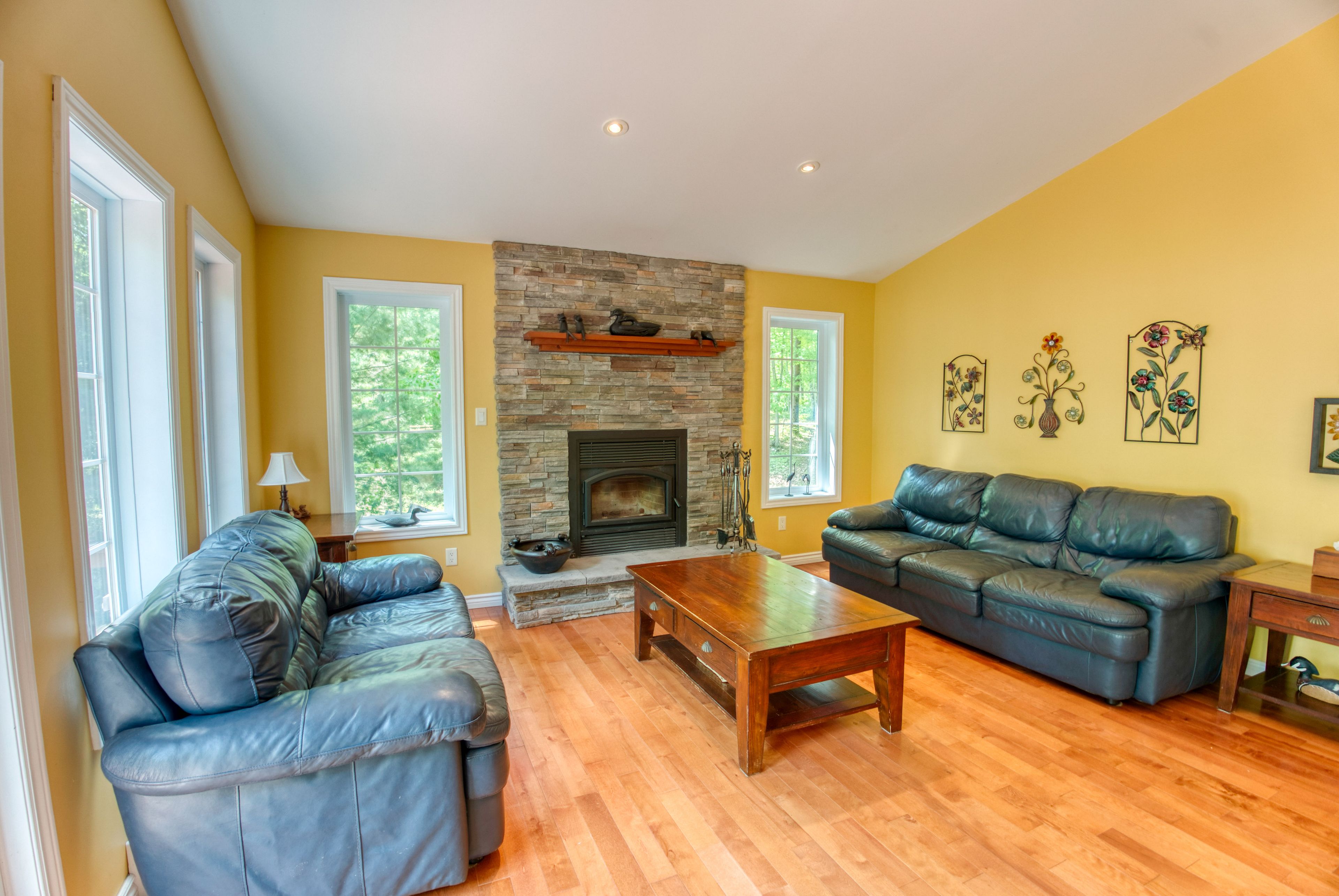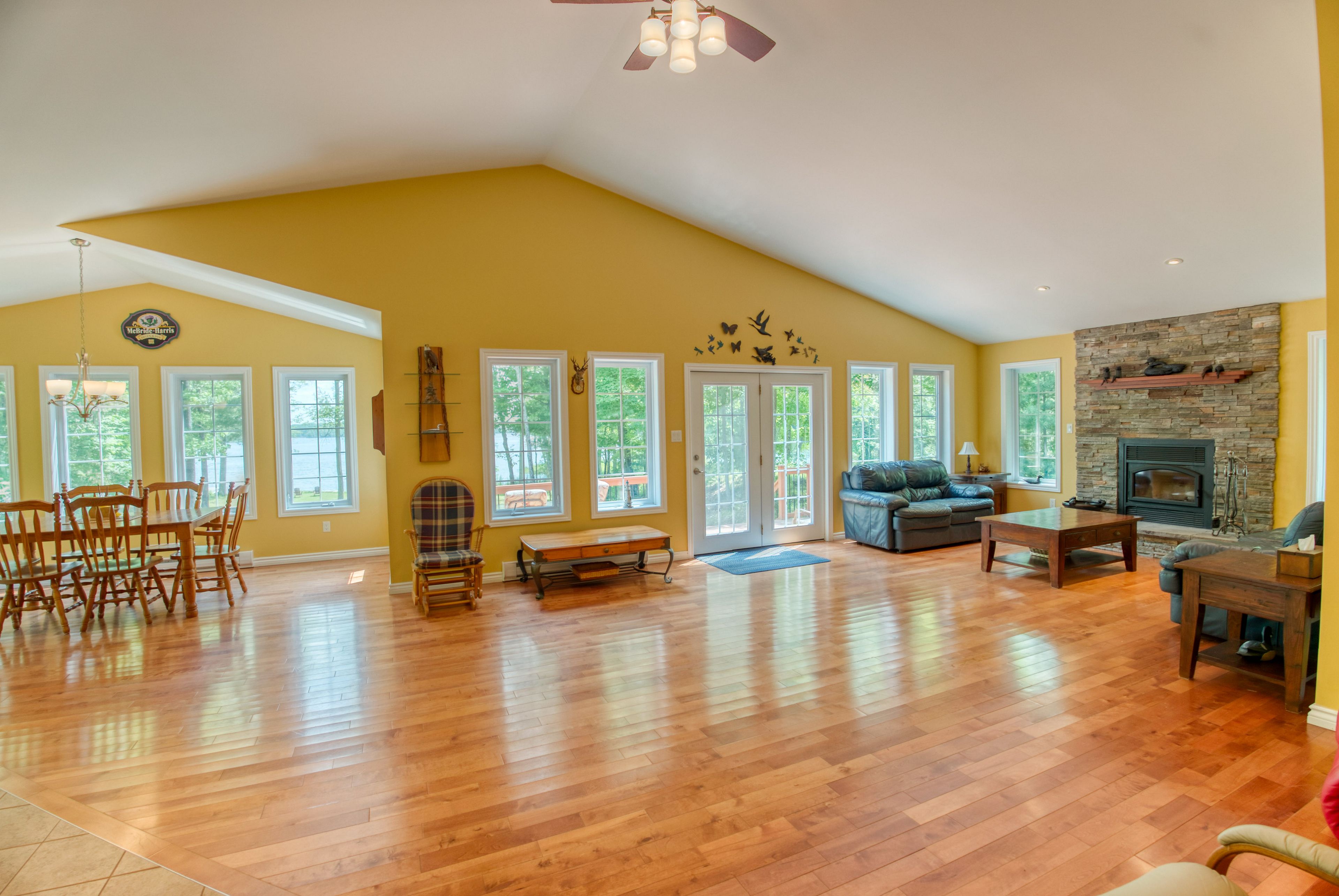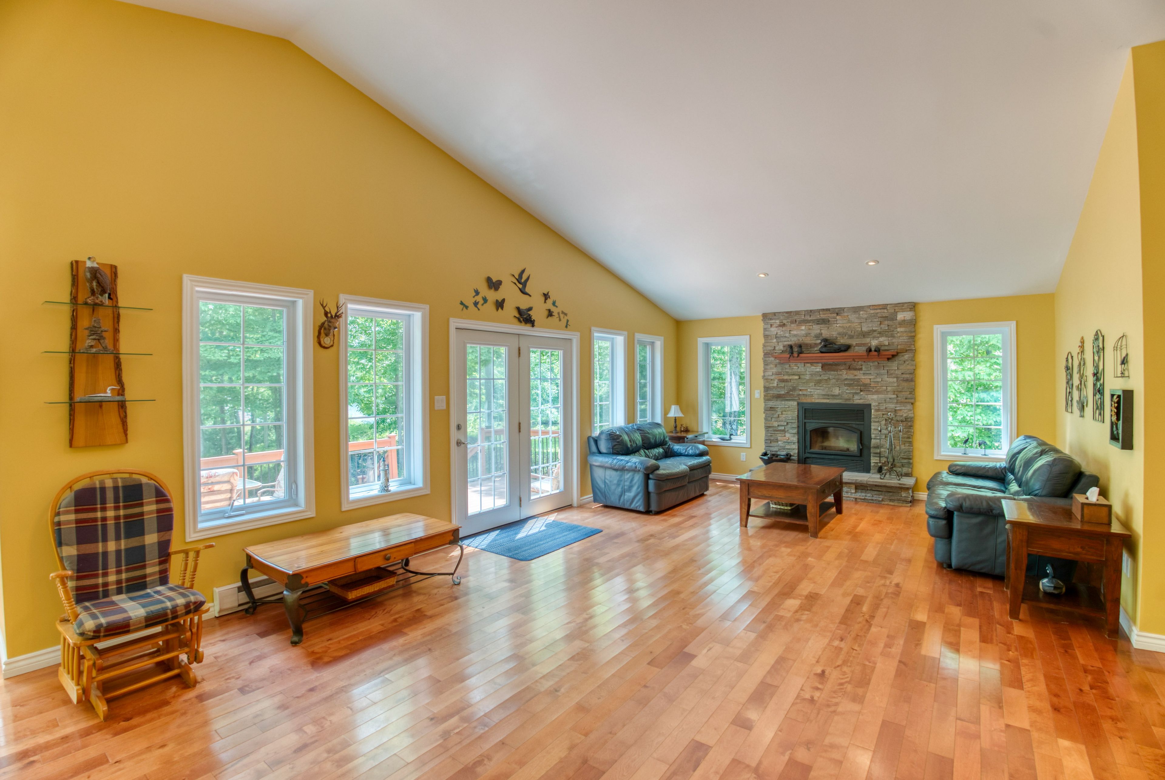 • Spacious open-concept design with vaulted ceilings and custom fireplace.
