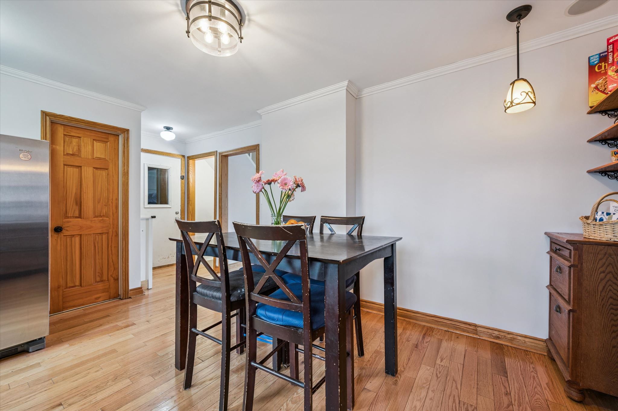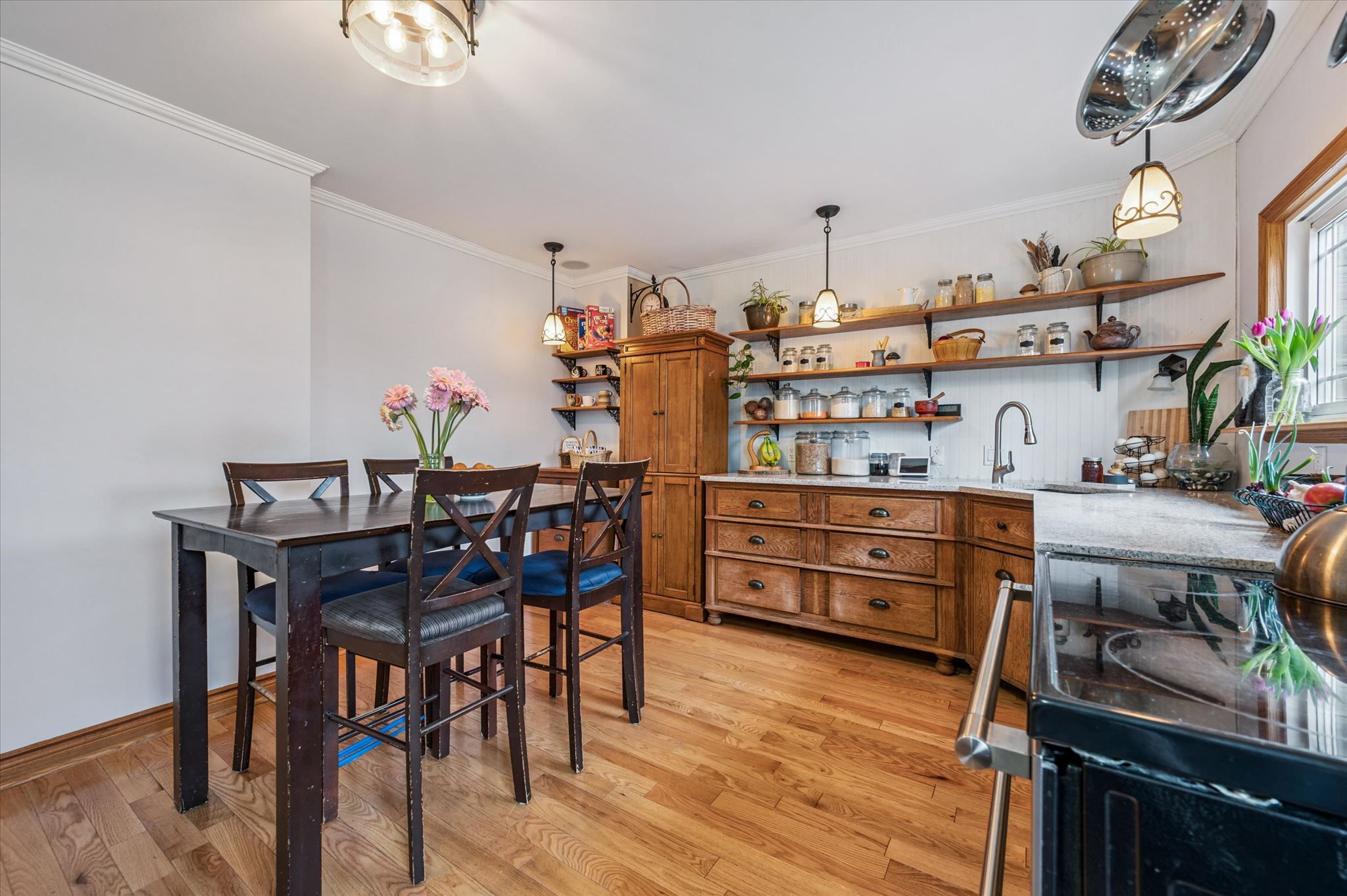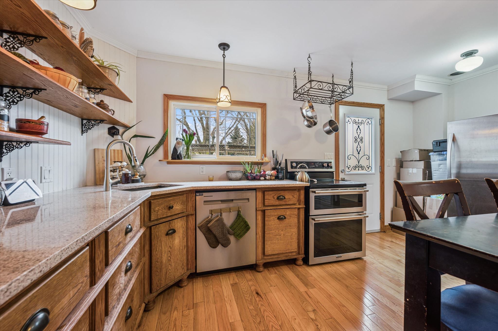 • Updated kitchen with custom cabinetry and open shelving for functionality.