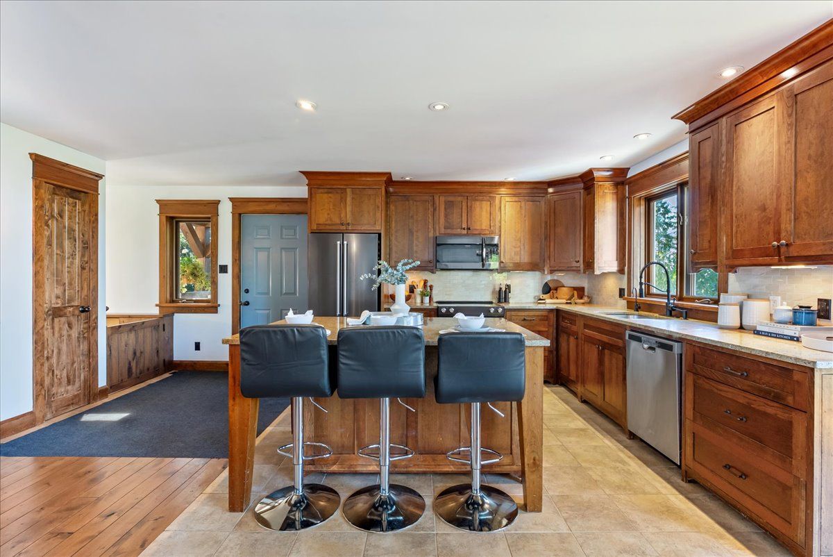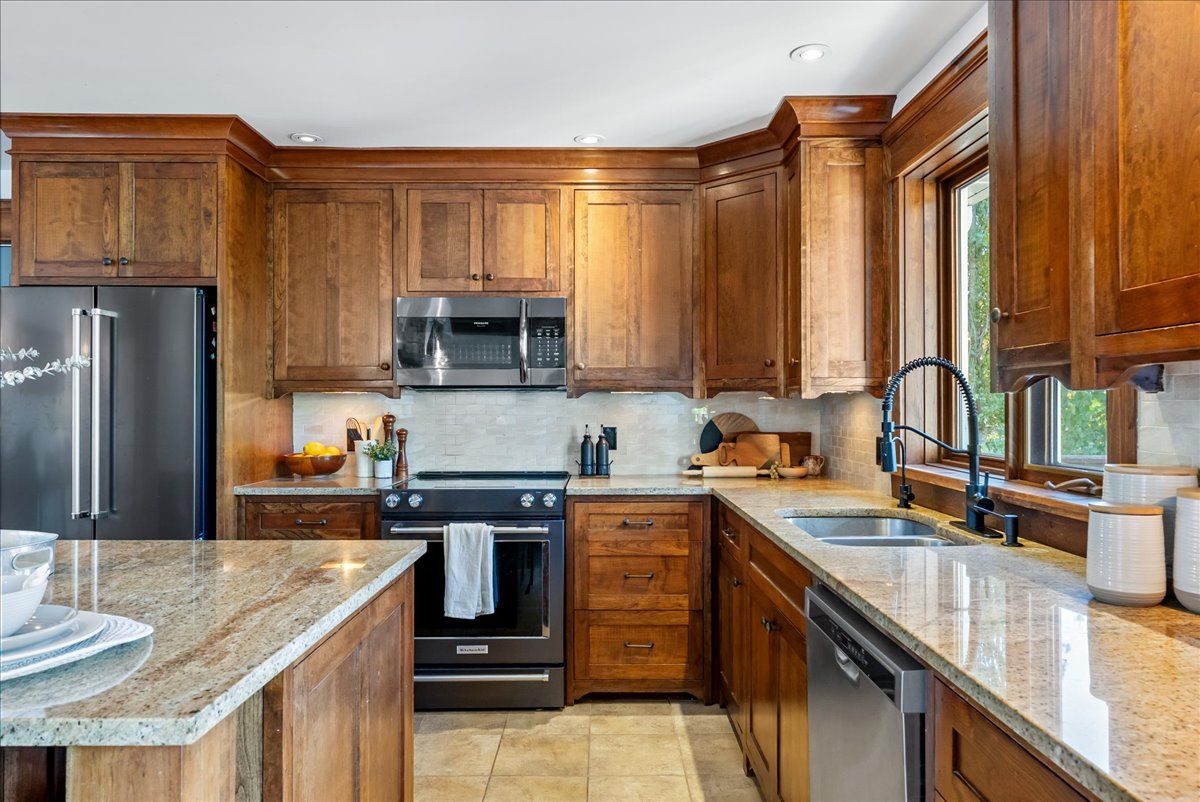 • Custom kitchen with quartz counters and built-in bar for entertaining.