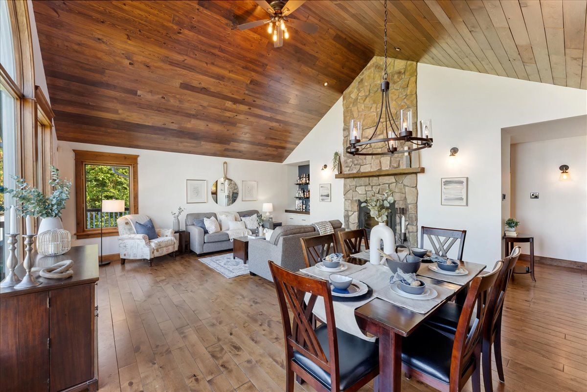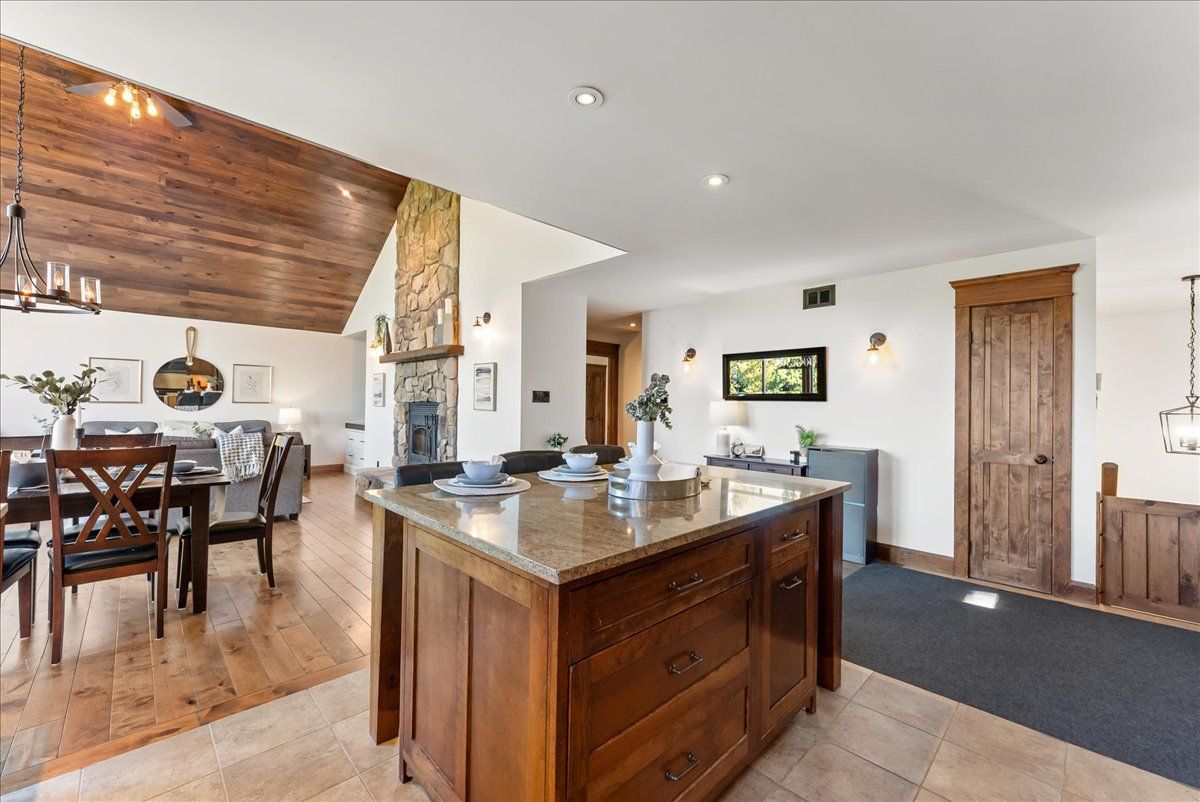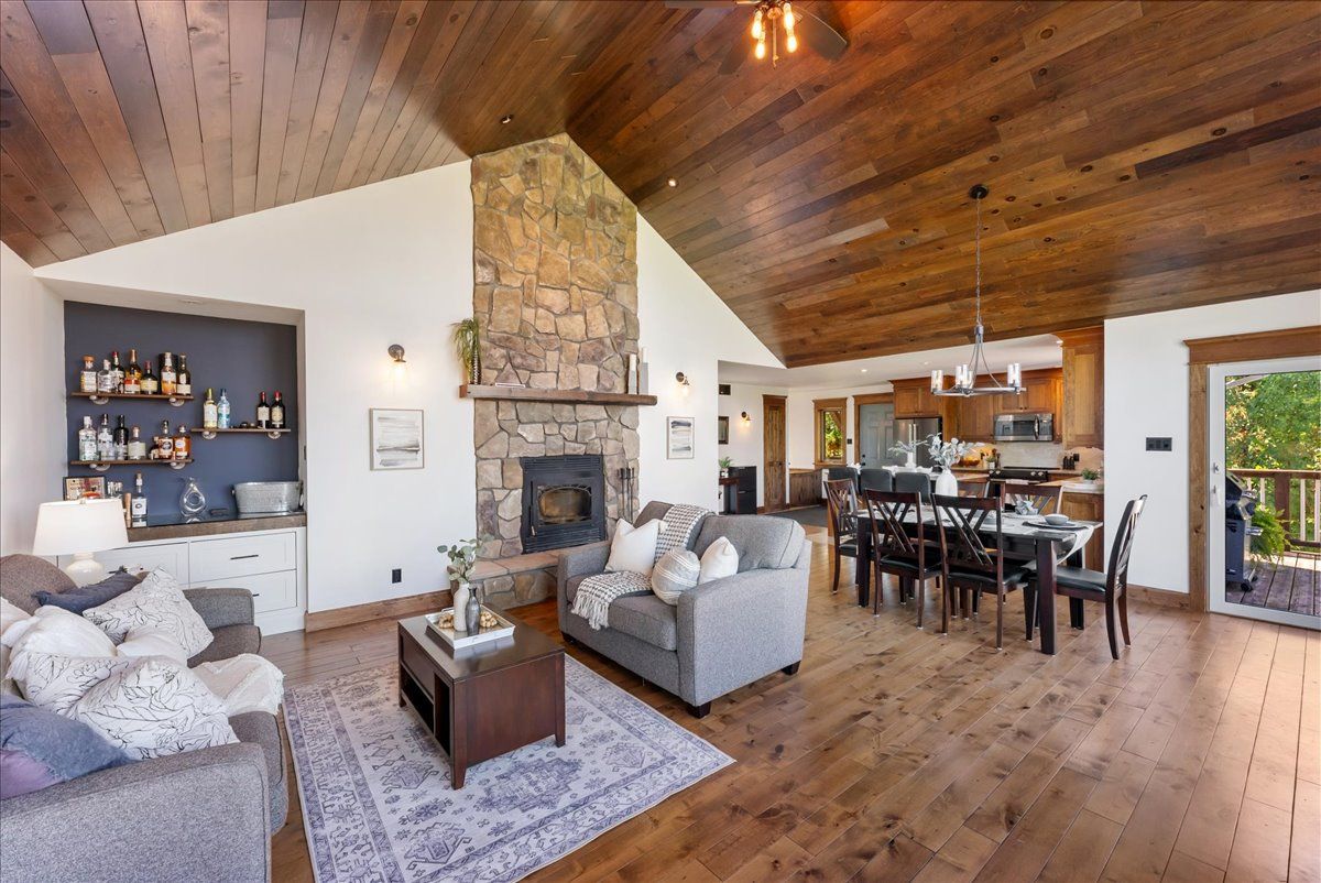 • Open-concept layout with vaulted ceilings and a striking stone fireplace.