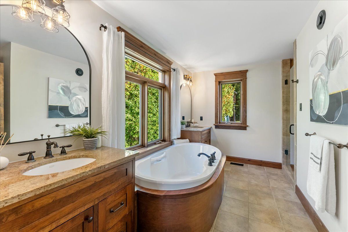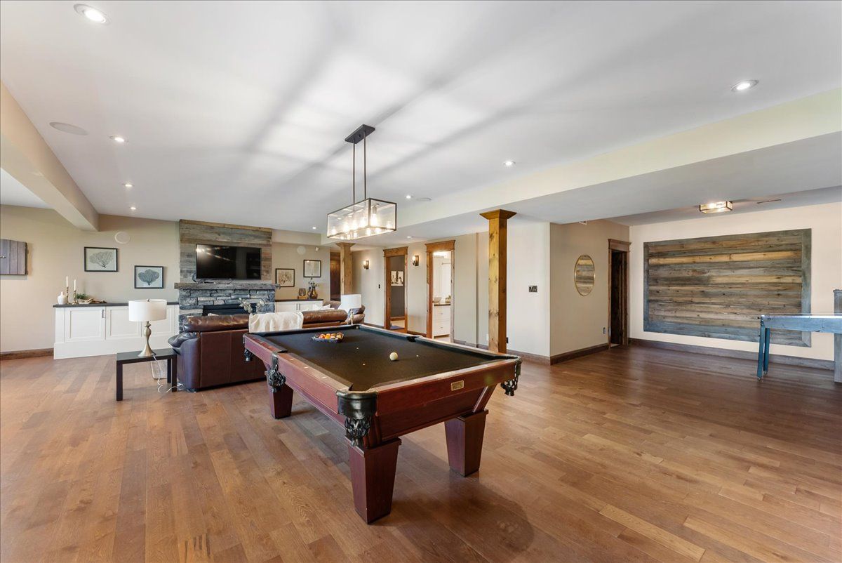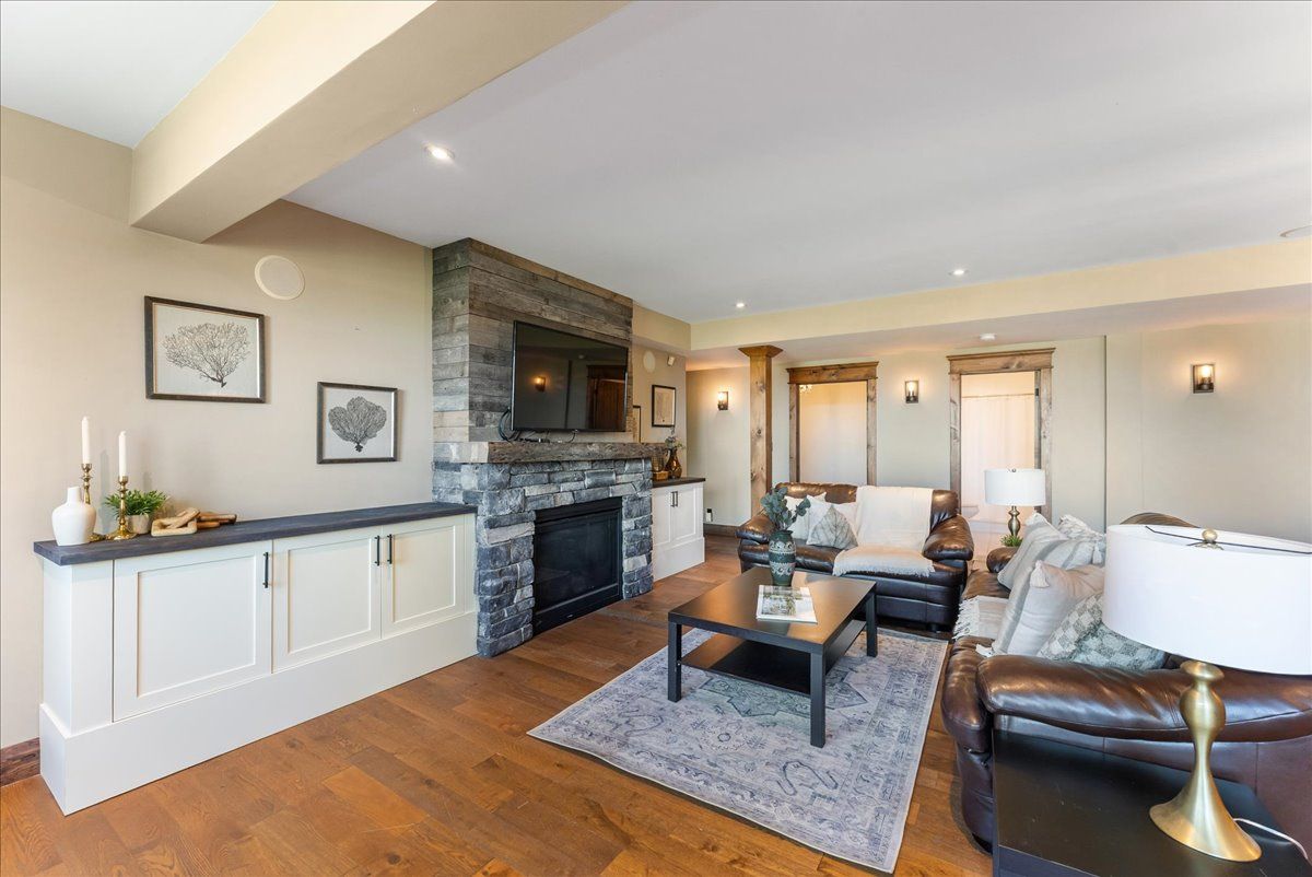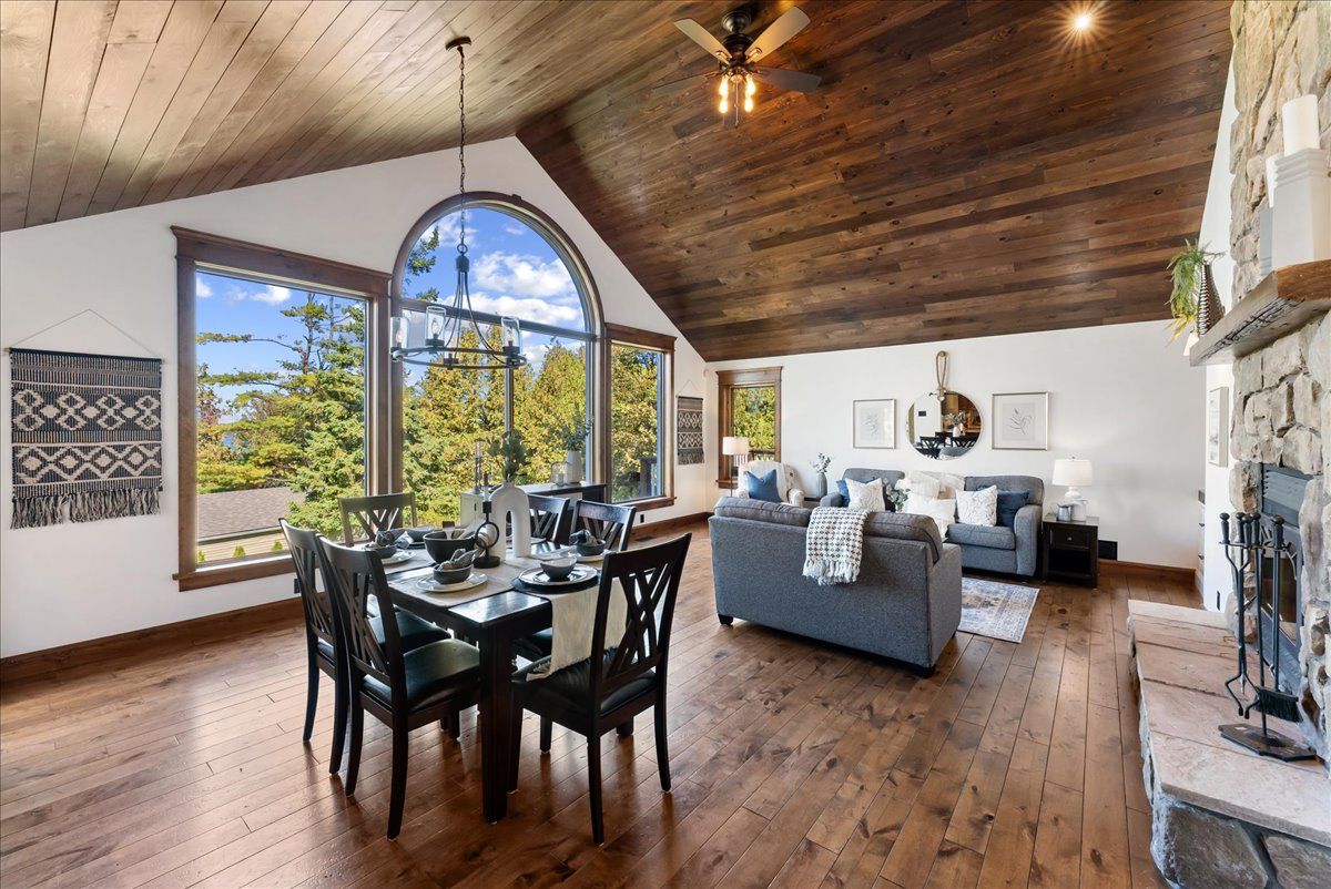 • Open-concept layout with vaulted ceilings and a striking stone fireplace.