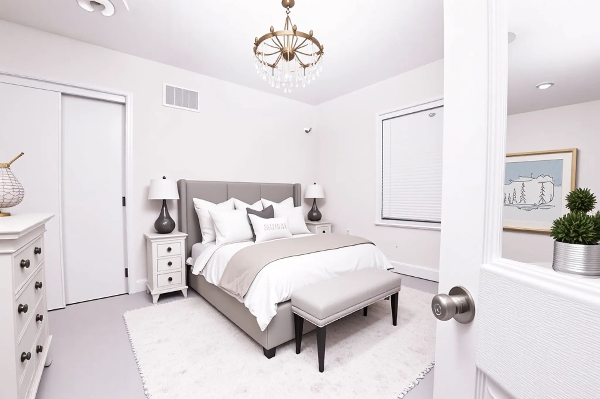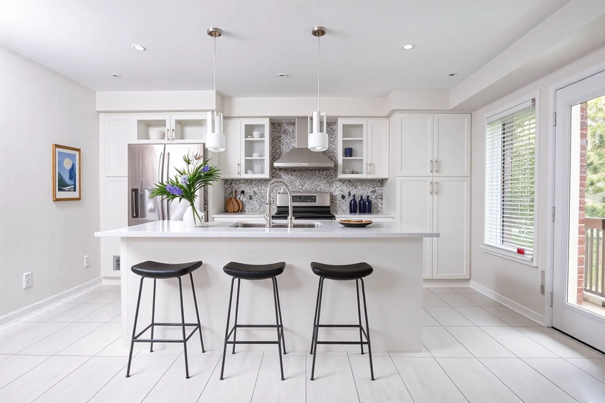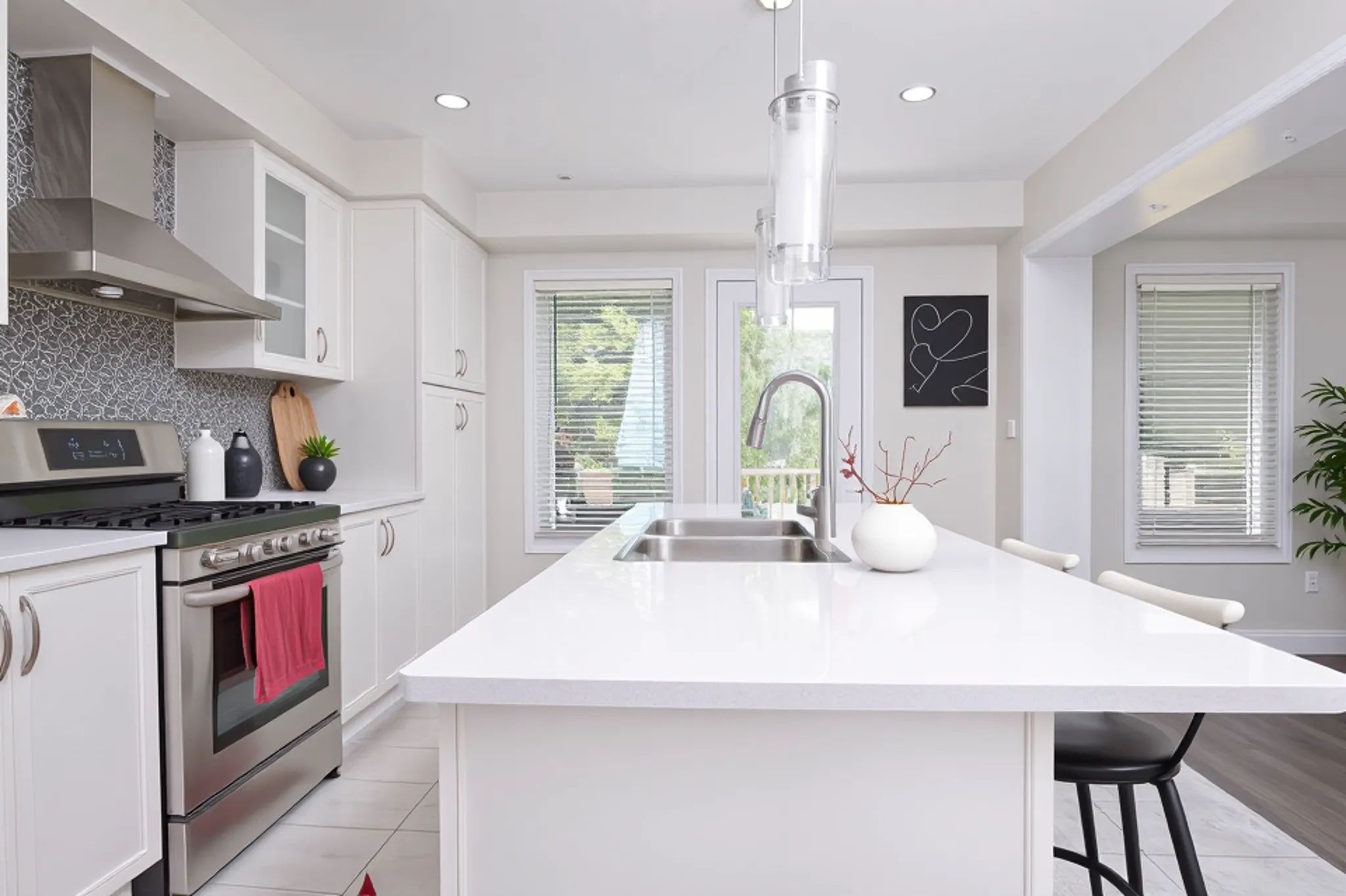 • Bright, modern kitchen with quartz counters and oversized island for entertaining.