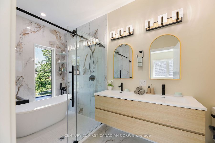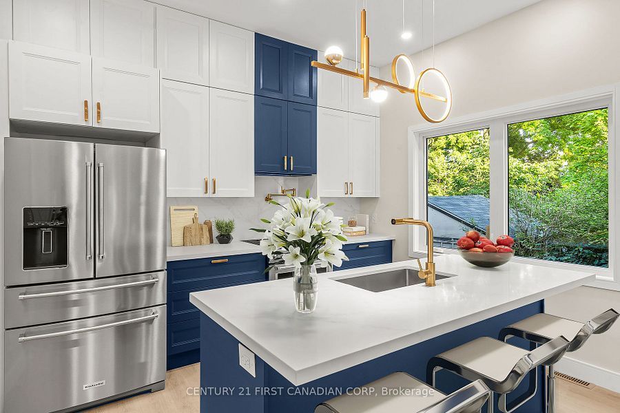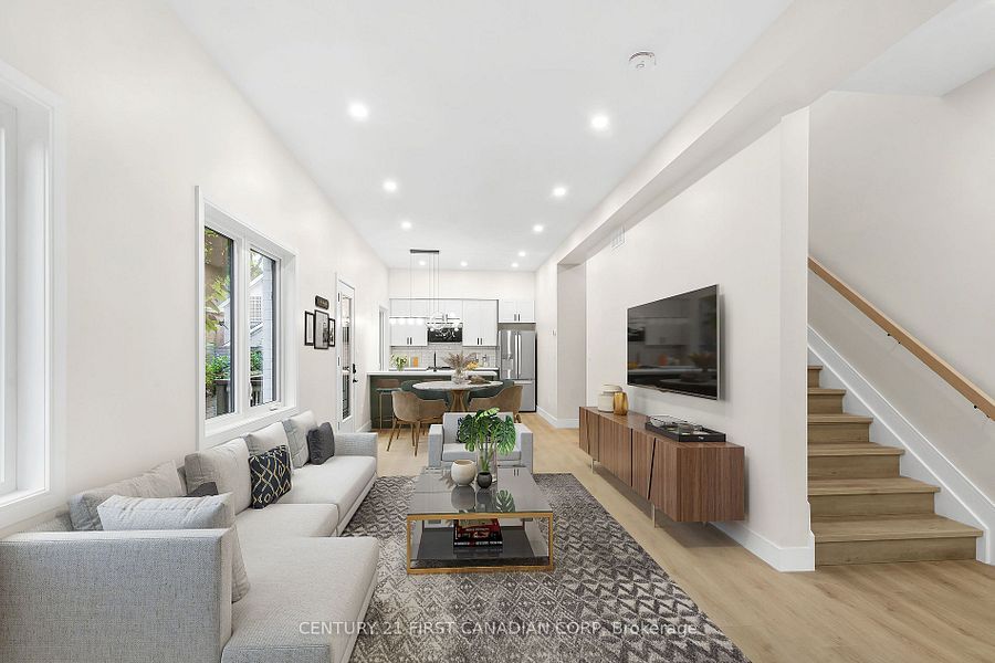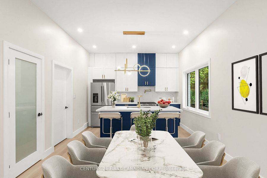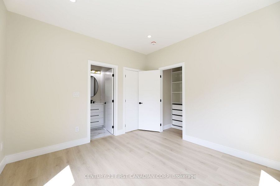 An exquisite, new home in prestigious old north with unparalleled materials and artistry. This masterpiece boasts 5000 sqft of thoughtful, custom-designed living, perfect for a single family, multi-generational family, and executive lease income potential. The elegant stone and brick exterior hints at the exceptional quality within. The grand entrance welcomes you to sun-filled space, 10-foot ceilings and walls of windows creating an immediate sense of openness and light enhanced by 4 skylights bathing the home in sunshine. The custom open-riser maple staircase with maple-slat wall, opposite the gas fireplace set into a stone media wall, speak to the craftsmanship and care in every detail of this residence. The home features two connected but also distinct, complementary wings - main wing and guest wing - offering self-contained, separate entrances, luxurious living spaces with 2 gourmet kitchens, open-concept living room, family room and dining areas. Bask in 2 primary ensuites among 5 bedrooms, 6 baths, and 2 laundries on the upper levels of the home. Two fully finished basements add 3 bedrooms, 2 baths, a media room and a gym (both versatile). Nestled on an expansive 350-ft deep lot, picture summer gatherings under the trees with your private park-like yard. The property boasts a large back deck with built-in gas and water hookups overlooking your own private 'estate' with a fire pit surrounded by massive stone seats in addition to the stunning 30-foot wide cedar-walled balcony, accessible from both wings. The oversized 19ftx31ft garage with16ft high ceiling and 2 ev charging outlets ensures modern convenience, while the low maintenance metal roof guarantees durability. A luxurious, versatile home in one of london's most coveted neighborhoods. Minutes to excellent schools, western university and university hospital. Included* 2 sets of high-end appliances, 2 hvac systems, 2 on-demand water heaters, 2 /200amp panels, 2 sets of all meters. Photos virtually staged.