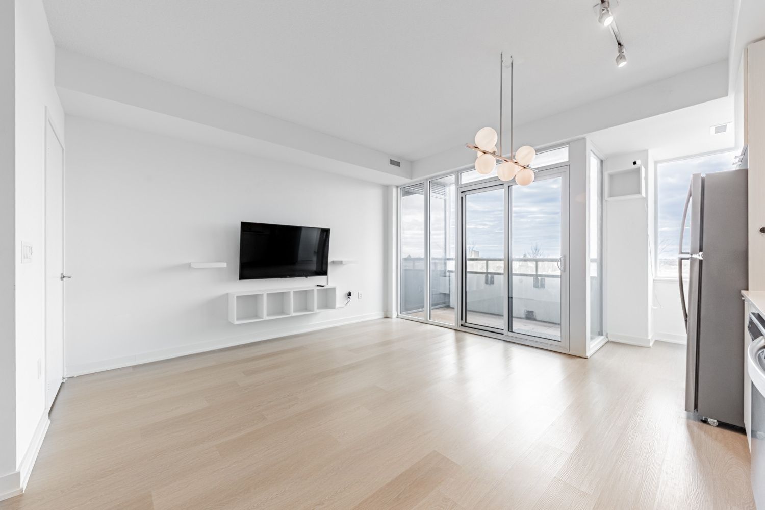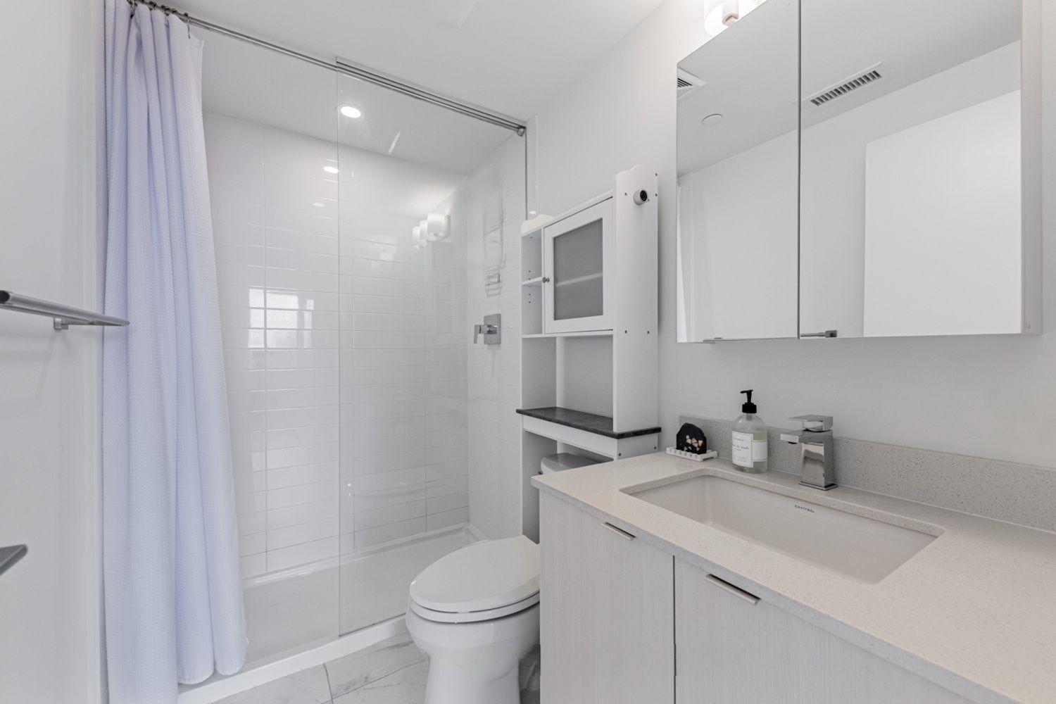 Boutique contemporary living at 859 west condos. This thoughtfully designed 1+1 bedroom, 2 bathroom suite offers approximately 692 sf of interior space plus a private balcony with unobstructed south-facing views of the toronto skyline and lake ontario. Sun-filled throughout the day, the layout is ideal for both everyday living and working from home. The versatile den easily functions as a home office or dining space, while two full bathrooms provide added privacy and flexibility. Nine-foot ceilings enhance the open feel, complemented by wide-plank flooring, sleek quartz countertops, and stainless steel appliances in a modern, neutral palette. Residents enjoy a full suite of upscale amenities including a fully equipped gym, yoga studio, lounge with designer kitchen and private dining area, media and games room with wet bar and billiards, children's play area, 24/7 concierge, and a beautifully landscaped courtyard with bbqs, outdoor cabanas, and lounge areas. Perfectly positioned in the heart of the queensway, this location offers exceptional convenience. Steps to grocery stores, cafes, restaurants, cineplex, tim hortons, starbucks, costco, and more. The waterfront is just minutes away, with quick access to ttc, mimico go station, the gardiner expressway, highway 427, sherway gardens, pearson airport, and downtown toronto. Includes one underground parking space and one locker.